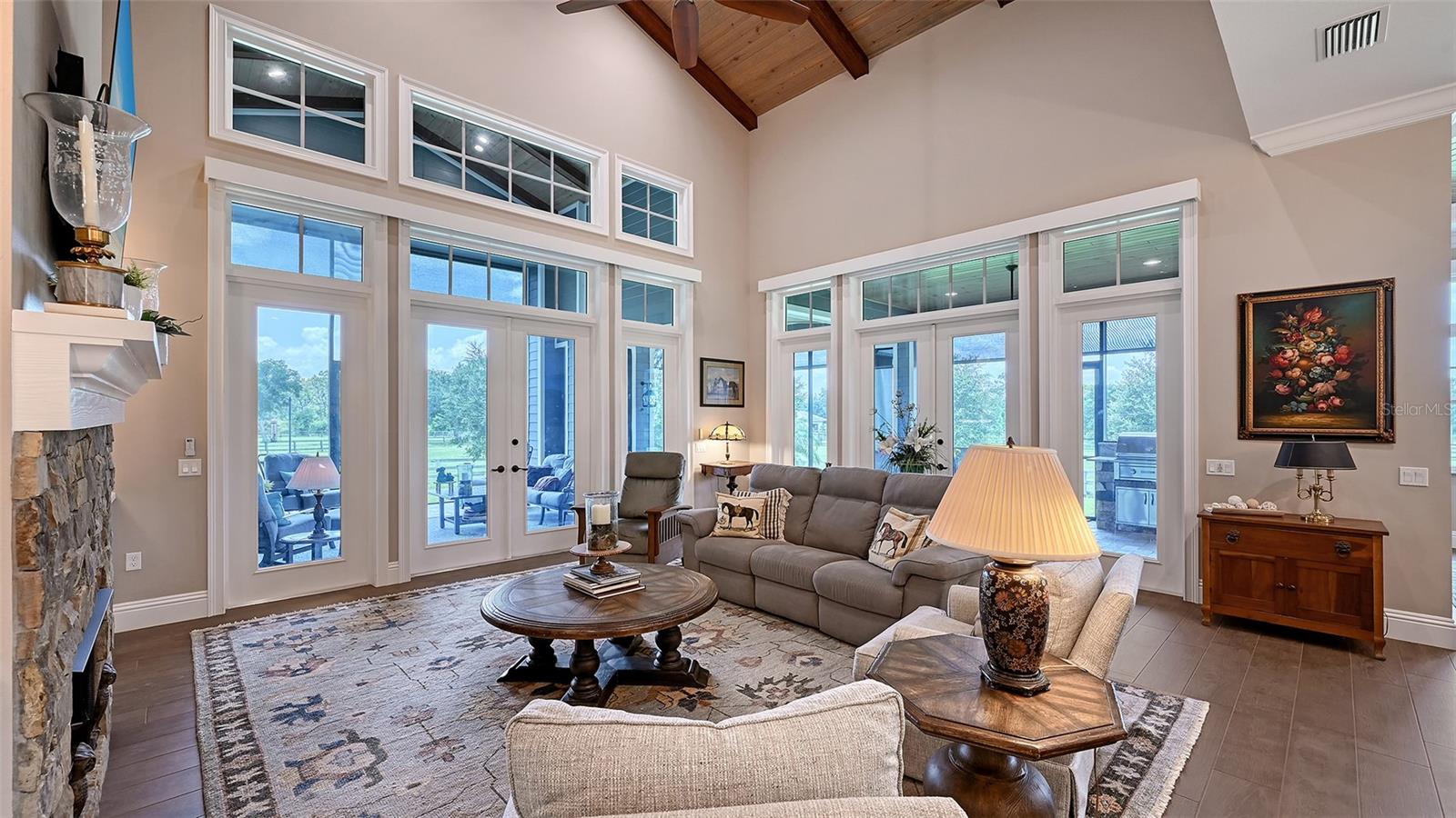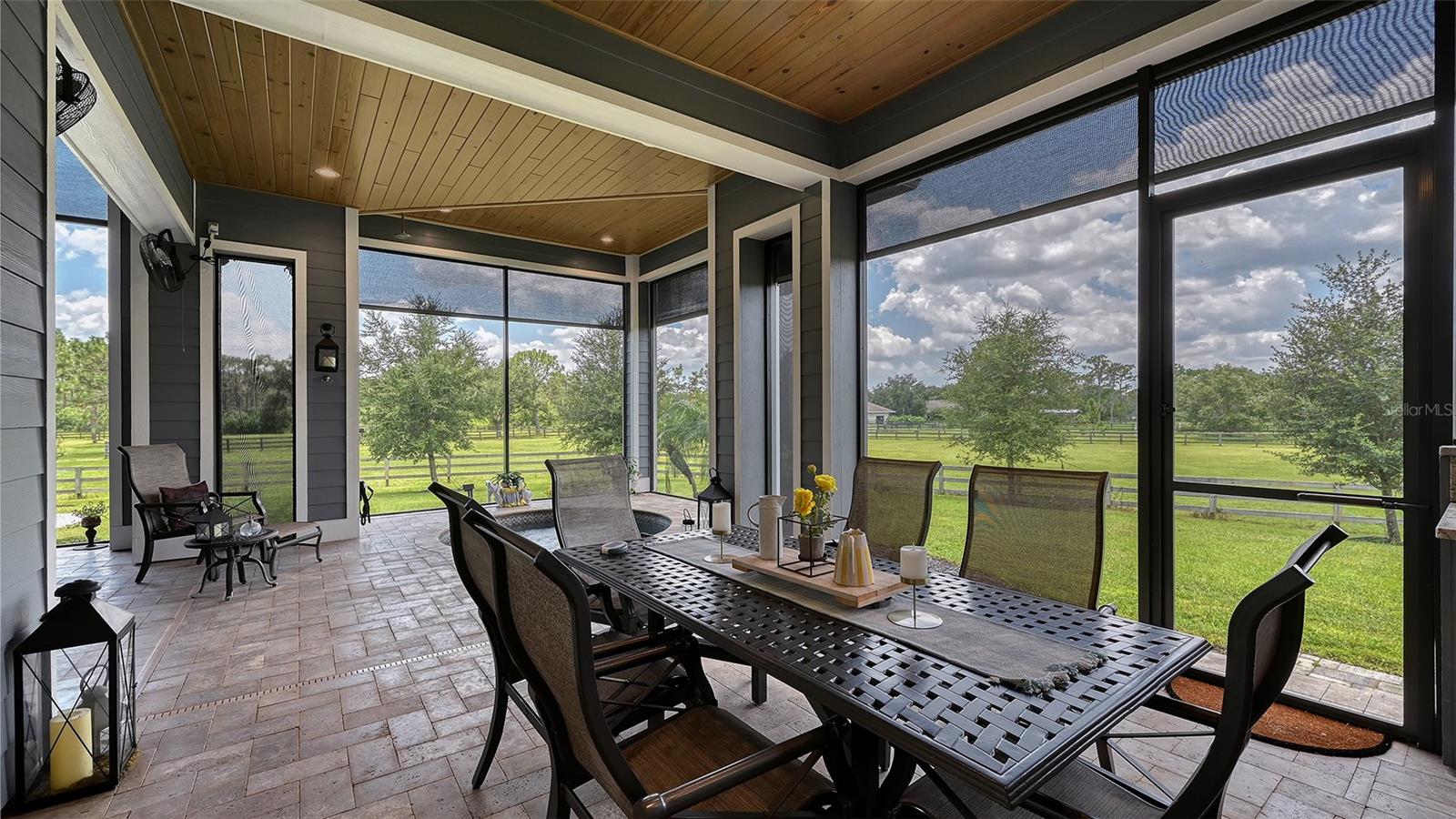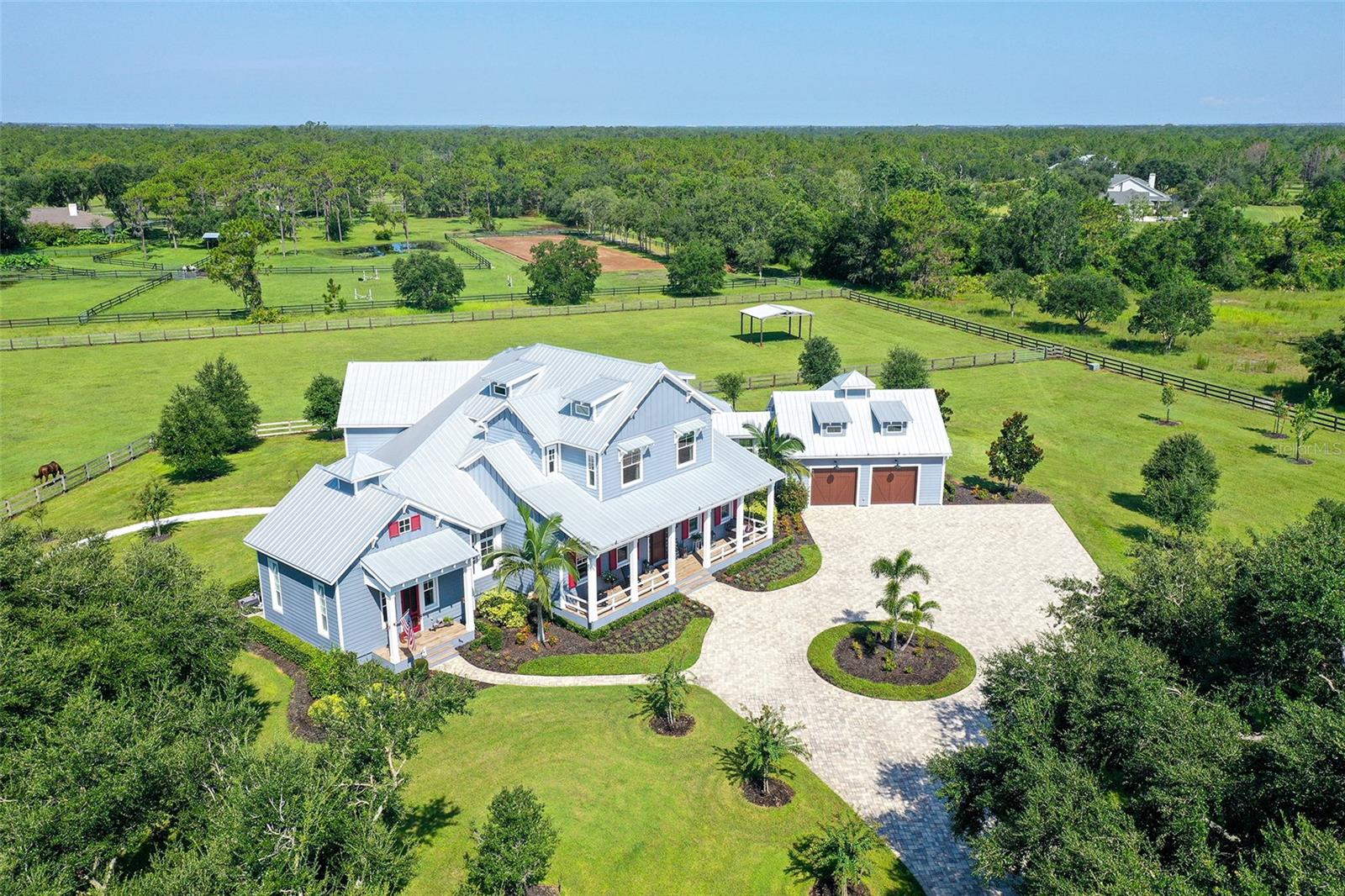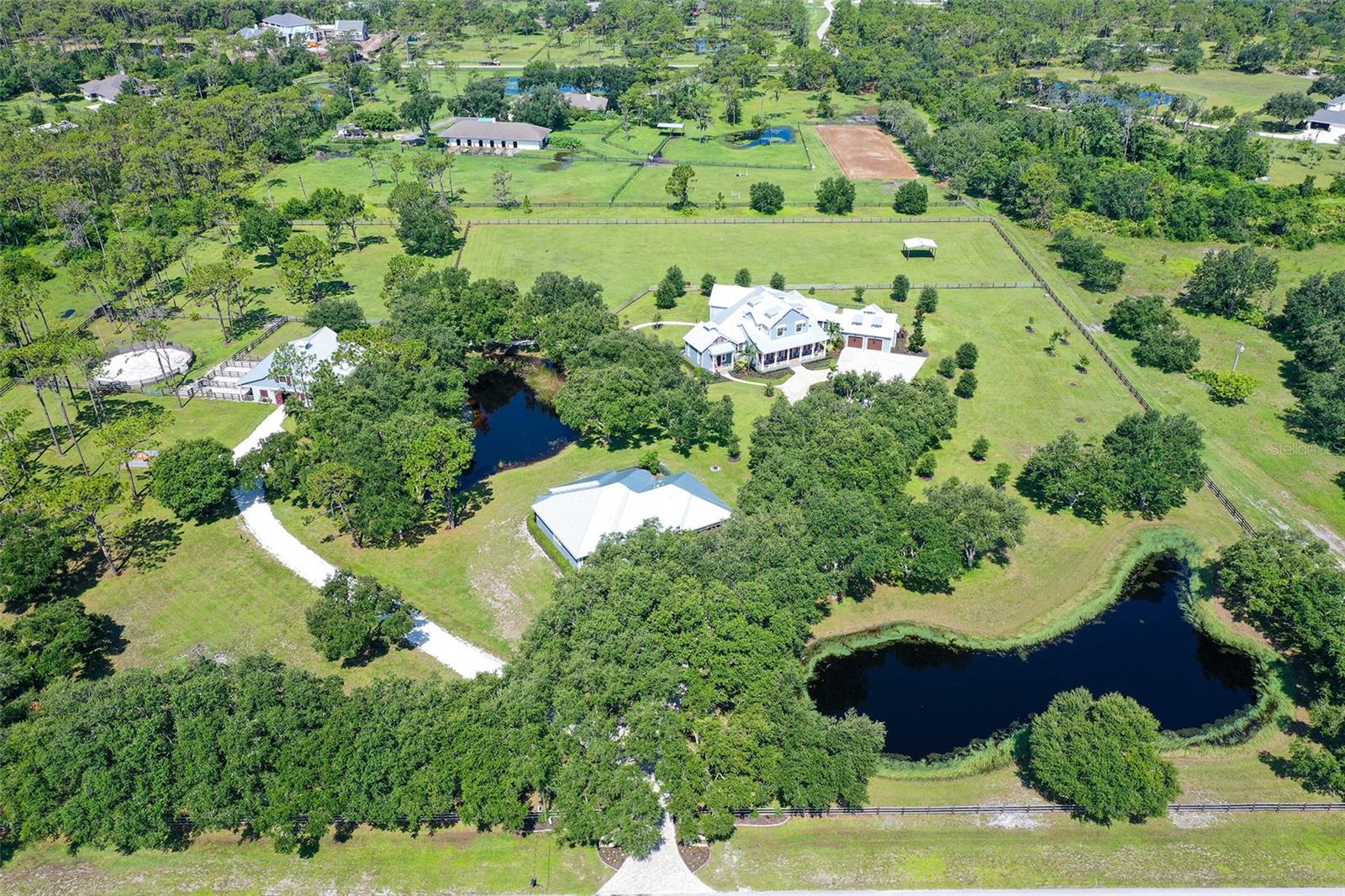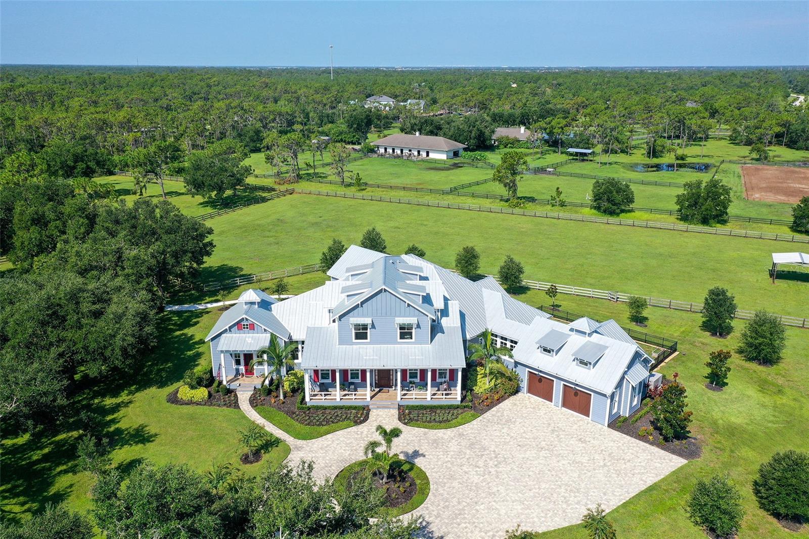 Nestled in Panther Ridge, this gated 9+ acre estate blends luxury and equestrian excellence. A winding paver driveway, lined by majestic oaks, curves past the guest home to the main residence. High and dry with superior drainage, the fenced and cross fenced property features oak, pine, lush pastures and lake views, creating a park-like oasis. Storm-ready with impact-resistant doors, windows, metal roofs, and a whole home generator, peace of mind is ensured. The estate is ideal for multi-generational living and features a 5,003 sq ft u/air smart home built in 2021 (7,185’ total), a remodeled guest home with a 2025 metal roof (2,559 sq ft u/air, 3540’ total), and a state-of-the-art barn, also constructed in 2021. The Grand Main Residence: A sweeping front porch adorned with stucco columns and tongue-and-groove ceilings invites guests in. Elegant Cheyenne front doors establish a refined ambiance, and upon entering, soaring ceilings rise majestically from 11’ to 22’ on the main floor and 10’ on the second floor. The home offers effortless living with dual Primary Suites w/a sumptuous spa bathroom on the main floor and 2 ensuite bedrooms upstairs. It’s many exquisite features include oak flooring, Haven Barrel porcelain tile, poplar-wrapped beams, cypress T&G accents, custom barn doors, and a striking red oak staircase. Smart home automation controls the A/C, garage doors, motorized blinds, lighting, and hurricane resistant lanai shades. The home is pre-wired with Cat 6 and coax cable and has a 25kw whole-home generator. The gourmet kitchen features a SubZero refrigerator, Wolf gas range, microwave, and Marsh maple cabinets. The wet bar includes Scotsman clear ice maker, Thermador refrigerator, wine refrigerator, and HUGE walk-in pantry. Primary Suites offer oak flooring, TG ceilings, spa baths with Mir Retro Blanco tile, claw foot tub, large walk-in shower, and spacious custom closets. The open-concept great room with soaring cathedral ceilings and gas fireplace creates an inviting space for entertaining. The 1,000 sq ft screened lanai includes a luxurious 1,500 gallon heated spa, Travertine pavers, outdoor kitchen with Sedona 30" gas grill, 20" refrigerator, NatureKast cabinets, ledge stone, TG ceilings, and gas fireplace. Energy-efficient, the home features 3 Trane XR 16 SEER A/C units, Rinnai tankless water heaters, R-41 insulation, impact-resistant doors and windows, dual propane tanks (1,500 gal total), and Hardi siding exterior. The Charming Guest Home: Perfectly remodeled 3-bedroom, 2-bath home with 10/11' ceilings, plank porcelain tile throughout, and a chef’s kitchen that includes Dutch-built solid wood cabinets, granite counters, lg center island, and Thermador dual-fuel oven. PLUS-Thermopane windows/doors, Kevlar hurricane screens, 80-gal water heater, solar attic fan, Trane AC w/HEPA filter. The Premier 5-Stall Barn: This 60x57 concrete barn features galvanized steel, powder coated finishes, 5-V Galvalume roof, and R-19 insulation. Sliding stall doors with feed openings, yoke/crossbuck designs, Dutch doors, a center aisle with self-cleaning tracks, A/C tack room complete with a sink, wash stall, and a grooming station, alongside a dedicated hay and feed room. 4 stalls are accompanied by fenced paddocks, each offering direct access to the serene surroundings. The 5th stall offers flexibility, all while overlooking a picturesque landscape adorned with majestic oaks and a tranquil reflection pond, creating a perfect haven for all!