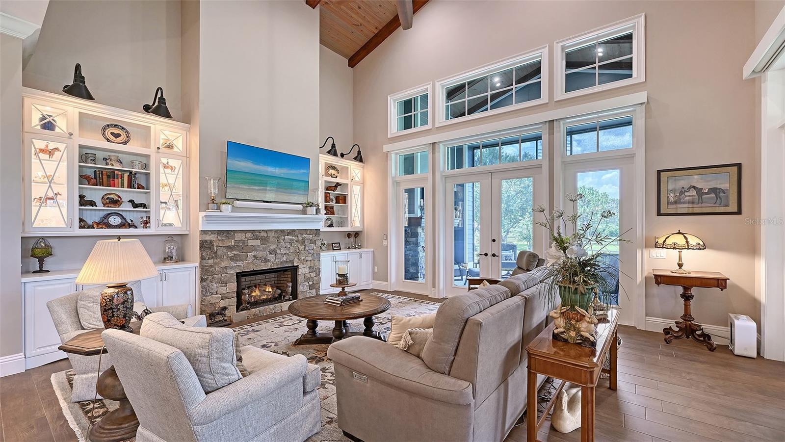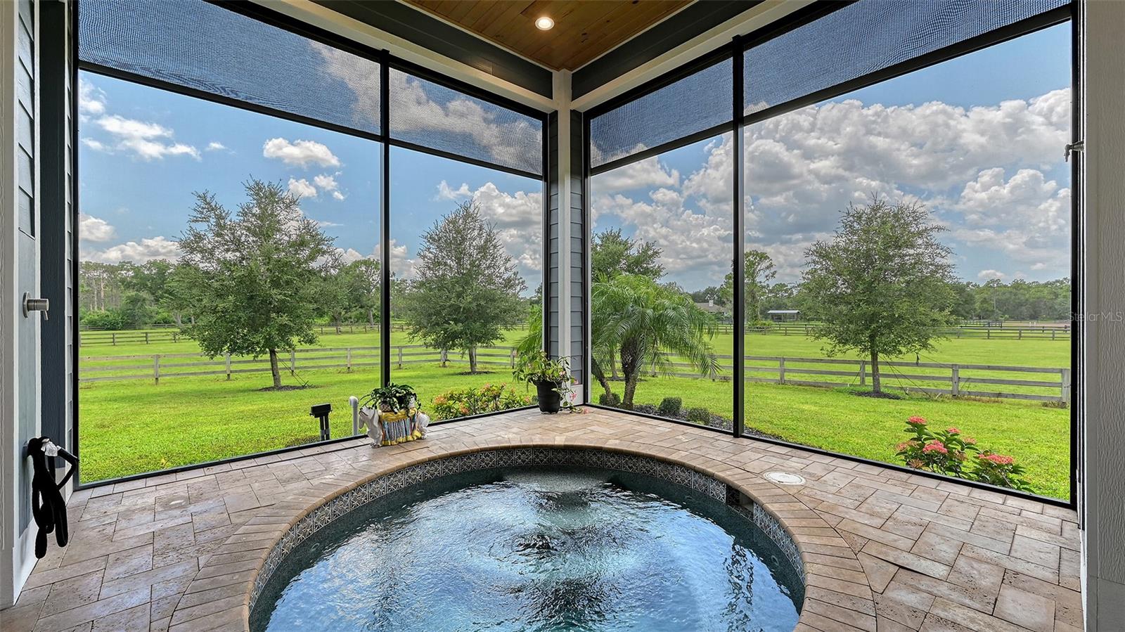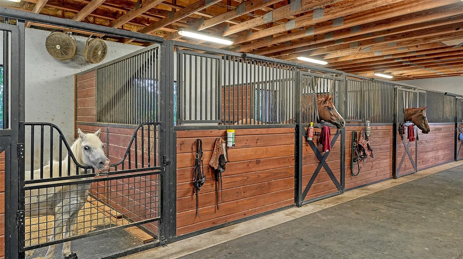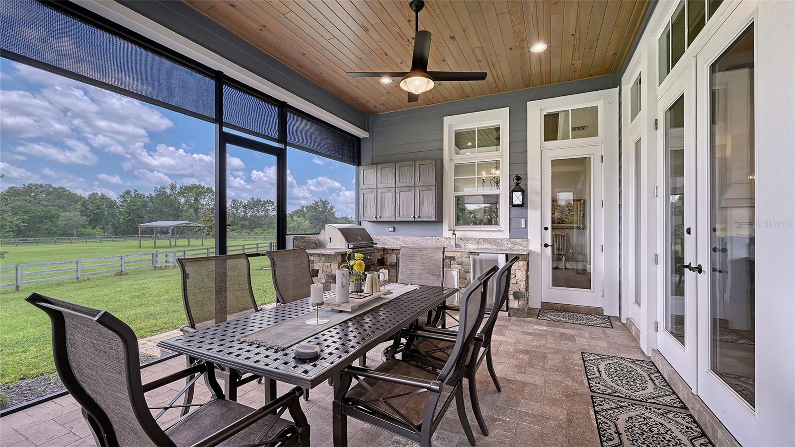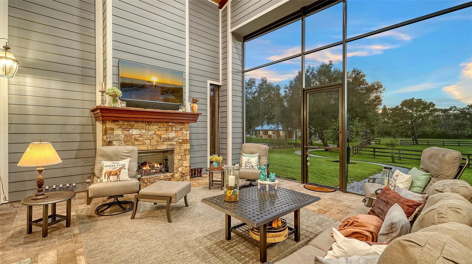Nestled in Panther Ridge, this gated 9+ acre estate blends luxury and equestrian excellence. A winding paver driveway, lined by majestic oaks, curves past the guest home to the main residence. High and dry with superior drainage, the fenced and cross fenced property features oak, pine, lush pastures and lake views, creating a park-like oasis. Storm-ready with impact-resistant doors, windows, metal roofs, and a whole home generator, peace of mind is ensured. The estate is ideal for multi-generational living and features a 5,003 sq ft u/air smart home built in 2021 (7,185’ total), a remodeled guest home with a 2025 metal roof (2,559 sq ft u/air, 3540’ total), and a state-of-the-art barn, also constructed in 2021. The Grand Main Residence: A sweeping front porch adorned with stucco columns and tongue-and-groove ceilings invites guests in. Elegant Cheyenne front doors establish a refined ambiance, and upon entering, soaring ceilings rise majestically from 11’ to 22’ on the main floor and 10’ on the second floor. The home offers effortless living with dual Primary Suites w/a sumptuous spa bathroom on the main floor and 2 ensuite bedrooms upstairs. It’s many exquisite features include oak flooring, Haven Barrel porcelain tile, poplar-wrapped beams, cypress T&G accents, custom barn doors, and a striking red oak staircase. Smart home automation controls the A/C, garage doors, motorized blinds, lighting, and hurricane resistant lanai shades. The home is pre-wired with Cat 6 and coax cable and has a 25kw whole-home generator. The gourmet kitchen features a SubZero refrigerator, Wolf gas range, microwave, and Marsh maple cabinets. The wet bar includes Scotsman clear ice maker, Thermador refrigerator, wine refrigerator, and HUGE walk-in pantry. Primary Suites offer oak flooring, TG ceilings, spa baths with Mir Retro Blanco tile, claw foot tub, large walk-in shower, and spacious custom closets. The open-concept great room with soaring cathedral ceilings and gas fireplace creates an inviting space for entertaining. The 1,000 sq ft screened lanai includes a luxurious 1,500 gallon heated spa, Travertine pavers, outdoor kitchen with Sedona 30" gas grill, 20" refrigerator, NatureKast cabinets, ledge stone, TG ceilings, and gas fireplace. Energy-efficient, the home features 3 Trane XR 16 SEER A/C units, Rinnai tankless water heaters, R-41 insulation, impact-resistant doors and windows, dual propane tanks (1,500 gal total), and Hardi siding exterior. The Charming Guest Home: Perfectly remodeled 3-bedroom, 2-bath home with 10/11' ceilings, plank porcelain tile throughout, and a chef’s kitchen that includes Dutch-built solid wood cabinets, granite counters, lg center island, and Thermador dual-fuel oven. PLUS-Thermopane windows/doors, Kevlar hurricane screens, 80-gal water heater, solar attic fan, Trane AC w/HEPA filter. The Premier 5-Stall Barn: This 60x57 concrete barn features galvanized steel, powder coated finishes, 5-V Galvalume roof, and R-19 insulation. Sliding stall doors with feed openings, yoke/crossbuck designs, Dutch doors, a center aisle with self-cleaning tracks, A/C tack room complete with a sink, wash stall, and a grooming station, alongside a dedicated hay and feed room. 4 stalls are accompanied by fenced paddocks, each offering direct access to the serene surroundings. The 5th stall offers flexibility, all while overlooking a picturesque landscape adorned with majestic oaks and a tranquil reflection pond, creating a perfect haven for all!