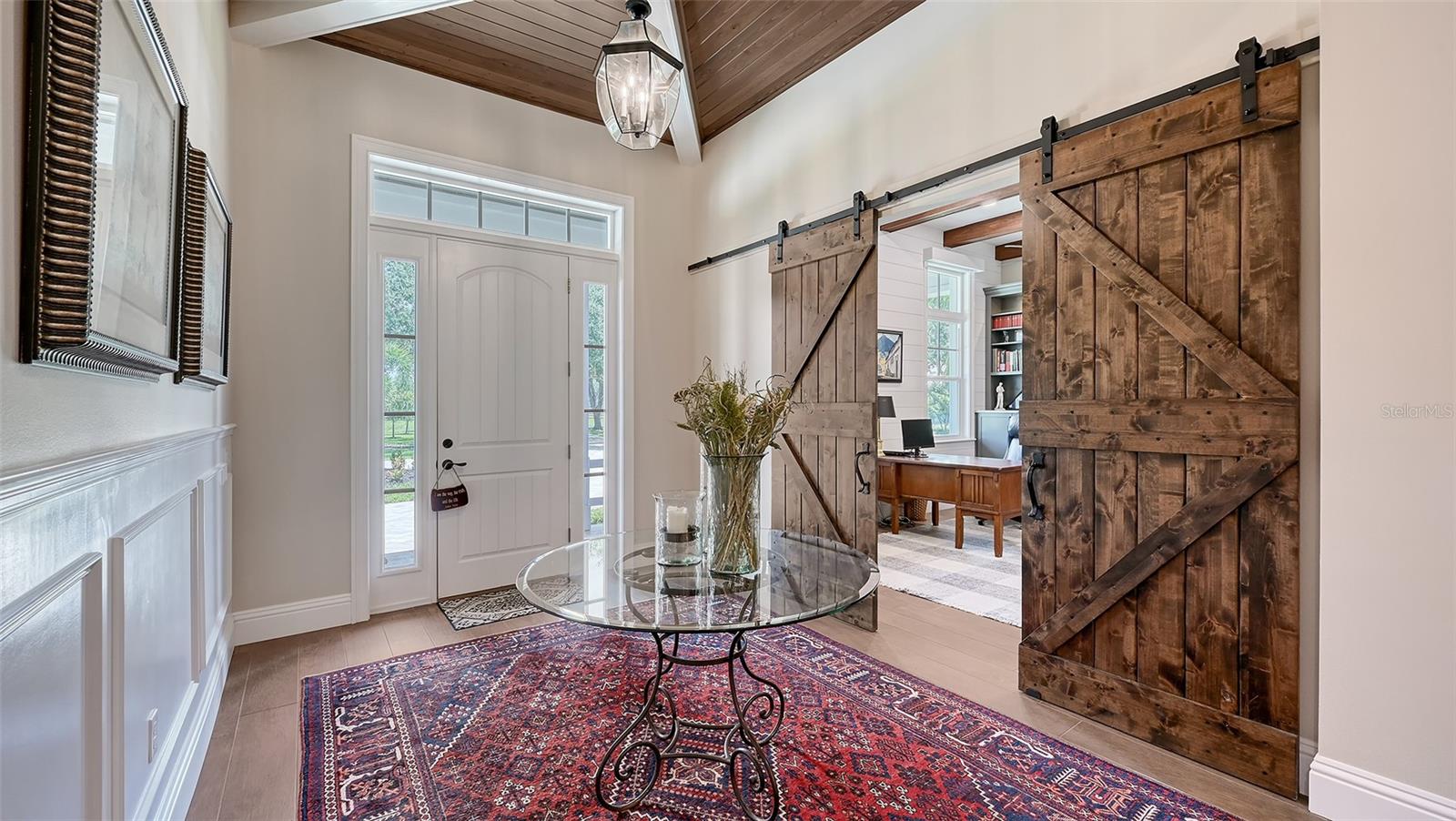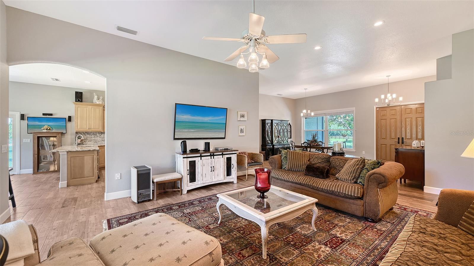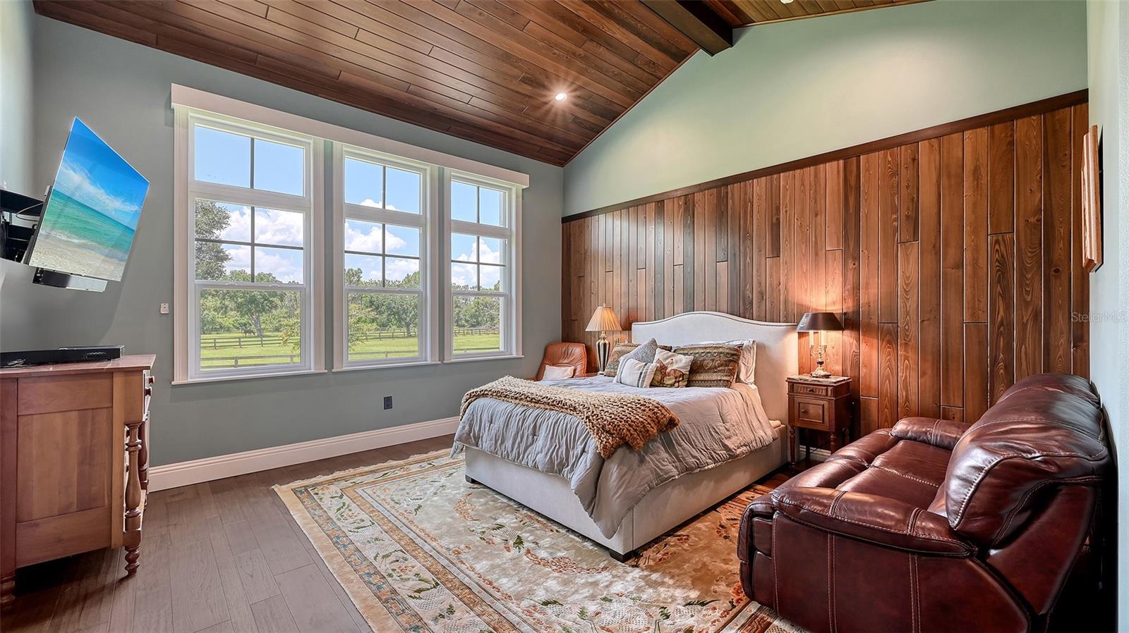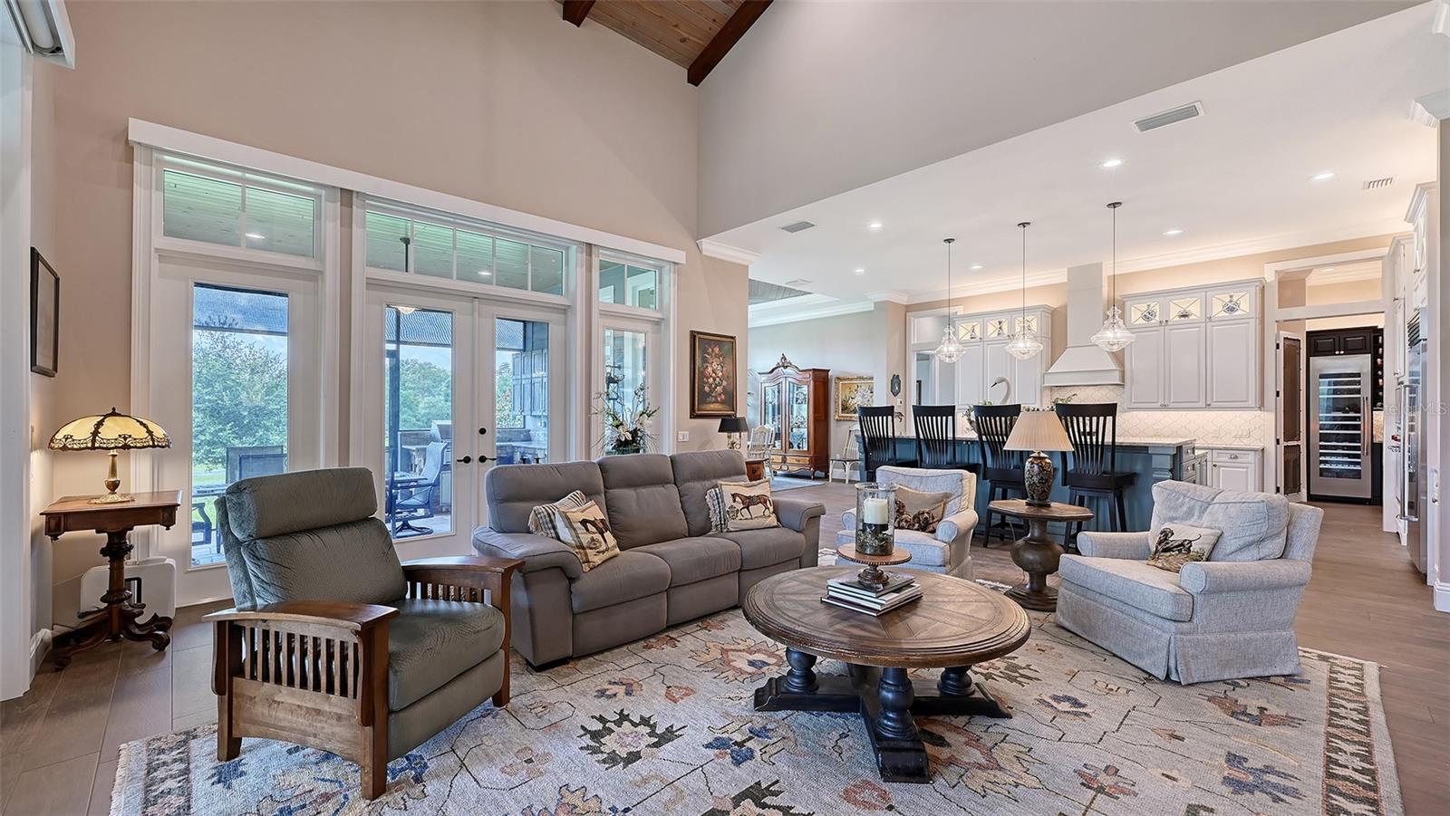 Nestled in Panther Ridge, this gated 9+ acre estate blends luxury and equestrian excellence. A winding paver driveway, lined by majestic oaks, curves past the guest home to the main residence. High and dry with superior drainage, the fenced and cross fenced property features oak, pine, lush pastures and lake views, creating a park-like oasis. Storm-ready with impact-resistant doors, windows, metal roofs, and a whole home generator, peace of mind is ensured. The estate is ideal for multi-generational living and features a 5,003 sq ft u/air smart home built in 2021 (7,185’ total), a remodeled guest home with a 2025 metal roof (2,559 sq ft u/air, 3540’ total), and a state-of-the-art barn, also constructed in 2021. The Grand Main Residence: A sweeping front porch adorned with stucco columns and tongue-and-groove ceilings invites guests in. Elegant Cheyenne front doors establish a refined ambiance, and upon entering, soaring ceilings rise majestically from 11’ to 22’ on the main floor and 10’ on the second floor. The home offers effortless living with dual Primary Suites w/a sumptuous spa bathroom on the main floor and 2 ensuite bedrooms upstairs. It’s many exquisite features include oak flooring, Haven Barrel porcelain tile, poplar-wrapped beams, cypress T&G accents, custom barn doors, and a striking red oak staircase. Smart home automation controls the A/C, garage doors, motorized blinds, lighting, and hurricane resistant lanai shades. The home is pre-wired with Cat 6 and coax cable and has a 25kw whole-home generator. The gourmet kitchen features a SubZero refrigerator, Wolf gas range, microwave, and Marsh maple cabinets. The wet bar includes Scotsman clear ice maker, Thermador refrigerator, wine refrigerator, and HUGE walk-in pantry. Primary Suites offer oak flooring, TG ceilings, spa baths with Mir Retro Blanco tile, claw foot tub, large walk-in shower, and spacious custom closets. The open-concept great room with soaring cathedral ceilings and gas fireplace creates an inviting space for entertaining. The 1,000 sq ft screened lanai includes a luxurious 1,500 gallon heated spa, Travertine pavers, outdoor kitchen with Sedona 30" gas grill, 20" refrigerator, NatureKast cabinets, ledge stone, TG ceilings, and gas fireplace. Energy-efficient, the home features 3 Trane XR 16 SEER A/C units, Rinnai tankless water heaters, R-41 insulation, impact-resistant doors and windows, dual propane tanks (1,500 gal total), and Hardi siding exterior. The Charming Guest Home: Perfectly remodeled 3-bedroom, 2-bath home with 10/11' ceilings, plank porcelain tile throughout, and a chef’s kitchen that includes Dutch-built solid wood cabinets, granite counters, lg center island, and Thermador dual-fuel oven. PLUS-Thermopane windows/doors, Kevlar hurricane screens, 80-gal water heater, solar attic fan, Trane AC w/HEPA filter. The Premier 5-Stall Barn: This 60x57 concrete barn features galvanized steel, powder coated finishes, 5-V Galvalume roof, and R-19 insulation. Sliding stall doors with feed openings, yoke/crossbuck designs, Dutch doors, a center aisle with self-cleaning tracks, A/C tack room complete with a sink, wash stall, and a grooming station, alongside a dedicated hay and feed room. 4 stalls are accompanied by fenced paddocks, each offering direct access to the serene surroundings. The 5th stall offers flexibility, all while overlooking a picturesque landscape adorned with majestic oaks and a tranquil reflection pond, creating a perfect haven for all!