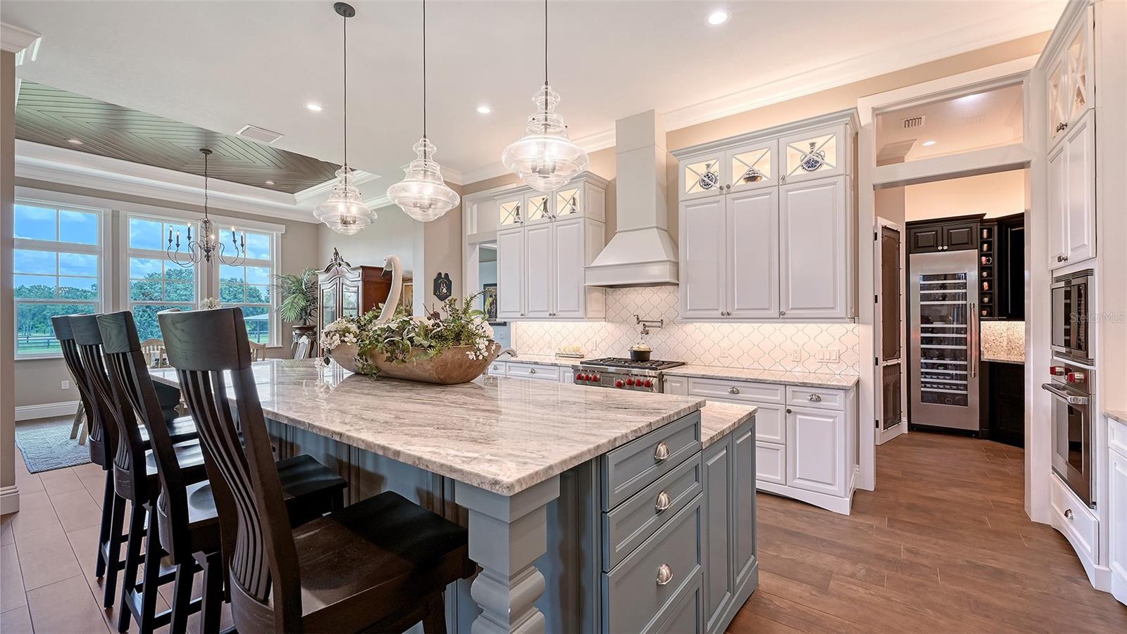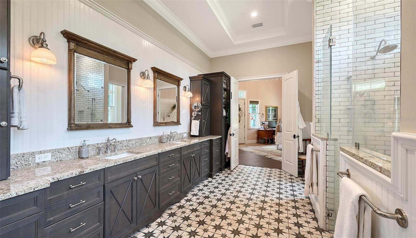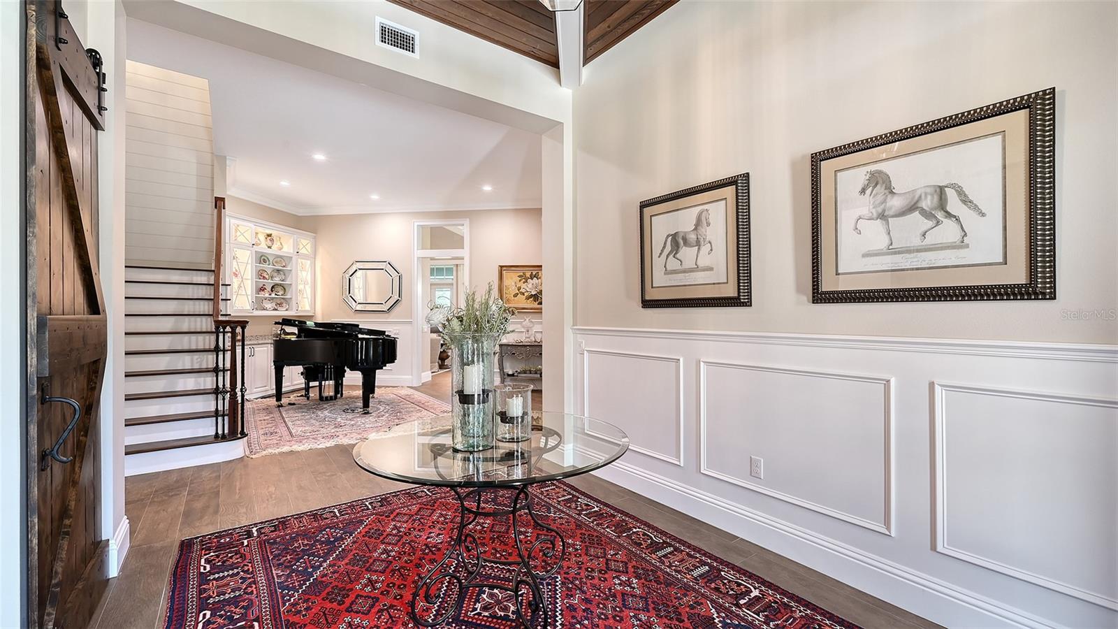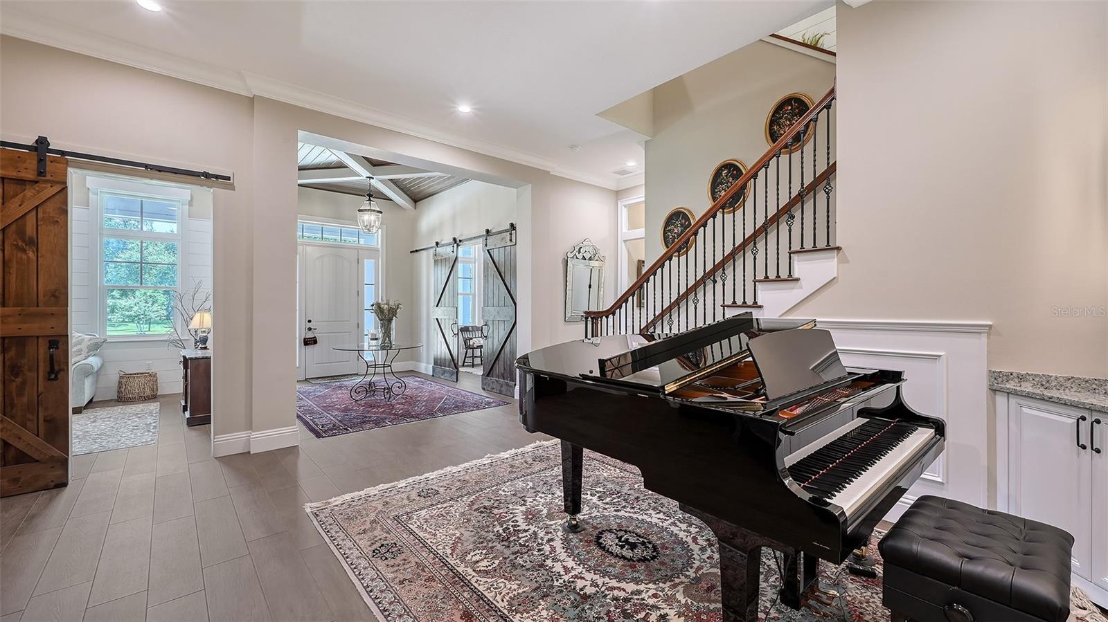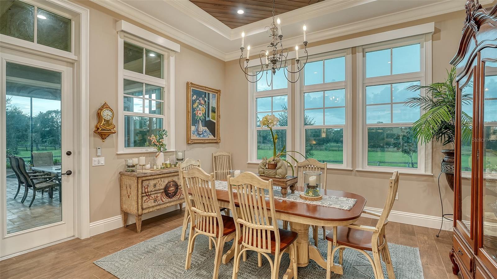 Nestled in Panther Ridge, this gated 9+ acre estate blends luxury and equestrian excellence. A winding paver driveway, lined by majestic oaks, curves past the guest home to the main residence. High and dry with superior drainage, the fenced and cross fenced property features oak, pine, lush pastures and lake views, creating a park-like oasis. Storm-ready with impact-resistant doors, windows, metal roofs, and a whole home generator, peace of mind is ensured. The estate is ideal for multi-generational living and features a 5,003 sq ft u/air smart home built in 2021 (7,185’ total), a remodeled guest home with a 2025 metal roof (2,559 sq ft u/air, 3540’ total), and a state-of-the-art barn, also constructed in 2021. The Grand Main Residence: A sweeping front porch adorned with stucco columns and tongue-and-groove ceilings invites guests in. Elegant Cheyenne front doors establish a refined ambiance, and upon entering, soaring ceilings rise majestically from 11’ to 22’ on the main floor and 10’ on the second floor. The home offers effortless living with dual Primary Suites w/a sumptuous spa bathroom on the main floor and 2 ensuite bedrooms upstairs. It’s many exquisite features include oak flooring, Haven Barrel porcelain tile, poplar-wrapped beams, cypress T&G accents, custom barn doors, and a striking red oak staircase. Smart home automation controls the A/C, garage doors, motorized blinds, lighting, and hurricane resistant lanai shades. The home is pre-wired with Cat 6 and coax cable and has a 25kw whole-home generator. The gourmet kitchen features a SubZero refrigerator, Wolf gas range, microwave, and Marsh maple cabinets. The wet bar includes Scotsman clear ice maker, Thermador refrigerator, wine refrigerator, and HUGE walk-in pantry. Primary Suites offer oak flooring, TG ceilings, spa baths with Mir Retro Blanco tile, claw foot tub, large walk-in shower, and spacious custom closets. The open-concept great room with soaring cathedral ceilings and gas fireplace creates an inviting space for entertaining. The 1,000 sq ft screened lanai includes a luxurious 1,500 gallon heated spa, Travertine pavers, outdoor kitchen with Sedona 30" gas grill, 20" refrigerator, NatureKast cabinets, ledge stone, TG ceilings, and gas fireplace. Energy-efficient, the home features 3 Trane XR 16 SEER A/C units, Rinnai tankless water heaters, R-41 insulation, impact-resistant doors and windows, dual propane tanks (1,500 gal total), and Hardi siding exterior. The Charming Guest Home: Perfectly remodeled 3-bedroom, 2-bath home with 10/11' ceilings, plank porcelain tile throughout, and a chef’s kitchen that includes Dutch-built solid wood cabinets, granite counters, lg center island, and Thermador dual-fuel oven. PLUS-Thermopane windows/doors, Kevlar hurricane screens, 80-gal water heater, solar attic fan, Trane AC w/HEPA filter. The Premier 5-Stall Barn: This 60x57 concrete barn features galvanized steel, powder coated finishes, 5-V Galvalume roof, and R-19 insulation. Sliding stall doors with feed openings, yoke/crossbuck designs, Dutch doors, a center aisle with self-cleaning tracks, A/C tack room complete with a sink, wash stall, and a grooming station, alongside a dedicated hay and feed room. 4 stalls are accompanied by fenced paddocks, each offering direct access to the serene surroundings. The 5th stall offers flexibility, all while overlooking a picturesque landscape adorned with majestic oaks and a tranquil reflection pond, creating a perfect haven for all!