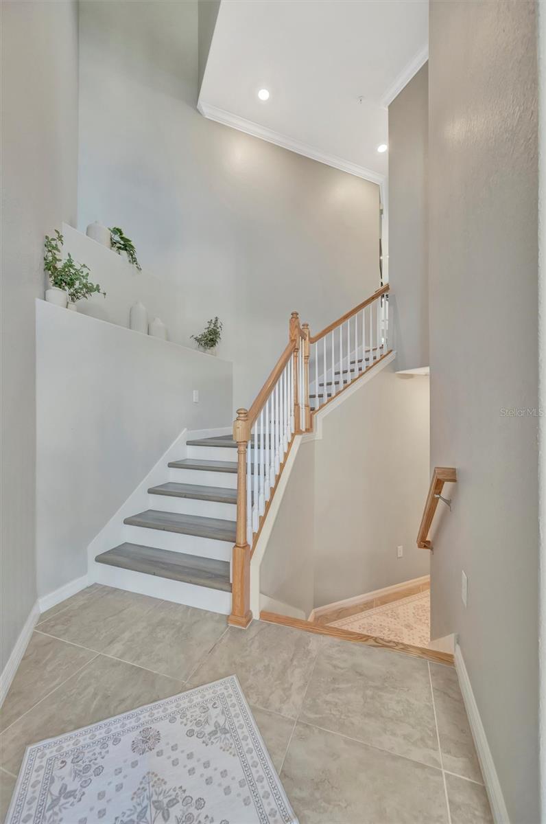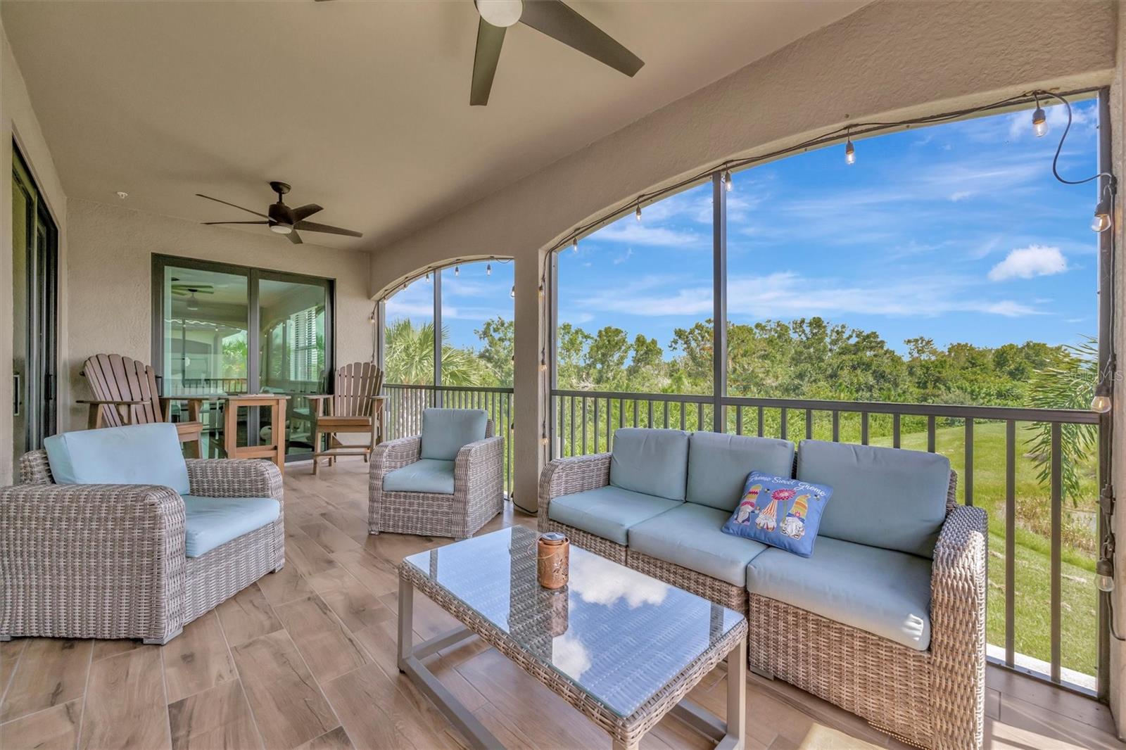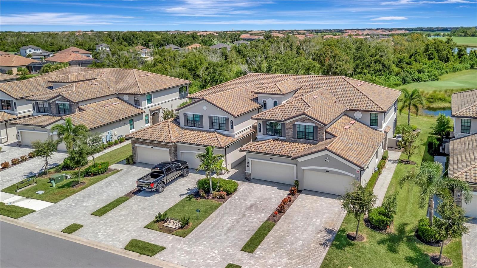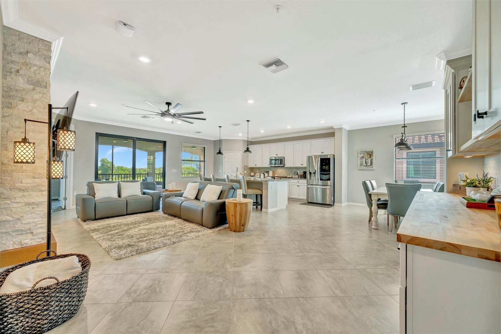 Welcome to Paradise! With 3 bedrooms, 2 baths, and a 2.5 car garage, this Lakewood National upper floor Coach Home has been thoughtfully updated with various improvements for comfort, style, and functionality. New luxury vinyl plank flooring covers the bedrooms, stairs, and landings, giving the home a fresh, modern feel. The chef-inspired kitchen boasts brand-new appliances installed within the last year, including a high-end refrigerator, a double oven with a 5-burner gas cooktop, and a sleek and quiet dishwasher, making it a culinary haven. A custom bar area with cabinets for extra storage, butcher block shelves and countertop, and a beverage cooler creates an eye catching yet functional space for entertaining. The living room includes a custom stone wall and electric fireplace, adding warmth, style, and character. Updated fixtures and fans throughout, bring a clean look to the interior, while TVs in the living room and on the lanai provide entertainment options. The screened in lanai, which provides a direct view of hole #11 Piper, is upgraded with new dark flooring and large ceiling fans, and is a comfortable place to relax outdoors. Nestled next to a preserve and pond, the property offers serene views with frequent sightings of deer and other wildlife, creating a peaceful, nature-filled backdrop. A water softener and filtration system with a lifetime warranty ensures clean water for the household. This move-in-ready townhouse blends practical upgrades with a welcoming vibe. Membership boasts access to 36 holes of golf, 24-hour gated security with nightly patrol, a state-of-the-art fitness center with 24-hour access, an onsite fitness director, a TPI certified personal trainer, a variety of group fitness classes to choose from, saunas in the men’s and women’s locker rooms, 8 lighted Har-Tru tennis courts, 4 pickleball courts, 2 Har-Tru bocce courts, full-service salon/spa, resort-style pool with waterfall features, a spa, and a lap pool. Enjoy dining at the community's two restaurants - the poolside Tiki Bar and the full-service on-site dining experience at Deke’s Grill; Palmer Room located inside the newly finished clubhouse. You will find everything you need within this beautiful, gated community.
