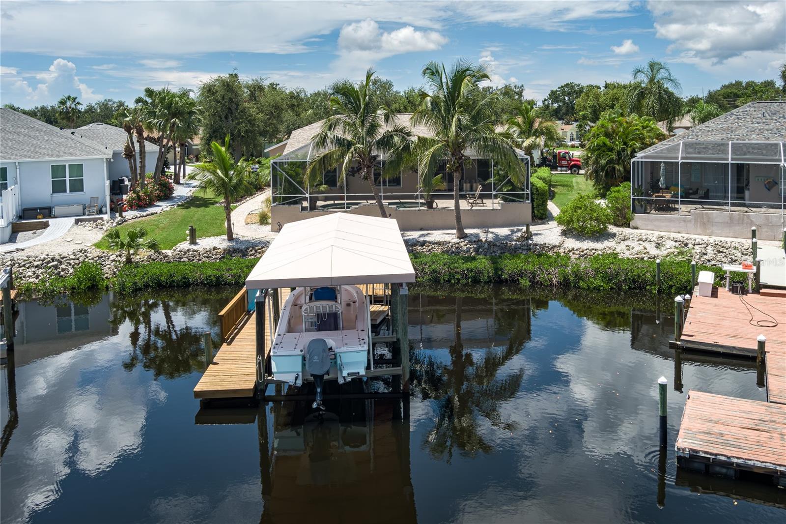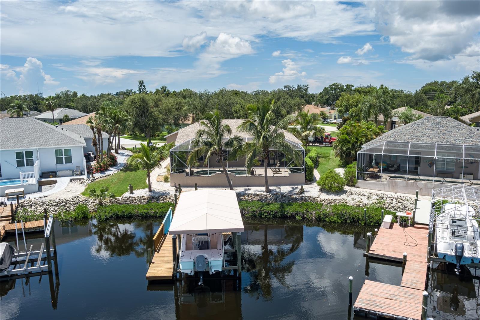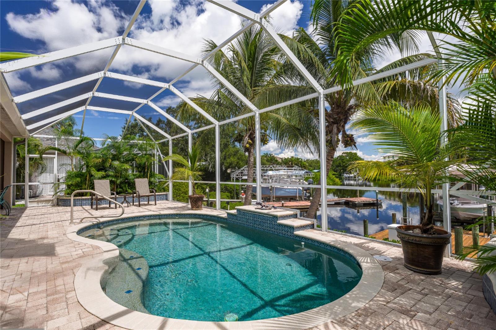 PRICE REDUCTION for this Waterfront Paradise with Direct Gulf Access. Welcome to your dream home in the sought-after River Pointe community, where boating, entertaining, and luxury living come together. The original owner's pride of ownership prevails in this beautifully updated 3-bedroom, 2-bath residence. The home sits on a wide saltwater canal at the end of a tranquil basin—offering privacy, minimal boat traffic, stunning views of dolphins dancing, manatees floating, mullet jumping, AND easy navigation to the open waters of the Manatee River, Intercoastal Waterway, and Gulf. The Seller had the boat lift installed at the end of an extension to adapt to winter low tides. With a 4' draw (mol) the Seller has had no problems getting on and off of his lift at low tide. The property is a Boater’s Dream, complete with dock, a covered lift that accommodates boats up to 28 ft and 9,000-pounds, and a floating dock. Features include a well-built and modern home. This personality plus home offers a spacious 3-car garage for vehicles and storage. Light and bright interior, high ceilings, split floor plan, new roof (2020) for peace of mind, remodeled kitchen in 2021 with wood cabinetry, quartz countertops, and new appliances. New washer December 2025. Updated bathrooms (2021 & 2025) with modern finishes, new windows installed in 2022 and 2025 for energy efficiency and natural light and window hurricane screens. YOUR Outdoor Oasis offers an inground pool with waterfall and 8 spa jets, screened lanai for year-round enjoyment, an expansive paver deck and covered entertaining area—perfect for gatherings, grilling, or relaxing poolside while enjoying the serene canal views to create a true Florida escape. River Pointe residents enjoy low HOA fees and access to a private community boat ramp. This home is the ideal blend of luxury, functionality, and waterfront lifestyle. This property is located about two miles West of I-75 via SR 64, close to Costco, Publix, Target and Walmart, entertainment downtown Bradenton, River Walk, and many fine eateries. Whether you're an avid boater, entertainer, or simply seeking a peaceful retreat with upscale finishes, this home checks every box. Schedule your private showing today and experience the best of Florida living. Possible temporary 1-0 buydown rate covered by lender. Details available.