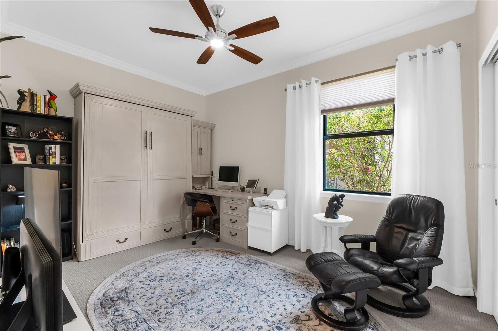 PERFECTLY DESIGNED STEEL CREEK MODEL –WATERFRONT LIVING IN DEL WEBB. This stunning Steel Creek Garden Series Model is truly a trifecta of perfection: the ideal location, breathtaking water views, and an intelligently designed floorplan. Here’s your chance to own in the highly desirable 55+ Del Webb community, located within Lakewood Ranch—the nation’s premier multi- generational planned community. Spanning 1,388 sq ft of thoughtfully designed living space on a quiet street, this home features 2 bedrooms and 2 bathrooms, with the flexibility to customize the guest suite to your needs. The second bedroom is equipped with a queen-size Murphy bed, proving versatility for guests or a multipurpose space. The chef-inspired kitchen showcases quartz countertops, upgraded wood cabinetry, and a layout that flows seamlessly into the dining and living areas—perfect for entertaining family and friends. The sliding doors open the home to its best feature: an expansive lanai overlooking the water, where you’ll be captivated by mesmerizing Florida sunsets. Outdoor living is elevated with a saltwater heated pool, accent cage lighting, and three remote controlled privacy screens, ensuring comfort and protection year-round. The lanai truly embodies the quintessential Florida lifestyle. The owner’s suite is a private retreat, featuring a dual sink vanity, spacious walk-in shower, and an oversized walk-in closet designed for ultimate convenience. Notable upgrades include crown molding and plantation shutters, custom draperies, and elegant finishes throughout, whole-home air purification system and central vac, new Whirlpool washer, hurricane impact windows and doors, security system, ceiling fans throughout, ceramic tile in main living areas with plush carpet in the bedrooms. The 2-car garage offers an additional 4-foot extension, providing ample room for storage or a golf cart, along with an epoxy floor finish. Meticulously maintained and move-in ready, this home blends style, comfort, and peace of mind in one exceptional package. Don’t miss this rare opportunity to own a slice of paradise in Del Webb Lakewood Ranch. Schedule your private showing today and make this beautiful Steel Creek Model your own.