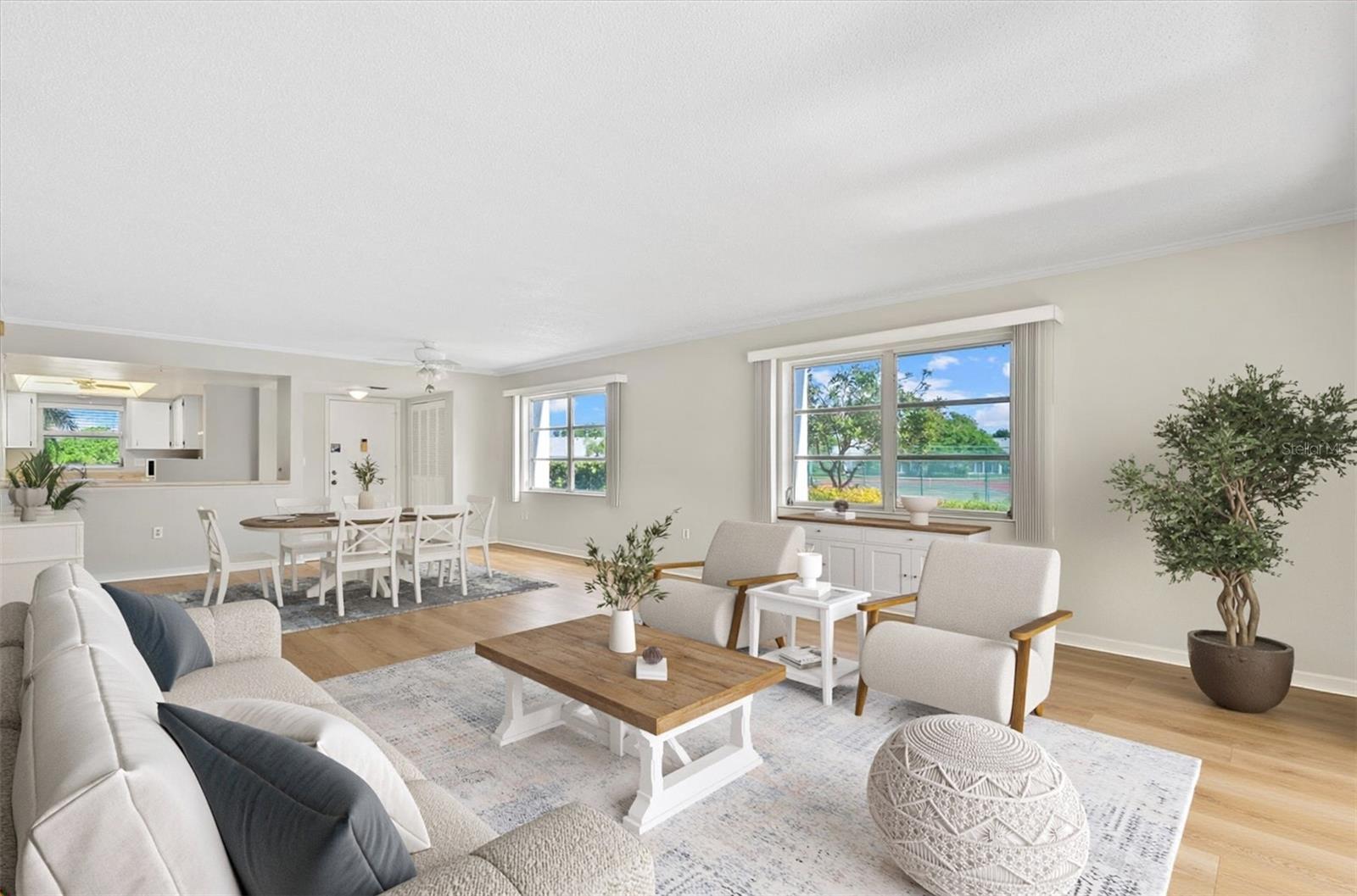 Lock-and-leave coastal living just a 5 minute drive or 3 mile bike ride from Anna Maria Island! Welcome to Mount Vernon, a beautifully maintained 55+ community along Sarasota Bay. This GROUND FLOOR location couldn't be any better, just across the street from the community amenities with a water view and covered parking. Amenities include a clubhouse, heated pool, tennis, pickleball, putting green, shuffleboard, scenic walking paths, kayak launch, and boat docks. Step inside to an open layout with an all weather sunroom, perfect for catching sunrises over the water. Brand new high quality wood laminate flooring flows throughout the living, dining and hallway. The primary bedroom is equipped with dual closets plus an ensuite bathroom with dual sinks and a walk-in shower with grab bars. The secondary bedroom has ample storage with a walk-in closet. The monthly fee includes water, sewer, trash, pest control, cable, internet, exterior maintenance, landscape maintenance, and building insurance- so your essentials are bundled into one predictable payment. This West Bradenton location puts beaches, dining, and healthcare all within a short drive. Florida living, made easy!