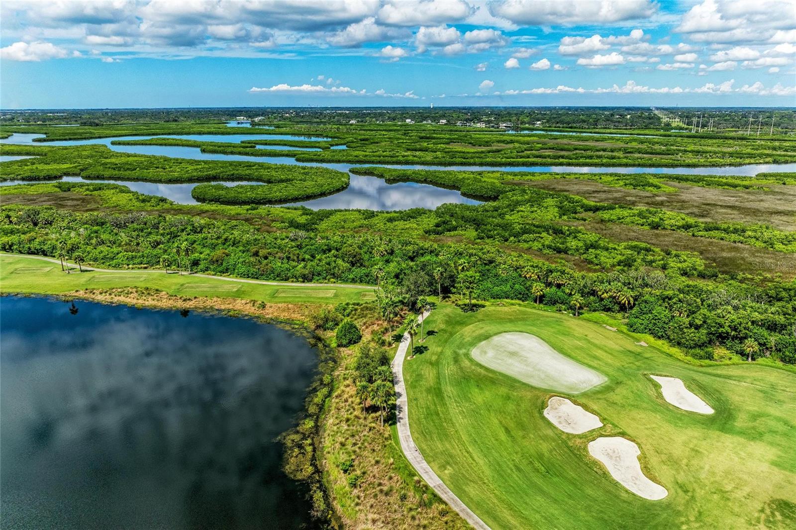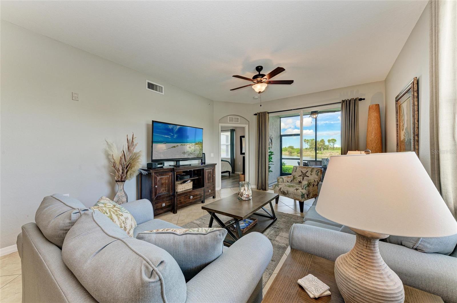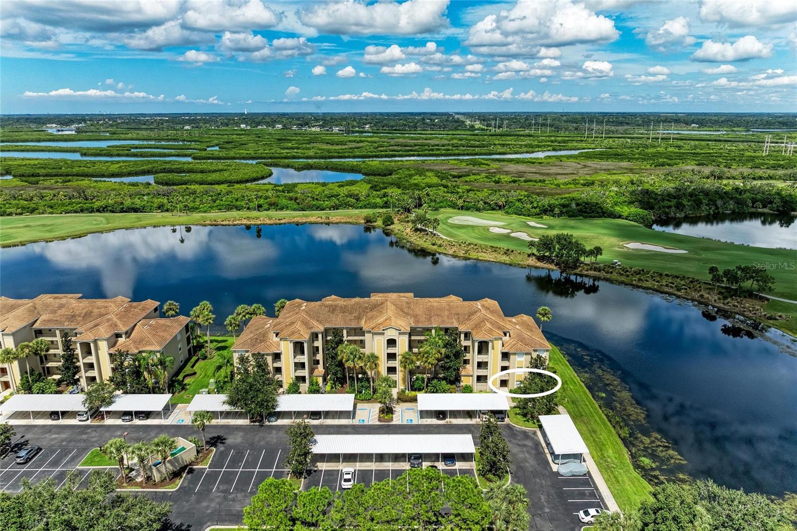 Welcome to the lifestyle you’ve been dreaming of in this Colonnade model — the largest of its kind — ideally located in the end building for added privacy and breathtaking WRAPAROUND WATER VIEWS from every main living space! Offering nearly 1,300 sq. ft. of beautifully designed living area, this FULLY FURNISHED, FIRST FLOOR END UNIT features the perfect layout with a spacious kitchen overlooking the dining area, and great room perfect for entertaining or relaxing. Sliders lead to the screened lanai designed to be your own private escape, as you watch the golfers approach the green and enjoy the surrounding wildlife. The primary suite is a true retreat, complete with two walk-in closets, a large en-suite bath, and serene water views. You will also appreciate a generous second bedroom and a versatile flex space that can be used as a home office, den, or extra guest room. With a newer A/C (2023) and water heater (2024), fresh custom paint, updated light fixtures, and stylish furnishings, this GOLF DEEDED home is move-in ready and waiting for it's next owner to enjoy! Additional conveniences include a covered carport, a private storage room just across the hall, and HOA-covered water, cable, and internet. River Strand is a gated resort community known for its 27 holes of championship golf, a full clubhouse with restaurant and grille room, two resort pools and spas, tiki bar, six satellite pools, tennis and pickleball courts, and a vibrant calendar of fitness and social events. The clubhouse is currently undergoing an exciting renovation, featuring impressive updates to the restaurant, grille, and tiki bar that promise an elevated experience for both members and guests. Located just minutes from the new Marketplace featuring Costco, Target, and an exciting lineup of new restaurants and shops — plus, you're only a short drive to the stunning Gulf Coast beaches! This home offers everything you've been looking for, so come and experience River Strand at it's best, you may never want to leave!