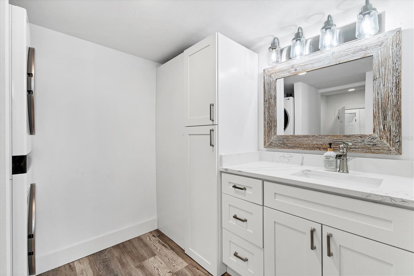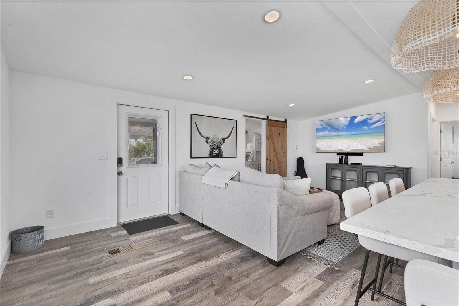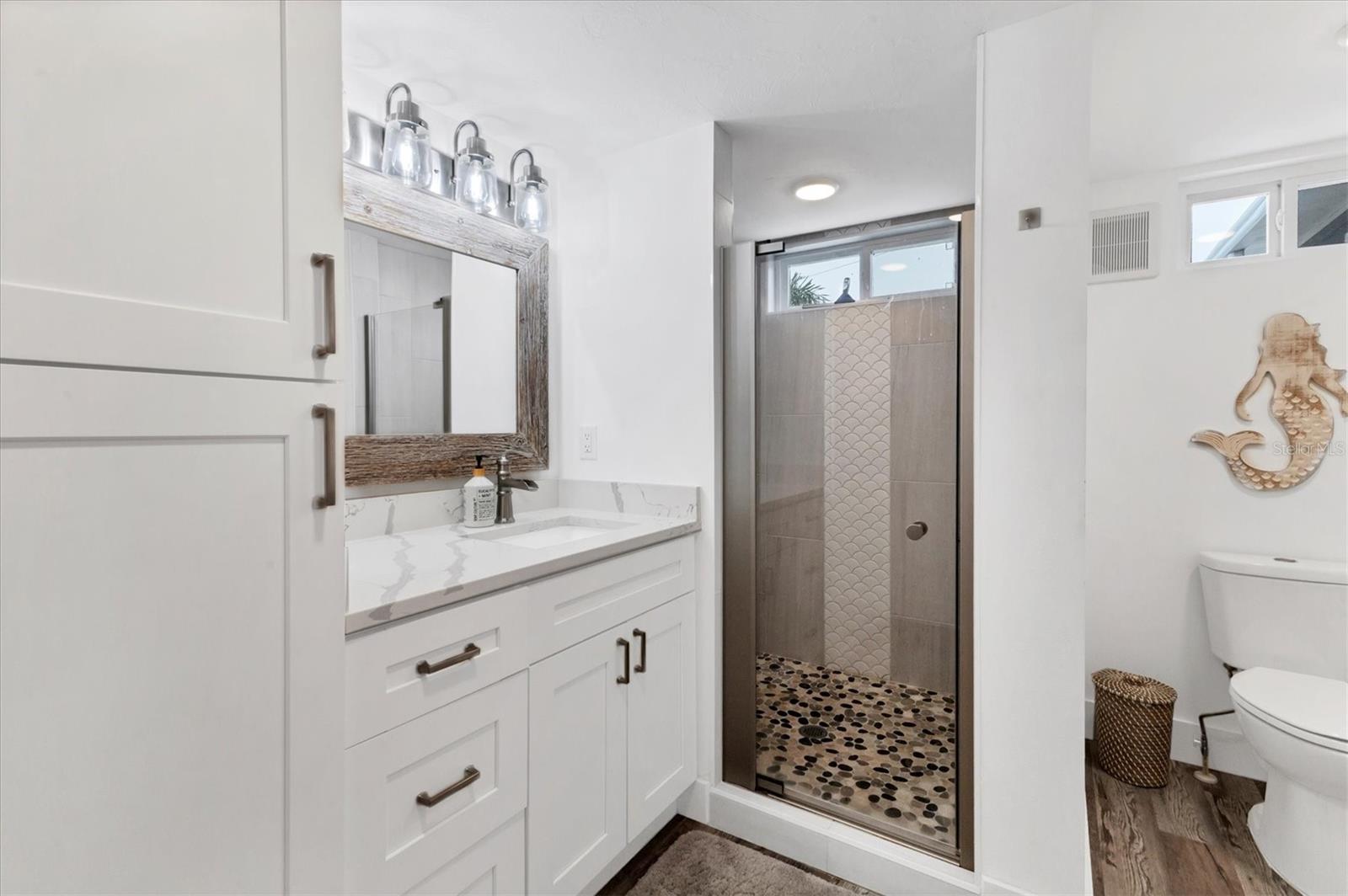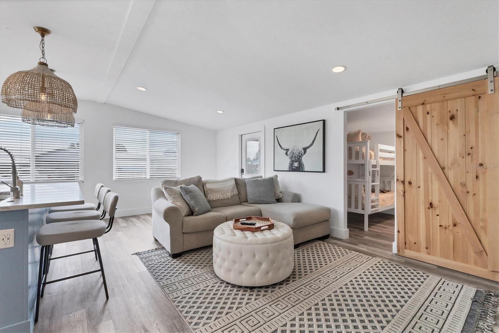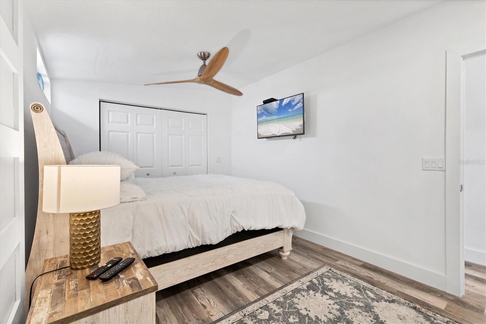 STUNNING COASTAL RENOVATION! This 3 Bedroom, 2 Bath Cottage-core Mobile Home is situated on an oversized Lot and a Half in the top-tier, active 55+ Trailer Estates community. The Open Concept and expansive living spaces are wonderful for entertaining, with vaulted ceilings and tons of natural light! 3rd Bedroom is currently set up as a bunk room, but could be great office space or den. Luxury vinyl plank floors throughout. Kitchen boasts a long center island for gathering with plenty of Shaker style cabinets, modern stainless steel appliances and a ton of quartz countertop space. Generous Primary Bedroom with wall to wall built-in closet. Roomy ensuite Primary Bath has walk-in shower and convenient Laundry space. Impact windows / doors. Huge backyard! Every square inch of the home has been thoughtfully designed to maximize a relaxed, laid back lifestyle. Highly effective, energy efficient spray foam insulation throughout the home. This home is low maintenance. A 7x7 shed for workshop or storage. You own the land. Boaters have direct access to Sarasota Bay from the Marina. Enjoy the large, heated community pool, hot tub, gym and wood shop. The community buzzes with pickleball, shuffleboard, kayaking, horseshoes, bocce, dancing and more. A US Post Office on site. 10 minutes to Sarasota-Bradenton Int'l Airport. Convenient to shopping, restaurants, the Arts and everything in Bradenton/Sarasota. Sold furnished.