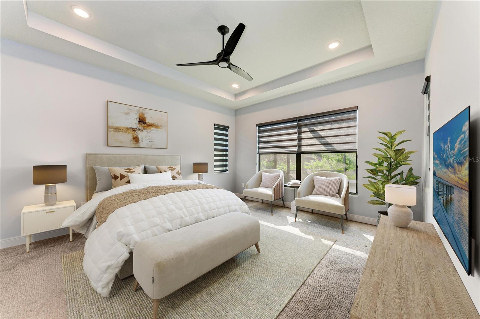 Imagine waking up each morning to the soft sounds of nature — coffee in hand, sitting beneath the covered lanai as sunlight dances off the waterfall spilling into your private pool. The only thing more serene than the view is knowing that everything — from the lawn to the high-speed internet — is already taken care of. This is the effortless Florida lifestyle waiting for you in Cresswind, Lakewood Ranch’s premier 55+ resort community. Step through custom glass entry doors into a light-filled home that strikes the perfect balance between elegant design and everyday comfort. The open-concept great room welcomes you with soaring tray ceilings, designer lighting, and a stunning custom-built entertainment wall featuring a 6-foot linear electric fireplace flanked by dual bookshelves. A wall-mounted TV (included) creates a ready-to-enjoy gathering space that seamlessly connects to the chef-inspired kitchen — complete with quartz countertops, graphite cabinetry, a beverage cooler, upgraded pantry, and built-in appliances. The primary suite offers a tranquil retreat overlooking the pool, with a spa-like bath featuring a walk-in shower with bench, dual raised vanities, and a spacious custom closet. Two additional guest bedrooms and a private den provide flexibility for visiting family, hobbies, or a home office (with a wall-mounted TV included). Every inch of this home is curated with thoughtful detail — from designer fans and window treatments to brass-trim floor outlets and upgraded plumbing fixtures. Outside, your personal oasis awaits. A 12’x24 lighted pool with waterfall anchors the expanded lanai, where motorized hurricane screens offer instant protection and privacy. The outdoor TV (included) and under-roof living space make it ideal for entertaining year-round. Beyond the lanai, lush 360° landscaping and paver driveway set the tone for timeless curb appeal — all maintained by the HOA. Even the garage impresses with an epoxy floor, insulated door, backup opener, steel storage racks and cabinets — perfect for your Florida lifestyle essentials. As a resident of Cresswind at Lakewood Ranch, you’ll enjoy access to a vibrant active-adult community designed for connection and wellness: resort-style and resistance pools, tennis and pickleball courts, fitness center, walking trails, arts studio, dog parks, food truck nights, and a full-time lifestyle director. All just minutes from the shopping, dining, and beaches that make Lakewood Ranch the #1 multi-generational community in the U.S. Why wait to start living your best Florida life? This home is the perfect blend of sophistication, low-maintenance living, and resort-level amenities — ready for you to move in and start making memories today. Home is virtually staged.