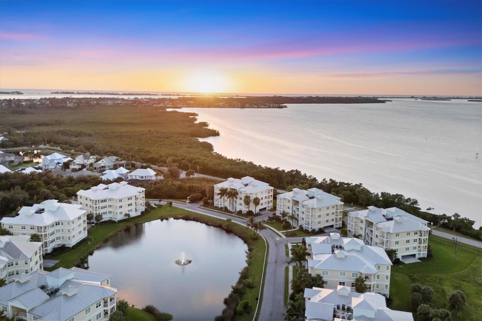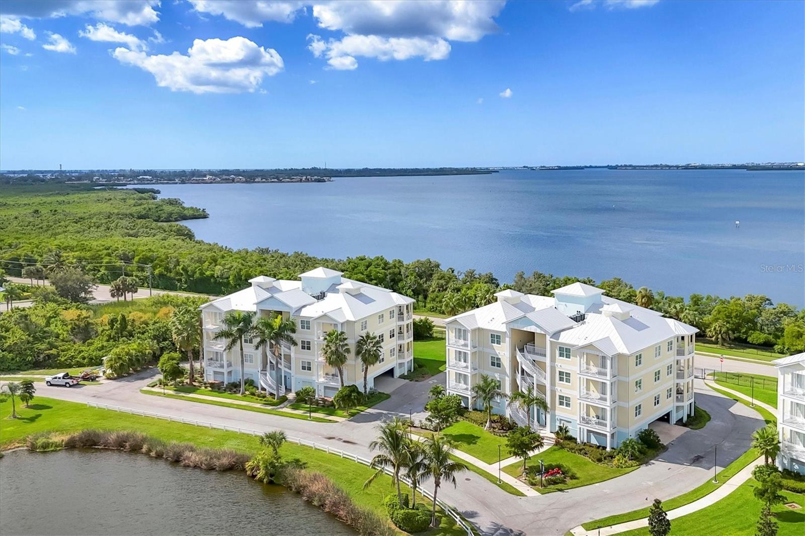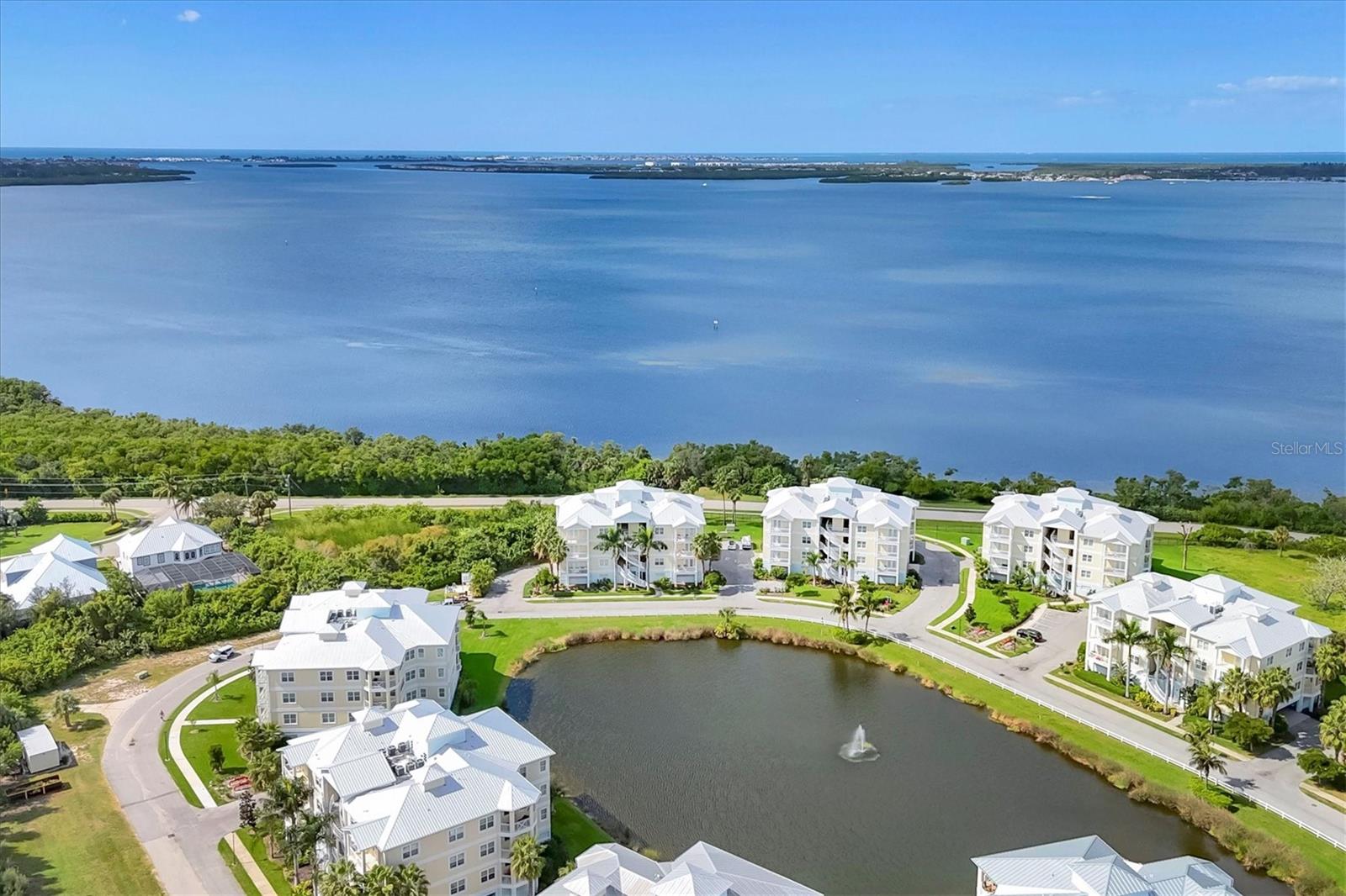 Welcome to Palma Sola Bay Club, an inviting coastal community where style and comfort meet the beauty of the bay. This top-floor residence offers sweeping views of Palma Sola Bay from every room, a backdrop that few homes can claim. A balcony extends the living area outdoors, ideal for morning coffee, evening cocktails, or just observing nature while enjoying the breeze. The kitchen features a large island and breakfast bar, perfect for casual dining or conversation while cooking dinner against the glow of the sunset. Inside, every detail has been thoughtfully chosen, from porcelain tile flooring throughout to custom valances and draperies that frame the view. High ceiling and 8-foot doors throughout with double doors opening to the primary suite, create a sense of arrival and understated grandeur. The suite includes an extended vanity in the bath and a custom-designed walk-in closet system. The split floor plan provides privacy, with a comfortable guest bedroom and full bath on the opposite side. An interior laundry room with upright freezer adds everyday convenience. Professionally decorated and offered turnkey furnished, the home is pristine and move-in ready. Two covered parking spaces and a private storage area are located beneath the building. Palma Sola Bay Club is a gated community offering a pool, clubhouse, bocce courts, putting green, dog park, and a sunset dock with kayak launch. A home where every day feels like a getaway, surrounded by comfort, elegance, and inspiring bay views.