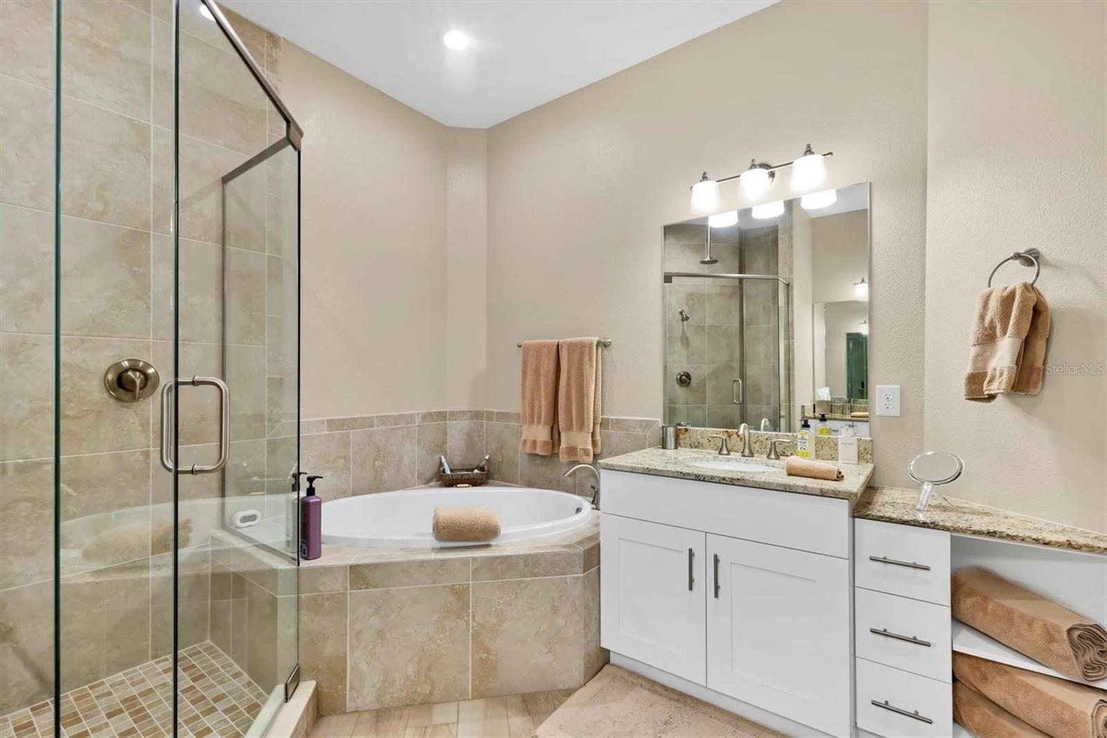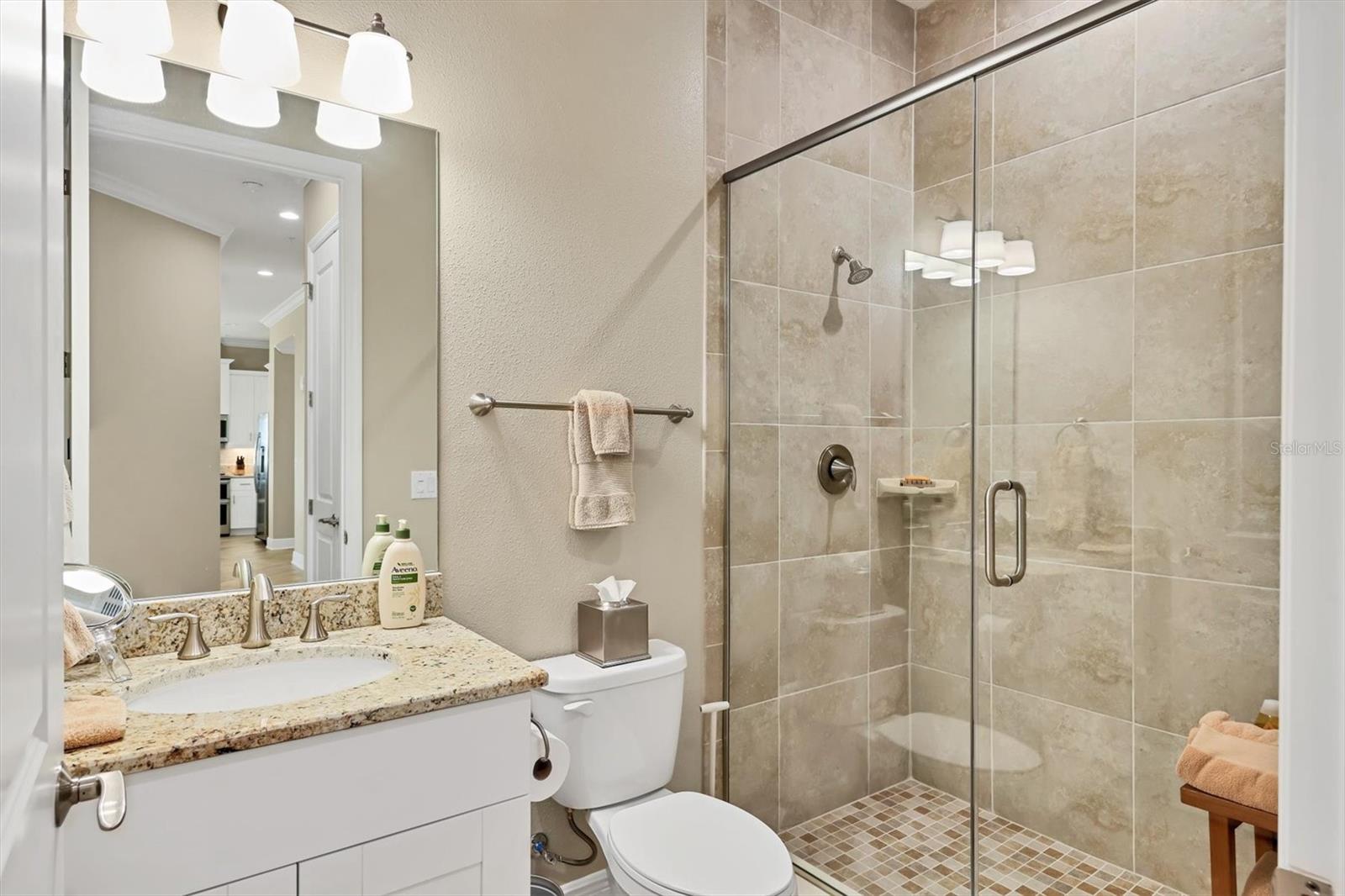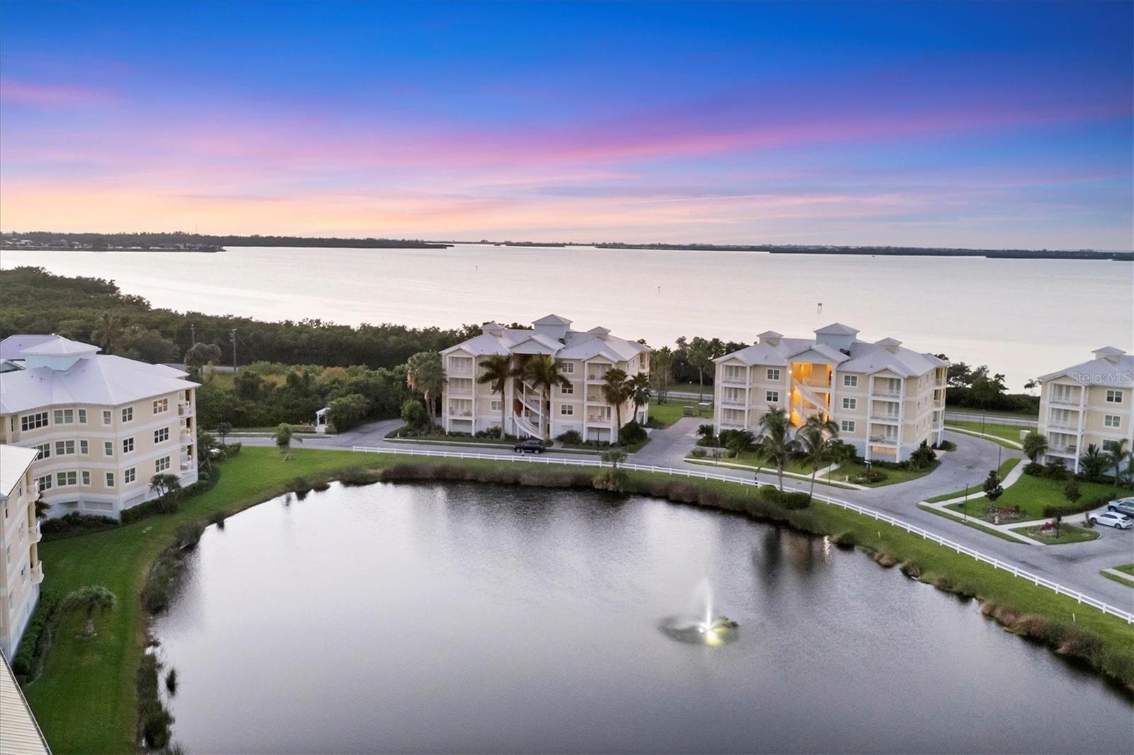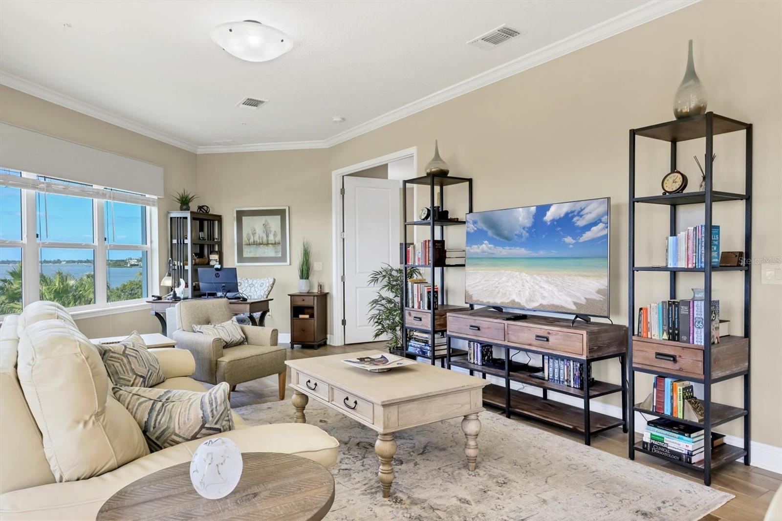 Welcome to Palma Sola Bay Club, an inviting coastal community where style and comfort meet the beauty of the bay. This top-floor residence offers sweeping views of Palma Sola Bay from every room, a backdrop that few homes can claim. A balcony extends the living area outdoors, ideal for morning coffee, evening cocktails, or just observing nature while enjoying the breeze. The kitchen features a large island and breakfast bar, perfect for casual dining or conversation while cooking dinner against the glow of the sunset. Inside, every detail has been thoughtfully chosen, from porcelain tile flooring throughout to custom valances and draperies that frame the view. High ceiling and 8-foot doors throughout with double doors opening to the primary suite, create a sense of arrival and understated grandeur. The suite includes an extended vanity in the bath and a custom-designed walk-in closet system. The split floor plan provides privacy, with a comfortable guest bedroom and full bath on the opposite side. An interior laundry room with upright freezer adds everyday convenience. Professionally decorated and offered turnkey furnished, the home is pristine and move-in ready. Two covered parking spaces and a private storage area are located beneath the building. Palma Sola Bay Club is a gated community offering a pool, clubhouse, bocce courts, putting green, dog park, and a sunset dock with kayak launch. A home where every day feels like a getaway, surrounded by comfort, elegance, and inspiring bay views.