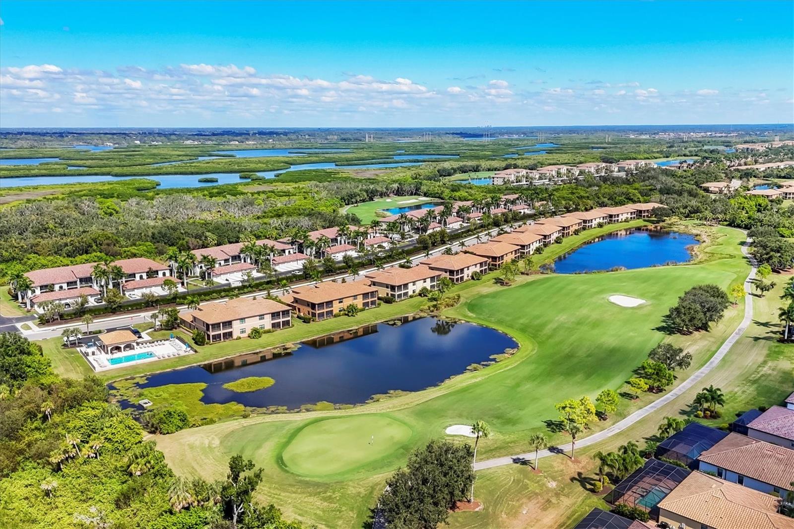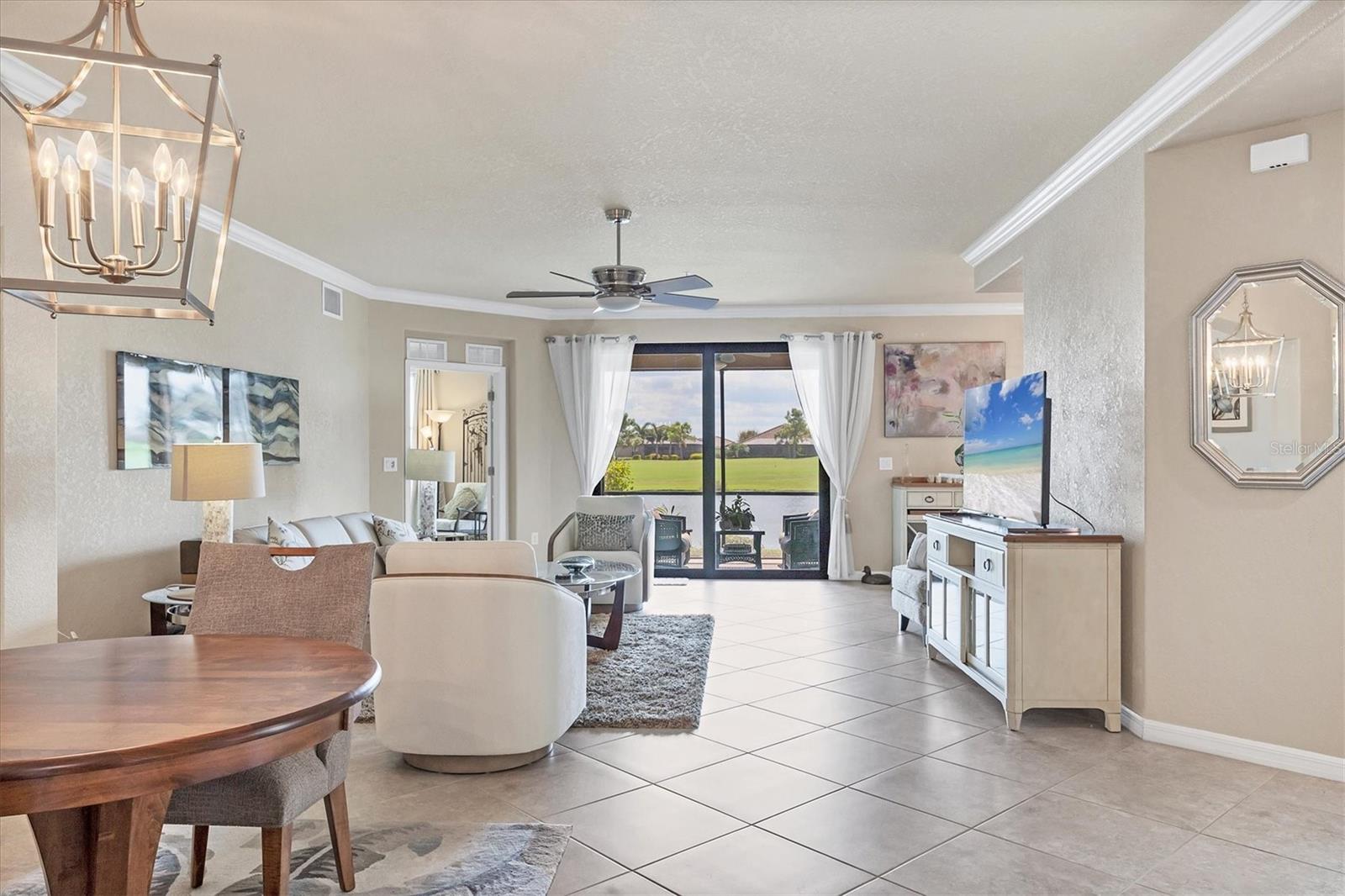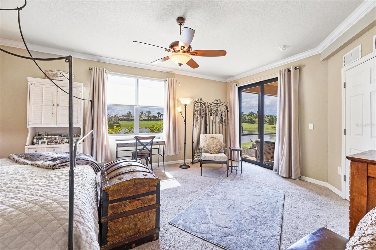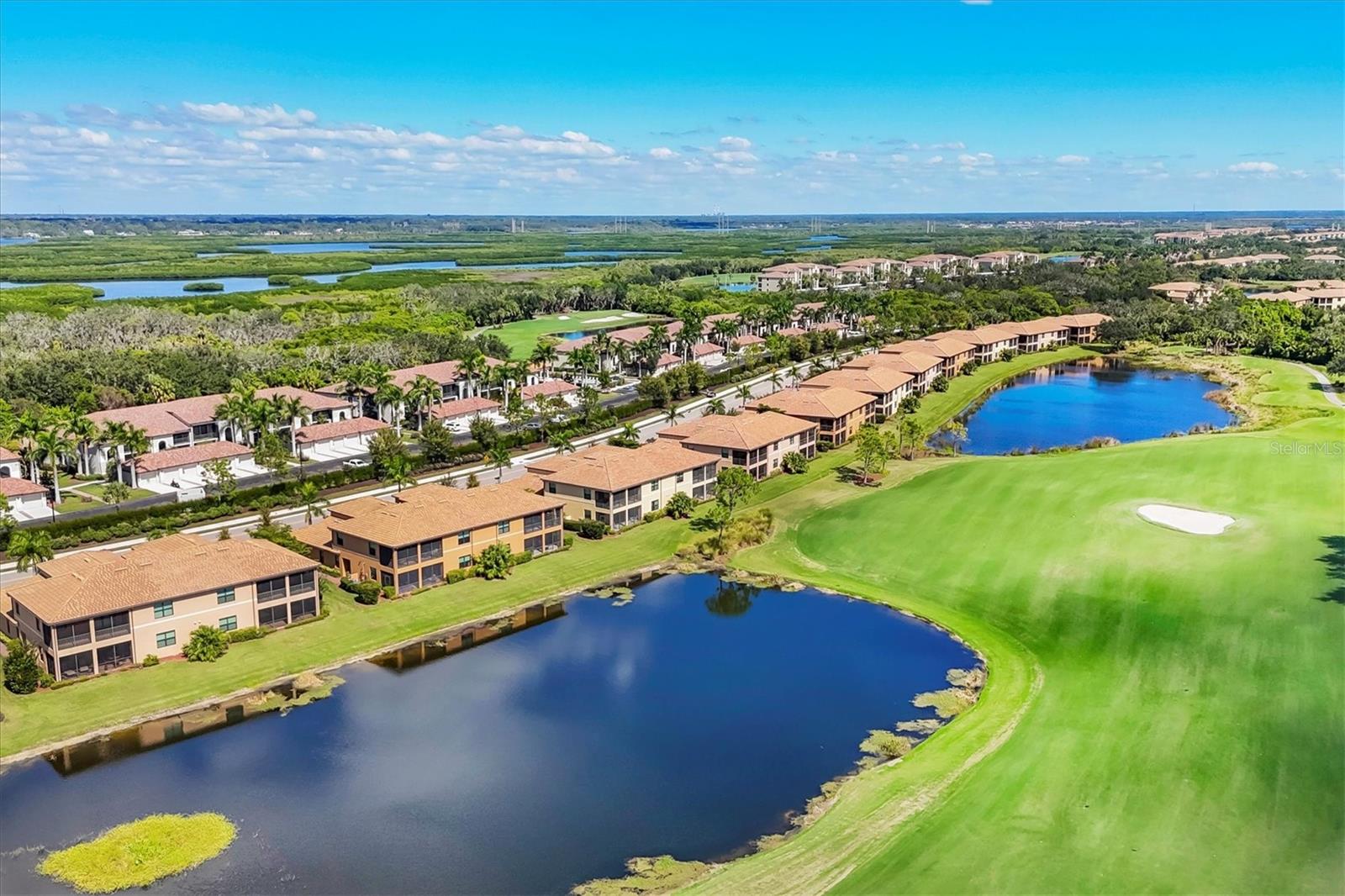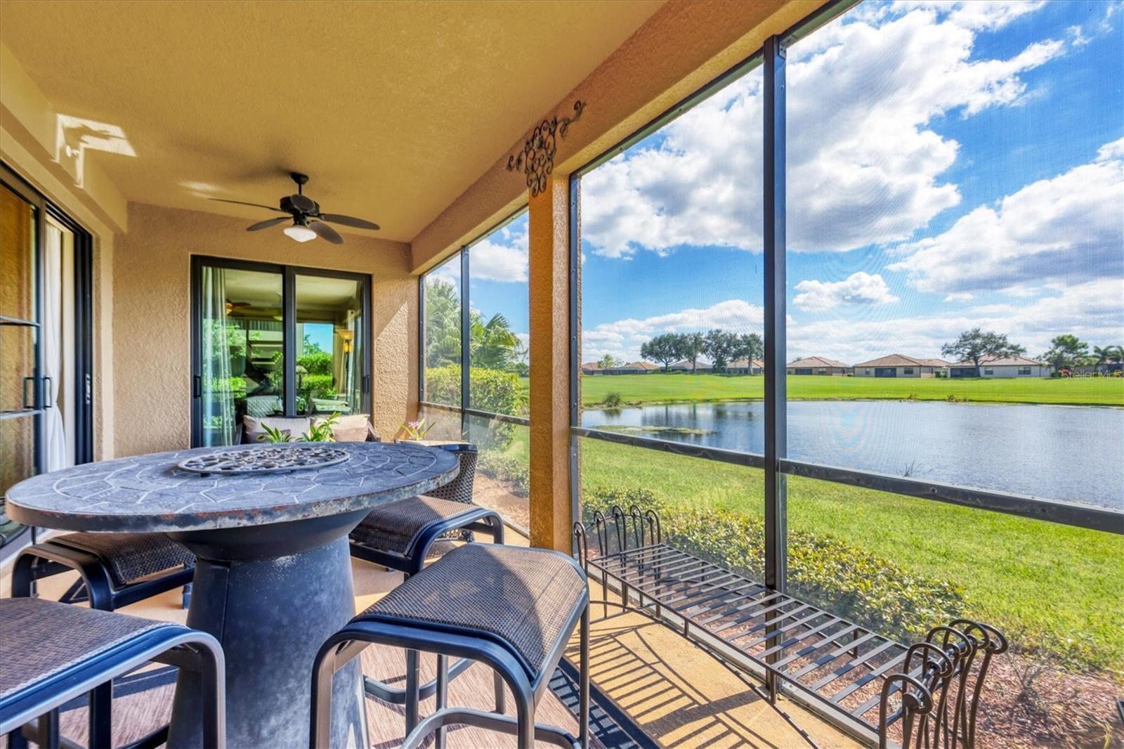 Are you ready for your perfect winter escape or full-time residence in a resort setting? This beautiful one-level Coach Home lives like a single-family home and includes a 2-car attached garage. Ideally positioned in exclusive River Strand Golf & Country Club, the home offers breathtaking water and golf course views from all main living areas and the primary bedroom. Enjoy iconic Florida sunsets from the spacious covered, screened, and furnished lanai, where you can dine in color-saturated comfort while watching the sky and its soft reflections dance across the lake. Inside, the home provides a fresh, neutral backdrop with newly custom-painted ceilings and walls in soft Alabaster, using high-quality Sherwin-Williams SuperPaint (photos were taken prior to repainting), allowing you to decorate and personalize with ease. One guest bedroom comes fully furnished, ready to welcome friends and family. The second bedroom features a wall of beautiful built-in shelving, making it ideal as a cozy home office or den, and it includes a closet should it be needed as a bedroom. The primary suite is a luxurious sanctuary, offering space, light, and serene water and golf views. You’ll love the two walk-in closets with custom creative organization, providing room for all garments and accessories. Be sure to notice the full-length mirror that doubles as a hidden storage door—a thoughtful and unique touch. Additional highlights include added cabinetry in the laundry room, custom shades and neutral window treatments throughout. Best of all, two major big-ticket items have already been replaced: the A/C and water heater, both just over a year old. River Strand Golf & Country Club is renowned for its exceptional amenities, and the exciting $8 million renovation of the main clubhouse, restaurant, and Tiki Bar area is nearly complete. A Social Membership is included with the purchase, granting full access to resort-style pools, the newly updated clubhouse, Tiki Terrace, fitness rooms and classes, tennis, popular pickleball, and a full calendar of social activities from trivia to live music—there truly is something for everyone. For many buyers, Social Membership is a very smart choice, offering the ability to play golf without priority while enjoying significant savings: approximately $520 per quarter in ongoing fees and $2,768 in reduced capital contribution and transfer fees at closing. River Strand is a beautifully maintained community in a highly convenient location with easy access to I-75 and just minutes to Lakewood Ranch, Sarasota, the Gulf beaches, St. Petersburg, and Tampa. Even better, Costco, Aldi, Target, medical services, and numerous shopping and dining options—including Seasons 52—are all located within Heritage Harbour and under 10 minutes away, with no major roads required. This home offers the perfect balance of peaceful living and everyday convenience. When you’re done waiting, schedule your appointment to see this beautiful abode—ready for your next chapter and sunshine-filled adventures.
