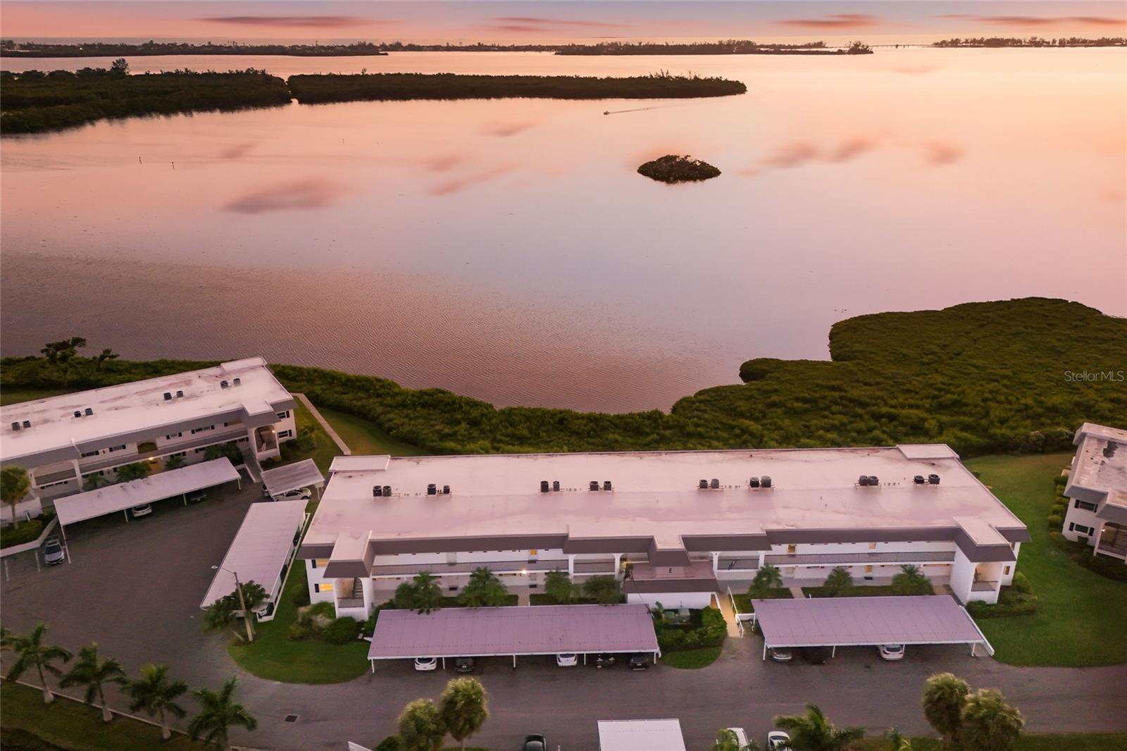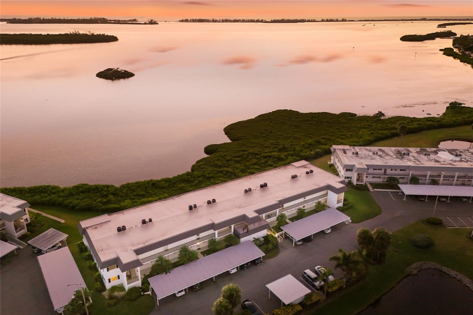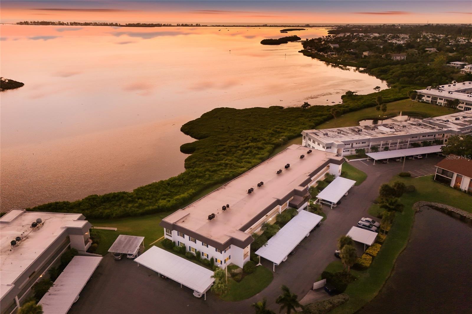 Welcome to Mount Vernon, a well-established 55 and over waterfront community consisting of condominiums, town homes, and single-family homes. The condominium you are looking at is located on the banks the intercoastal overlooking Sarasota Bay. The building is elevated to have been untouched during the hurricanes of 2024. The home has a panoramic view to the southwest from the wall-to-wall patio doors giving you fabulous sunsets most of the year. The same view is visible from the primary bedroom. The condominium consists of two bedrooms, two bathrooms, and a large open floor plan that spans nearly the entire length of the condominium. The original Florida room was opened to the home sometime in the past and is air conditioned. The kitchen overlooks the living area with a large granite countertop separating them. There are new vanities, sinks, plumbing fixtures and toilets in both bathrooms. The water heater, garbage disposal and dishwasher were replaced in 2025. The existing refrigerator works. However, seller will provide a credit at closing for a replacement. The condominium has been refreshed and is ready for your up-to-date personal touches. Your assigned parking space is right in front of your front door. The community is golf-cart friendly and has no upcoming assessments There is a community building with a gathering room with weekly activities, a pool, pickle ball courts, shuffleboard court and walking and bike paths. This is a perfect snowbird community. It is just what you need to get away from winter and enjoy living in paradise. Did I forget to say that you are about two miles from the gorgeous beaches of Anna Maria Island and short drive to shopping, restaurants, hospitals, and Sarasota Airport.