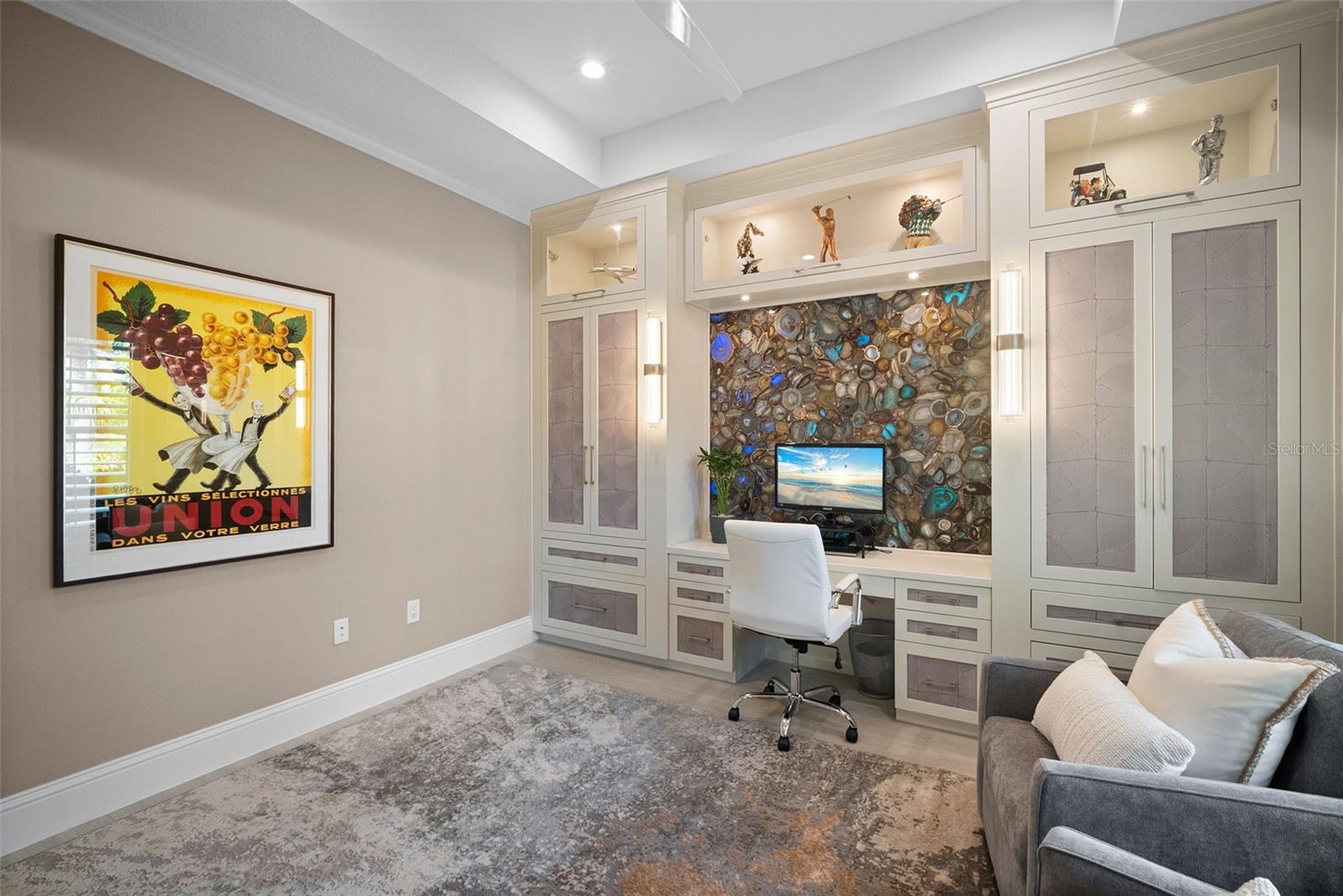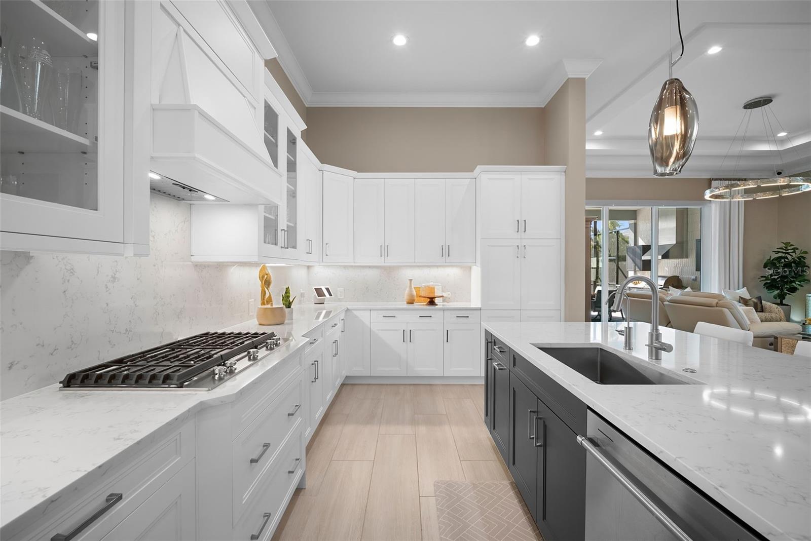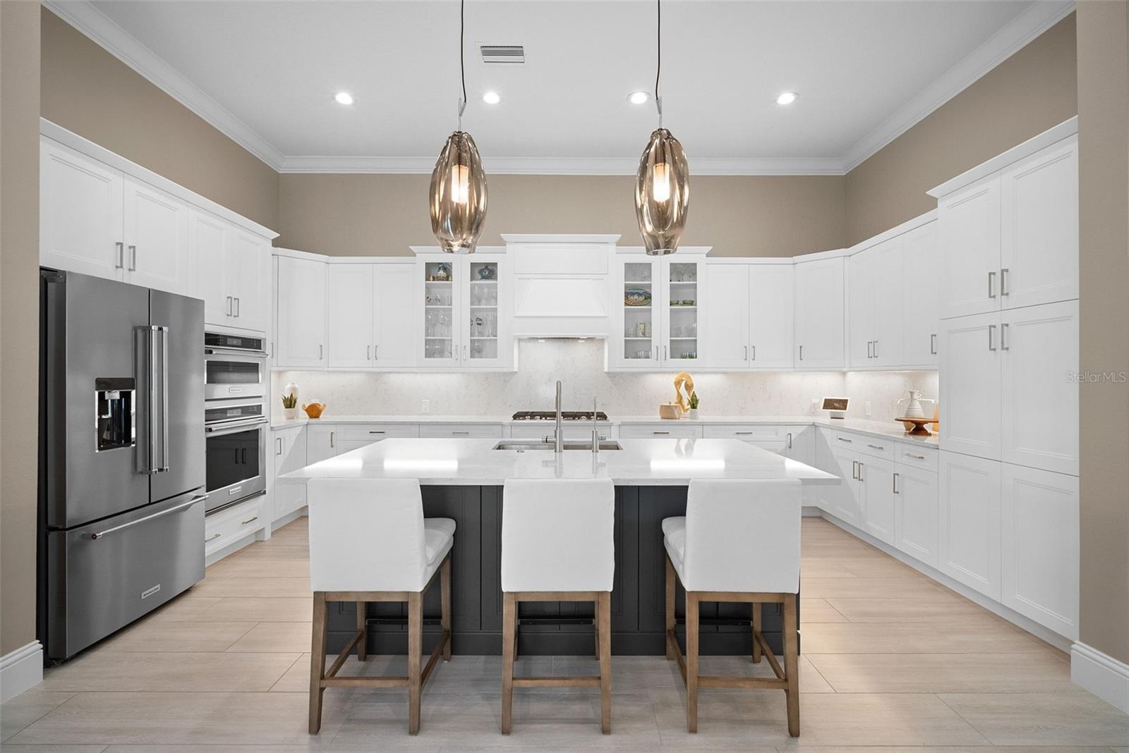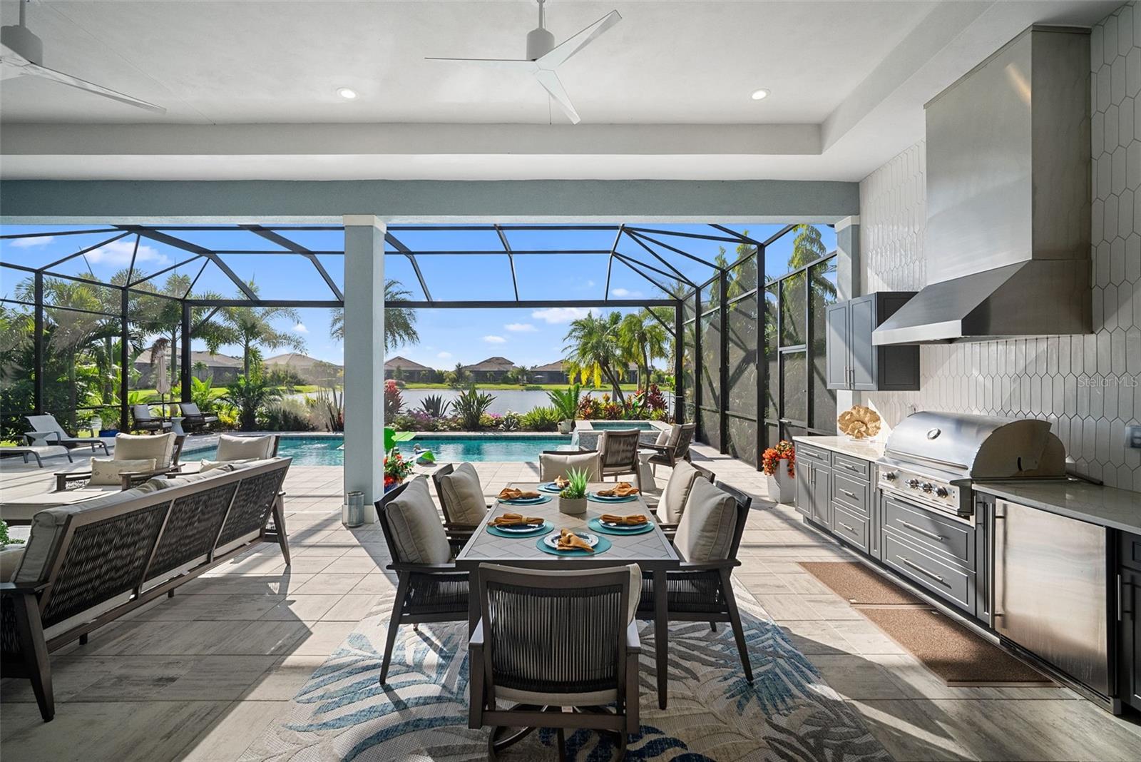 Welcome to luxury living at its finest in The Lake Club — Lakewood Ranch’s premier gated community. This exceptional residence offers a spacious 3 bedrooms, 3.5 bathrooms, a private office, and a 3-car garage across 2,638 square feet of beautifully designed living space. The open-concept kitchen, living, and dining areas are ideal for entertaining or relaxing in style, with high-end finishes including crown molding, tray ceilings, updated lighting, and electric blinds in the living, dining, and office areas. Step outside to your outdoor oasis — a sprawling ~1,400 sq ft screened lanai with a saltwater pool and spa, full outdoor kitchen featuring a Blaze grill, wet bar, dry bar, and TV cabinet. Enjoy west-facing water views and unforgettable sunsets over the tranquil lake and with no homes directly across the street you will enjoy the pleasing green space for added privacy and serenity. Every detail has been thoughtfully curated: built-in closets throughout, ceiling fans in all bedrooms, office, and lanai, a full home Generac generator, hurricane-rated windows and doors, and lanai hurricane screens to protect your outdoor living space, whole-home water purification and softener, alarm system with cameras, and a climate-controlled garage. The custom mature landscaping and exterior lighting elevate the curb-appeal and create a truly enchanting ambiance. Experience a lifestyle of comfort, security, and sophistication in this meticulously maintained home. Live life well at The Lake Club — where luxury, privacy, and sunset views await.
