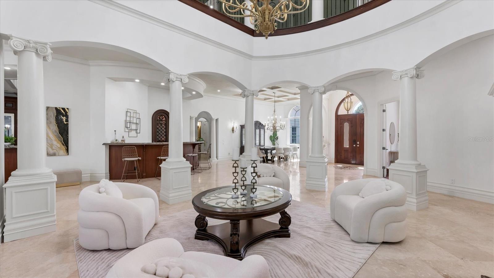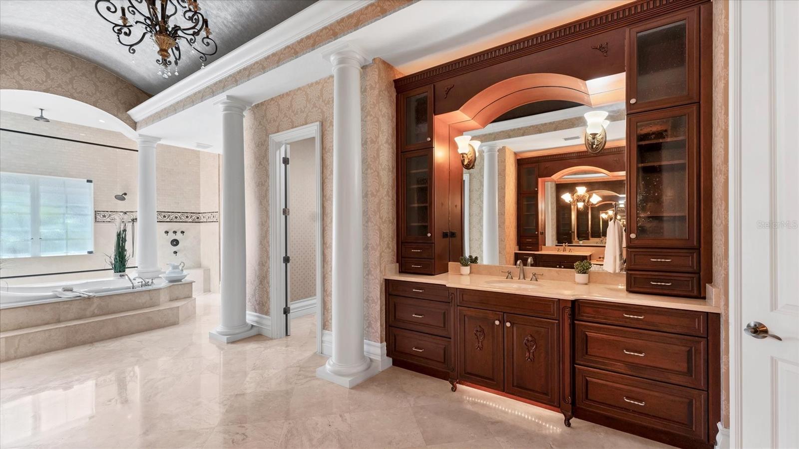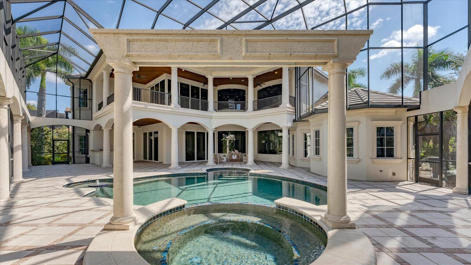 Experience iconic luxury living in The Concession! This former St. Andrews showcase model by Pruett Builders is a masterful display of craftsmanship and grandeur, on a private .78-acre lakefront homesite in The Concession, one of the region’s exclusive, championship golf communities. A circular paver driveway with a centerpiece fountain and lush landscaping creates an unforgettable arrival. Double doors open into a dramatic foyer where a striking onyx medallion inlaid into rectified travertine sets the tone for the home’s opulence. Palatial columns, intricate ceiling designs, rich moldings and elegant fixtures elevate every space. The 26-foot ceilings in the living room are accentuated by an Emperador marble fireplace, aquarium glass windows and a graceful curved wet bar with wine cellar, designed to impress while seamlessly servicing the grand dining room and adjacent entertaining area. The gourmet kitchen is a chef’s dream, featuring custom cabinetry, a Wolf double range with six burners, griddle and grill, Sub-Zero paneled refrigerator/freezer, hammered copper farmhouse sink, dual dishwashers, expansive hidden pantry and island with prep sink. A great room and breakfast nook flow effortlessly from this culinary space. The first-floor primary suite is a private retreat with pool views, raised sitting area, morning bar, and lanai access. The spa-inspired bath boasts a Jacuzzi tub, dual-entry Roman shower with five showerheads, dual water closets, and an extraordinary 9-by-31-foot boutique-style custom closet with glass display cabinetry. An additional large guest suite with built-ins is on the main level. Upstairs, an elevator or sweeping curved staircase with iron details leads to a vast loft that serves as recreation and billiards area, complete with a wet bar, refrigerator, microwave and drawer dishwasher. Three additional en suite guest suites with custom walk-in closets, a multipurpose office/bonus room, and access to the sweeping balcony with panoramic lake views complete the upper level. Entertain in style inside the 12-seat theater with recliners, projector, wet bar, cooler and microwave. Outdoor living is equally impressive with a screened saltwater Pentair heated pool and spa featuring a columned waterfall and sun shelf, outdoor kitchen, and expansive covered lounging areas. Additional highlights include two offices, one with elegant wood flooring and abundant natural light, and the other with built-in desks, two laundry rooms, two powder rooms, every closet fully customized and four-car side-load garage. In The Concession, home to a renowned 18-hole championship course, Jack Nicklaus-designed par-3 course, golf training facility, and host of prestigious PGA tournaments including the 2021 World Golf Championship, 2023 World Champions Cup, and Senior PGA Championship for three consecutive years beginning in 2026. Club members enjoy dining at The Bistro, sipping a cocktail at the Bistro Bar, or accommodating guests at on-site luxury lodges and casitas. Positioned off University Parkway, this home offers effortless access to UTC Mall, vibrant Waterside Place, Sarasota Polo Club, premier shopping, exceptional dining, and local attractions like the Mote SEA Aquarium. Enjoy quick commutes to downtown Sarasota with its renowned arts, culture and pristine Gulf beaches. Don’t miss your chance to own this exceptional property in the nation’s top-selling, multigenerational, planned community.