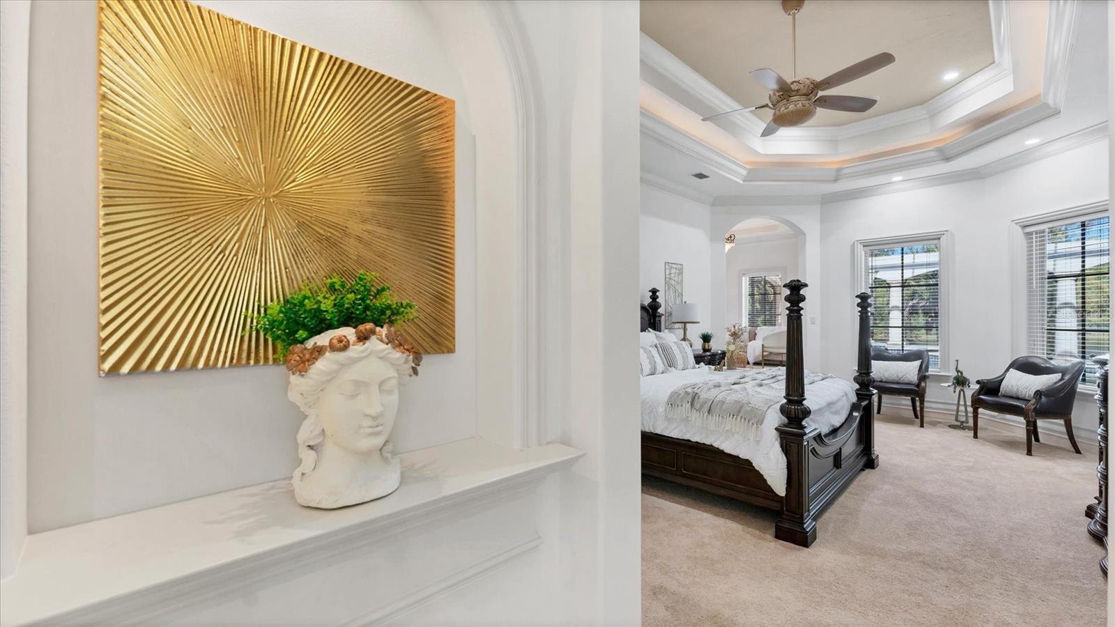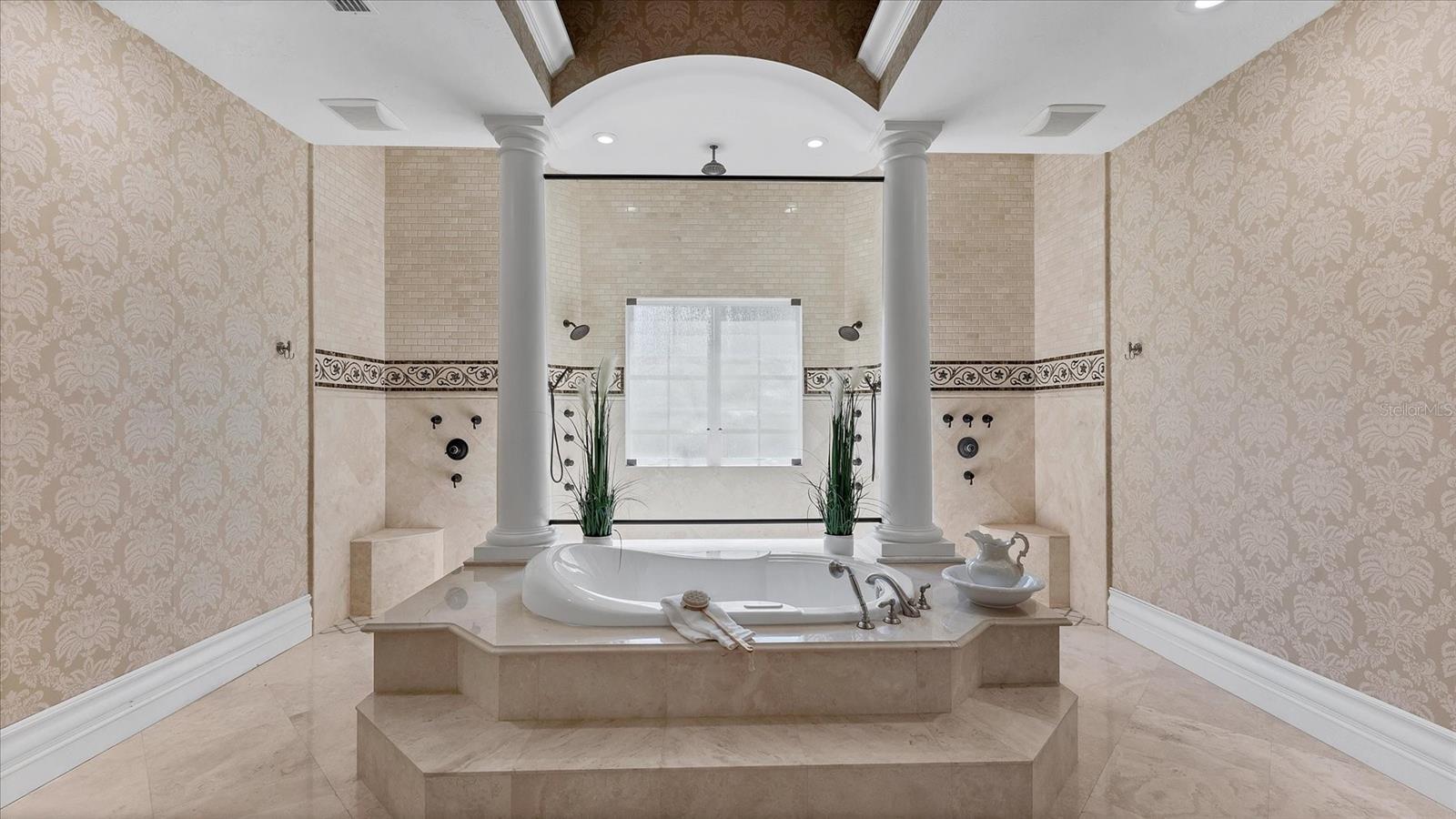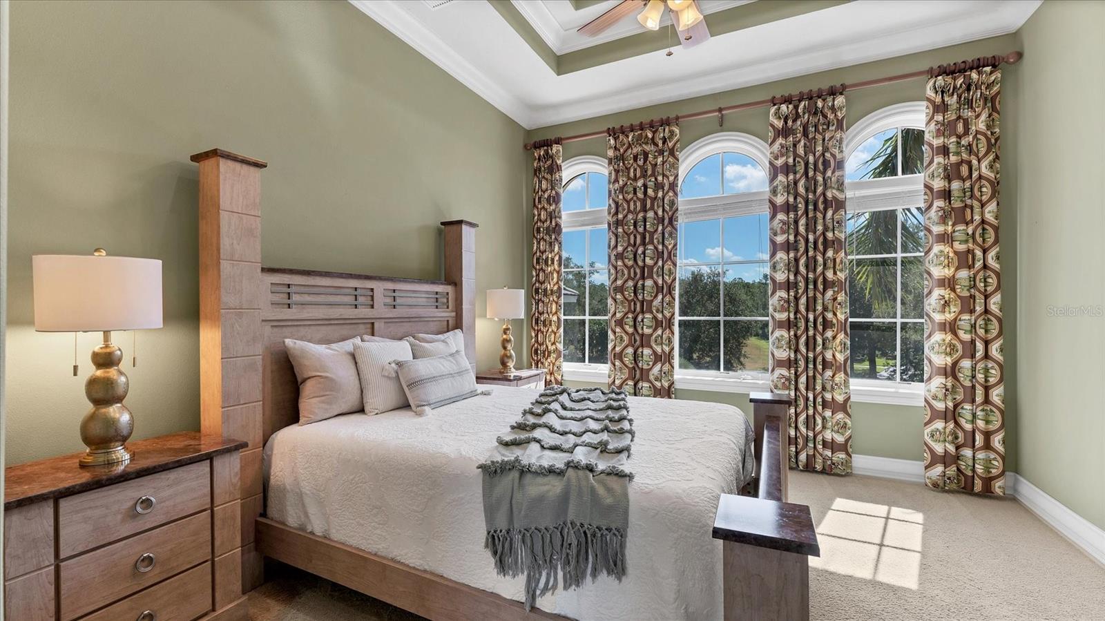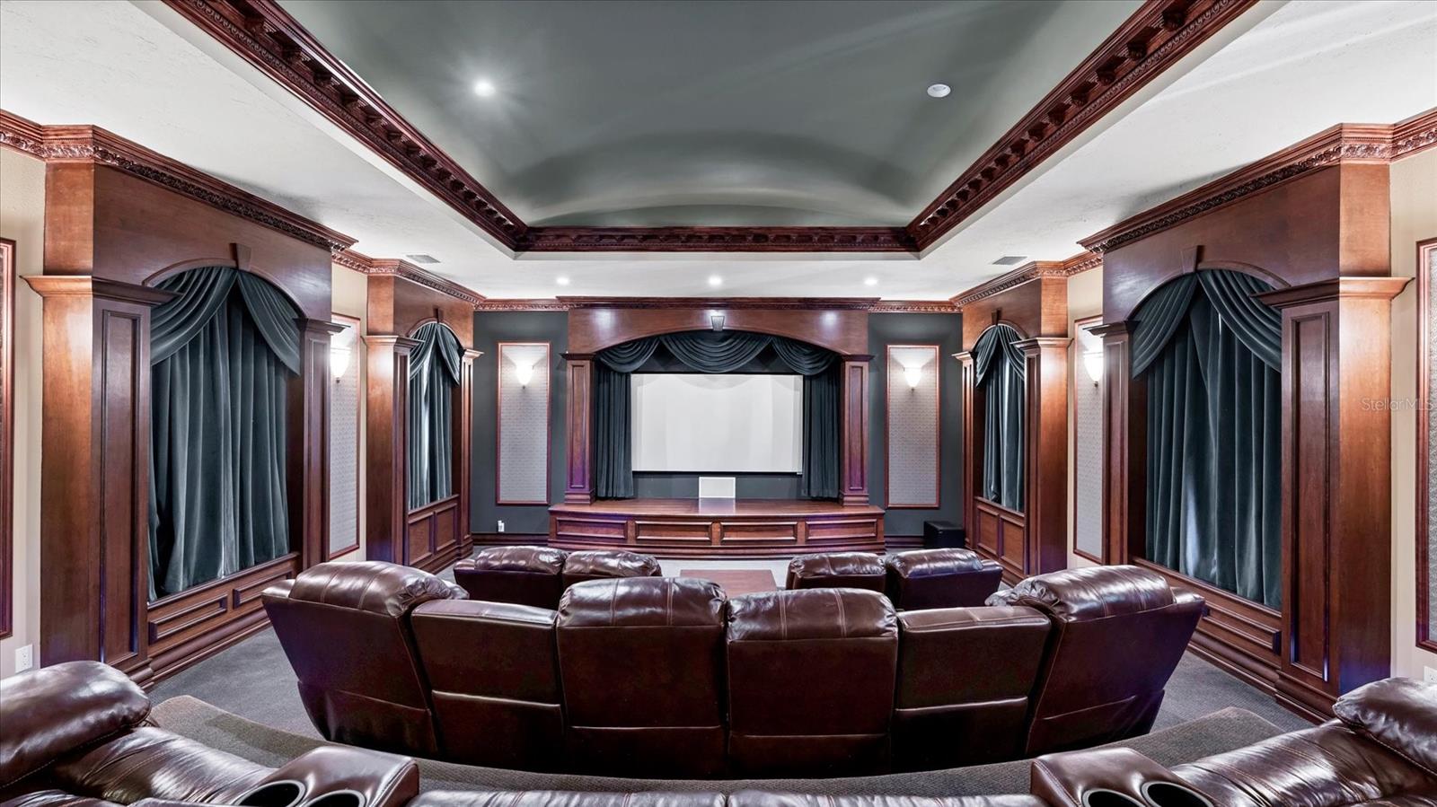 Experience iconic luxury living in The Concession! This former St. Andrews showcase model by Pruett Builders is a masterful display of craftsmanship and grandeur, on a private .78-acre lakefront homesite in The Concession, one of the region’s exclusive, championship golf communities. A circular paver driveway with a centerpiece fountain and lush landscaping creates an unforgettable arrival. Double doors open into a dramatic foyer where a striking onyx medallion inlaid into rectified travertine sets the tone for the home’s opulence. Palatial columns, intricate ceiling designs, rich moldings and elegant fixtures elevate every space. The 26-foot ceilings in the living room are accentuated by an Emperador marble fireplace, aquarium glass windows and a graceful curved wet bar with wine cellar, designed to impress while seamlessly servicing the grand dining room and adjacent entertaining area. The gourmet kitchen is a chef’s dream, featuring custom cabinetry, a Wolf double range with six burners, griddle and grill, Sub-Zero paneled refrigerator/freezer, hammered copper farmhouse sink, dual dishwashers, expansive hidden pantry and island with prep sink. A great room and breakfast nook flow effortlessly from this culinary space. The first-floor primary suite is a private retreat with pool views, raised sitting area, morning bar, and lanai access. The spa-inspired bath boasts a Jacuzzi tub, dual-entry Roman shower with five showerheads, dual water closets, and an extraordinary 9-by-31-foot boutique-style custom closet with glass display cabinetry. An additional large guest suite with built-ins is on the main level. Upstairs, an elevator or sweeping curved staircase with iron details leads to a vast loft that serves as recreation and billiards area, complete with a wet bar, refrigerator, microwave and drawer dishwasher. Three additional en suite guest suites with custom walk-in closets, a multipurpose office/bonus room, and access to the sweeping balcony with panoramic lake views complete the upper level. Entertain in style inside the 12-seat theater with recliners, projector, wet bar, cooler and microwave. Outdoor living is equally impressive with a screened saltwater Pentair heated pool and spa featuring a columned waterfall and sun shelf, outdoor kitchen, and expansive covered lounging areas. Additional highlights include two offices, one with elegant wood flooring and abundant natural light, and the other with built-in desks, two laundry rooms, two powder rooms, every closet fully customized and four-car side-load garage. In The Concession, home to a renowned 18-hole championship course, Jack Nicklaus-designed par-3 course, golf training facility, and host of prestigious PGA tournaments including the 2021 World Golf Championship, 2023 World Champions Cup, and Senior PGA Championship for three consecutive years beginning in 2026. Club members enjoy dining at The Bistro, sipping a cocktail at the Bistro Bar, or accommodating guests at on-site luxury lodges and casitas. Positioned off University Parkway, this home offers effortless access to UTC Mall, vibrant Waterside Place, Sarasota Polo Club, premier shopping, exceptional dining, and local attractions like the Mote SEA Aquarium. Enjoy quick commutes to downtown Sarasota with its renowned arts, culture and pristine Gulf beaches. Don’t miss your chance to own this exceptional property in the nation’s top-selling, multigenerational, planned community.