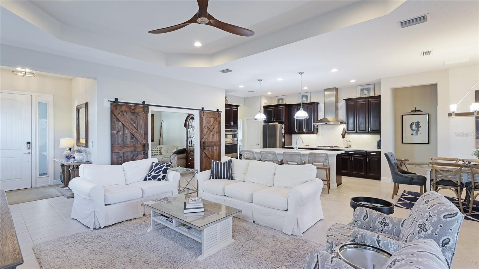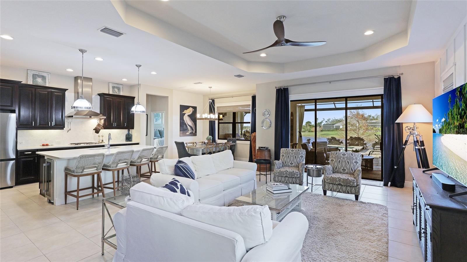 Enjoy incredible double lake views, with incredible sunsets. Turnkey just bring your toothbrush and bathing suit. If you like Peace and Quiet, plus the security of a gated community with only 50 homes on 53 acres, and only minutes' drive to the Anna Maria Island Beaches this home is for you. The Estuary Community was built by Neal Homes in 2018/2020 within Robinson Preserve where there are walking, running, biking trails, and kayak launch with trails so you can enjoy the water and nature. This home has it all a custom-built heated saltwater pool with spa, comfy pool loungers. View the lake through the upgraded 45' clear screen, that includes automatic bug spraying system or get out of the sun into the 28'x13' lanai equipped with custom powered remote control Kevlar viewing Hurricane Screens, a nice gas grill hooked to natural gas for all your cookouts. When you walk in the foyer will notice the oversized open floor plan with 18x18 tile plantation blinds, custom ceiling fan, custom mill work on the wall. The gourmet kitchen has 42" Tall Expresso cabinets, quartz countertops, stainless appliances, an oversized island, GE monogram range hood, gas cook top, wine fridge, new dishwasher, refrigerator with beverage bar, walk in pantry, plus a extra closet. Home is sold turnkey furnished with many pieces and lights from Restoration Hardware. If you need an office or extra space, there is a bonus room off the living room with barn doors. Coffered ceiling, double walk-in closets, and a large ensuite. Call to book appt today.