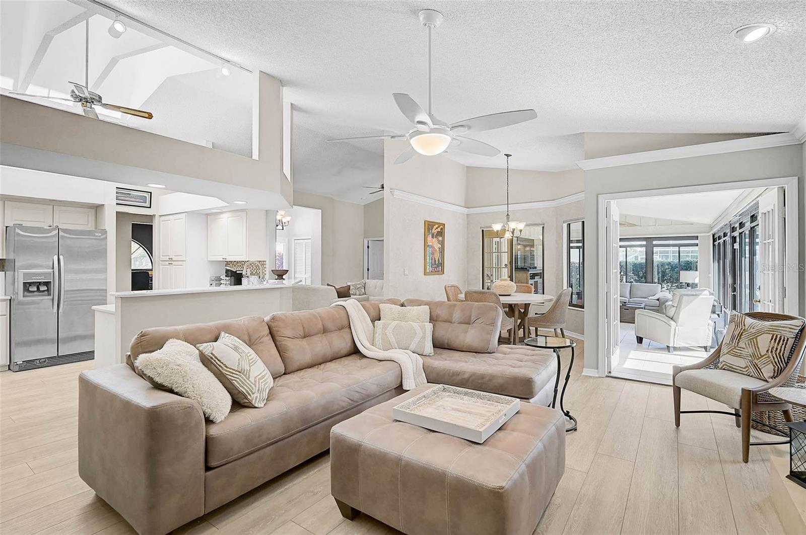 Gorgeous, Model-Perfect 3BR/2BA plus Den home on a Private Corner Lot! Step into this stunning home offering 2,512 square feet of beautifully designed living space. The entry welcomes you with a striking wood beam ceiling, adding warmth and architectural interest, creating a grand first impression. Situated on a quiet corner lot, the private backyard includes a paver courtyard, organic garden, and plenty of space for a pool—ideal for entertaining or relaxing in style. Inside, engineered wood floors flow throughout, creating warmth and elegance. The primary suite is a serene retreat with dual walk-in closets and a spa-like bathroom featuring dual sinks, a soaking tub, and a separate shower. High ceilings enhance the open, airy feel throughout the home. The enclosed lanai, accessed through three sets of French hurricane doors, features hurricane-protected windows and a new split A/C unit for year-round comfort. The kitchen is bright and inviting with new skylights (2024), a tile backsplash, new dishwasher, and a Culligan reverse osmosis system under the sink. Recent upgrades also include a new roof (2024), new hot water heater, new washer and dryer, and new garbage disposal, making this home completely move-in ready. Additional features include a Hydrawise irrigation that is Wi-Fi accessible, a water softener, and a cozy wood-burning fireplace in the living area. Peridia offers an active lifestyle with an executive 18-hole golf course, tennis, pickleball, heated pool, tiki bar, restaurant & bar, and pro shop. Ideally located, this home is close to shopping, airports, restaurants, and some of the best beaches in Florida, offering both convenience and lifestyle. Additional Fees: $938 quarterly master association fee, $450 annual food/beverage minimum, $100 one-time application fee, $4,000 one-time capital reserve.