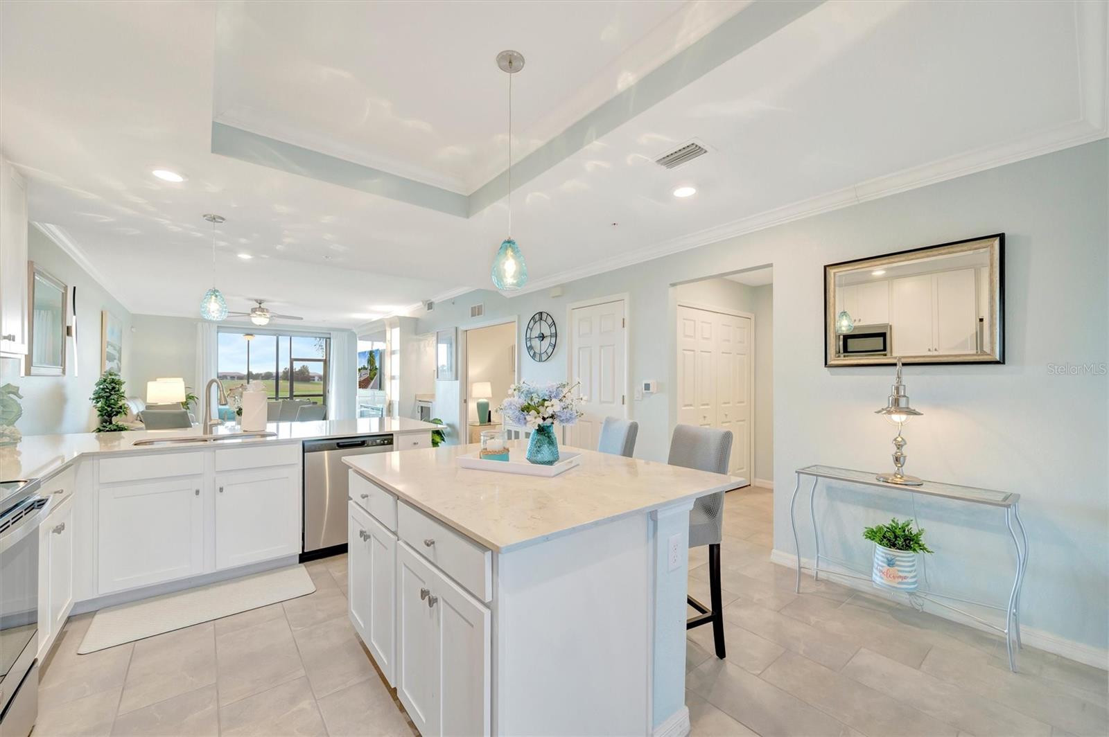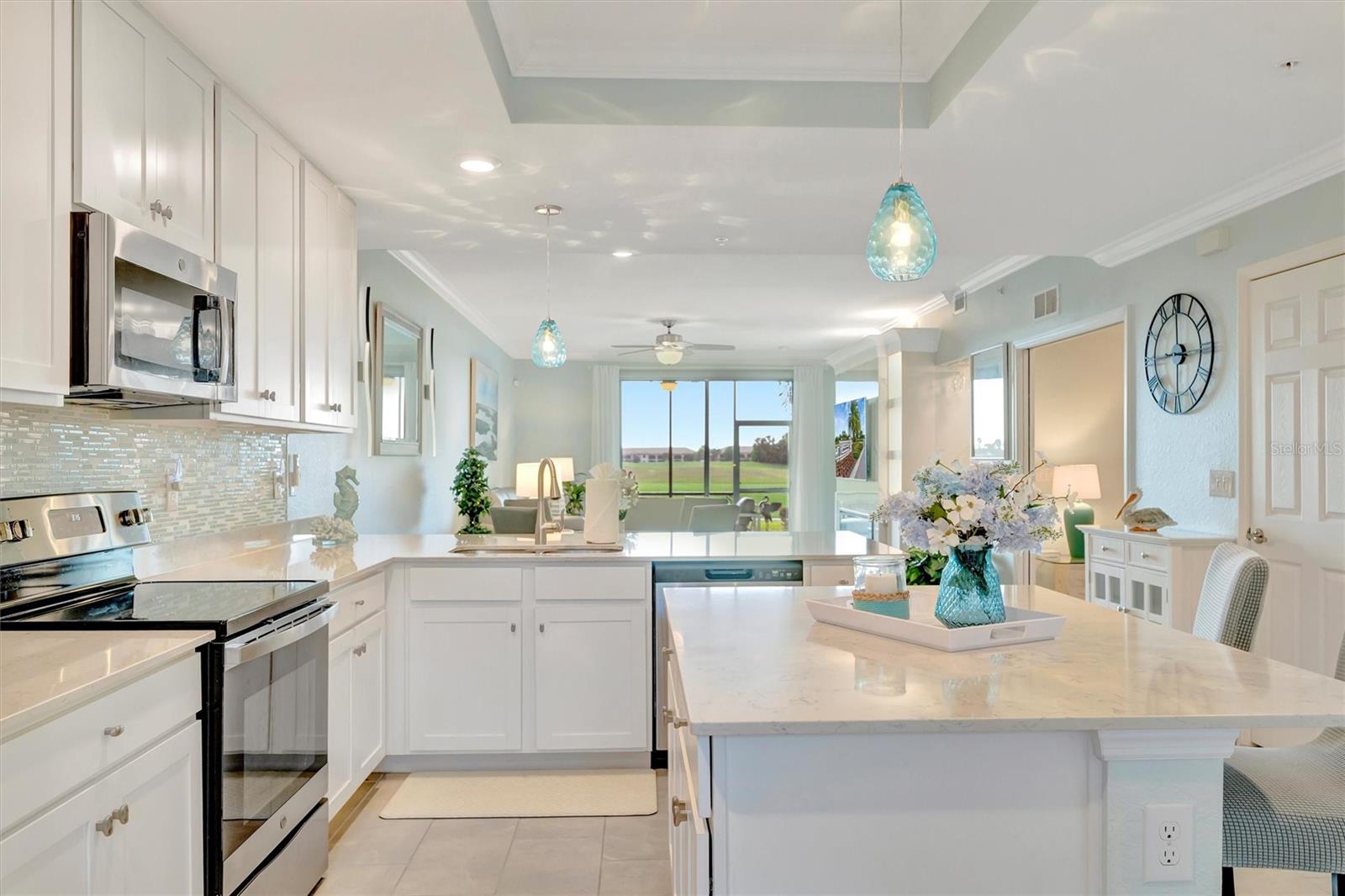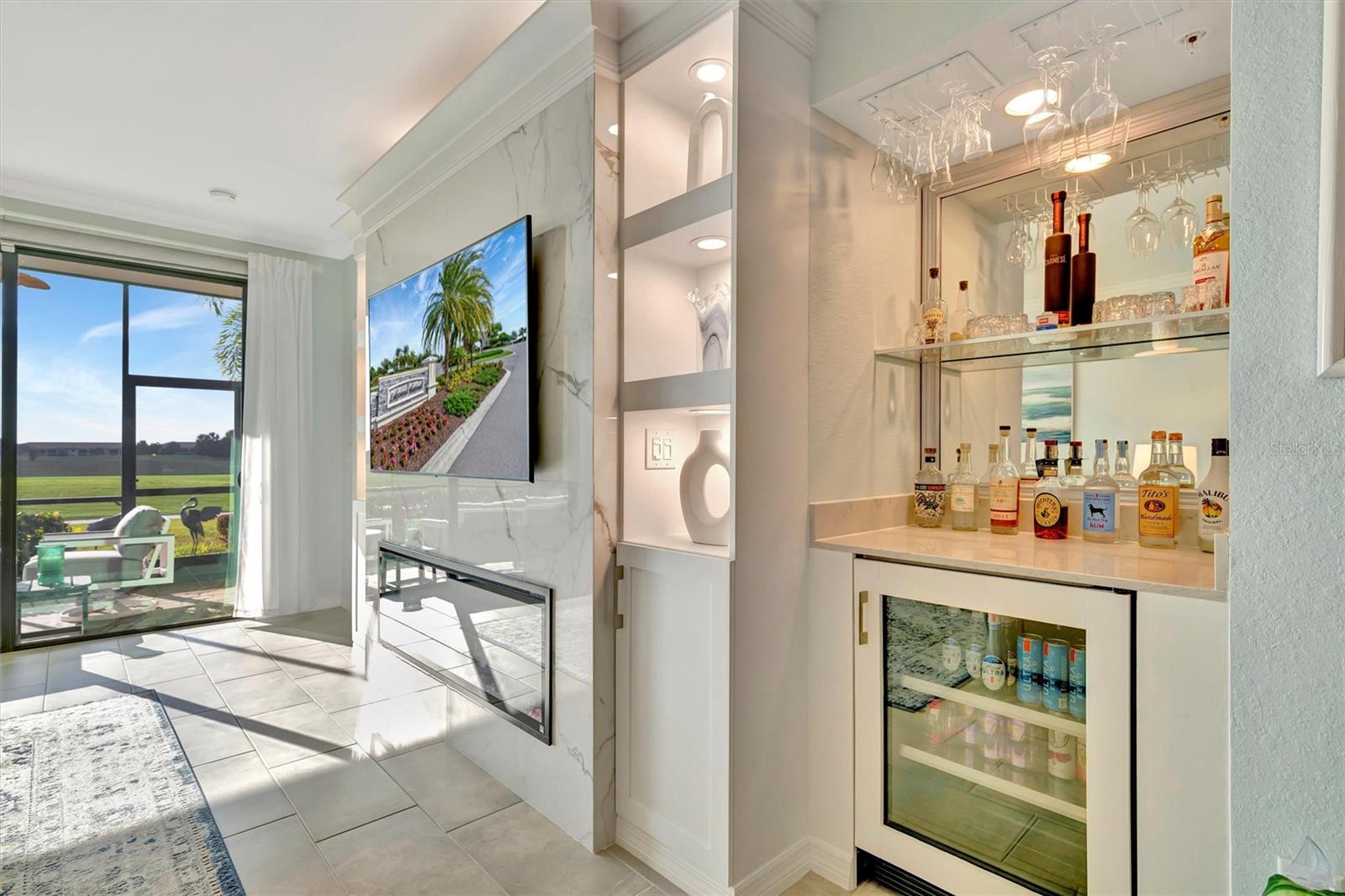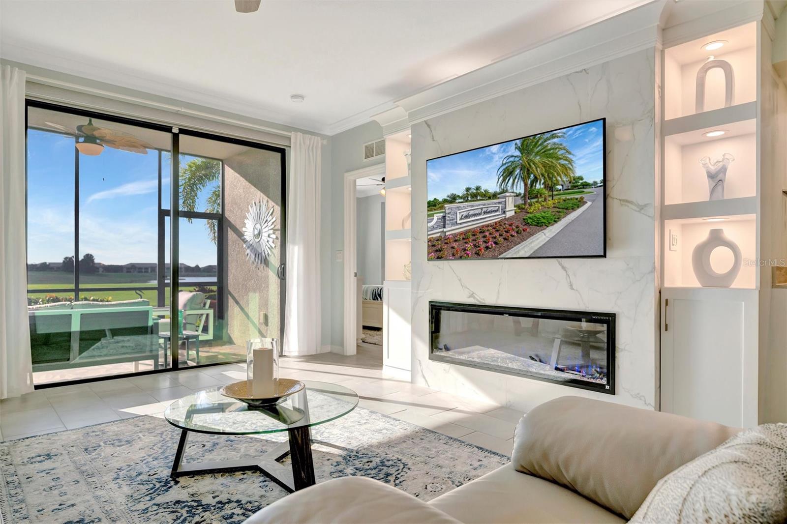 This exquisite home in the prestigious Lakewood National Golf community is a true gem, featuring a wealth of luxurious upgrades that enhance its charm and functionality. Step inside to find stunning luxury vinyl plank flooring that flows seamlessly through the spacious bedrooms, and the den,which can also be used as another bedroom. In the master bathroom, indulge in a spa-like experience with elegant glass shower doors that add a touch of sophistication. Thoughtfully designed custom closets throughout the home offer ample storage, while the striking custom media wall, complete with a cozy electric fireplace, creates an inviting focal point in the living area. Entertain guests effortlessly in the wet bar area, which comes equipped with a specialty refrigerator, perfect for keeping your favorite drinks cool. The kitchen dazzles with custom lighting that illuminates the space beautifully, complemented by fresh, custom paint throughout the home that creates a warm and welcoming ambiance. Enjoy the convenience of motorized shades that provide privacy and control for the large sliders in the kitchen and living area. Finally, the garage features a sleek epoxy-coated floor, adding to the home's overall appeal. Nestled on the 10th hole of the picturesque Piper course, this property offers both luxury and an enviable location for golf enthusiasts,GOLF MEMBERSHIP Included.Enjoy tons of amenities which include;zero entry pool with two waterfalls,tiki bar,fitness center,full service spa,pickleball,tennis,bocce ball and a gorgeous 28,000-square foot clubhouse!