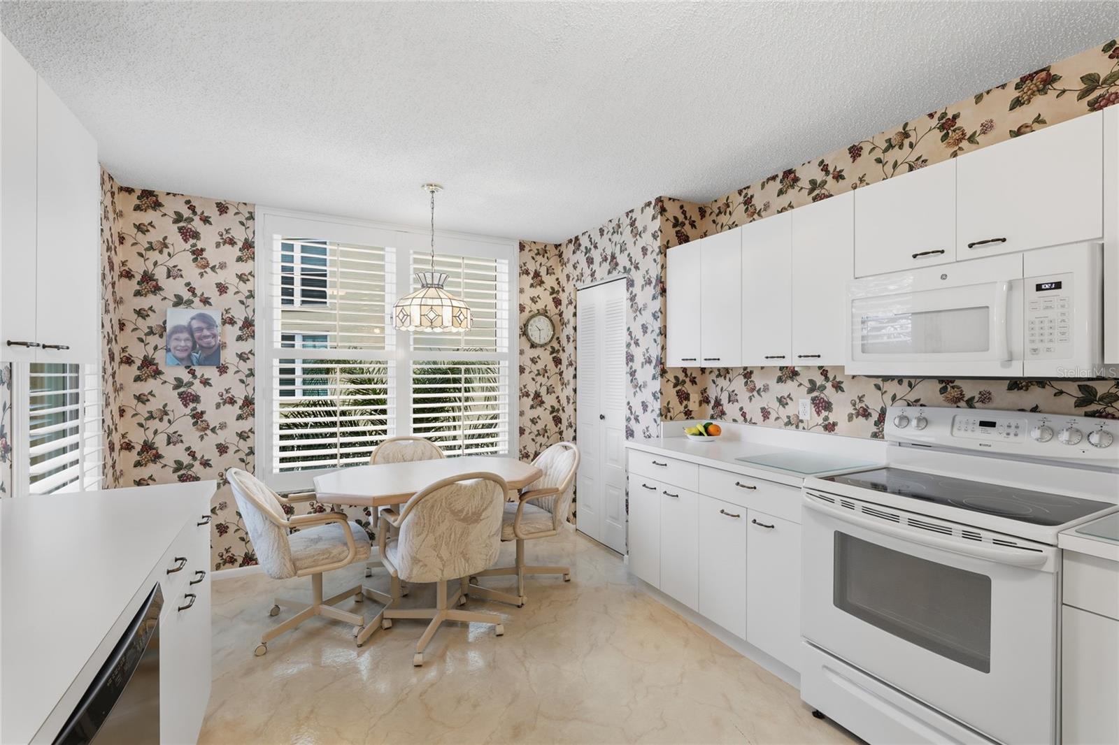 Welcome to this Pinebrook corner Condominium offering additional windows and natural daylight where you'll find the comfort and livability you'd expect from a home due to the well thought out floorplan offering a generous 1406 square footage of living area. Enjoy the convenience of having a bonus room that is currently set up as a Study along with 2 Bedrooms and two Bathrooms. An expansive 17' x 12' kitchen offers abundant coveted counter and cabinet storage space along with a pantry closet and charming Breakfast Nook area where you can savor your meals while taking in views of the outdoors. This home is inviting and comfortable! It has been tastefully decorated with quality finishes including plantation shutters, crown molding, 2018 impact windows and sliding glass doors, an electric fireplace, a 2023 A/C, hardwood floors, berber carpeting in the bedrooms, tile on the diagonal in the lanai, ceiling fans, updated bathrooms that feature modern mirrors and fixtures, an attractive custom built-in wall unit in the Study/Bonus Room, a new washer and dryer and 3 built-in large cabinets in the Laundry Room for added extra storage that make it a standout feature of that space. Wind down as evening sets in and soak in the views of the golf course and pond from your lanai. Enjoy resort style living with pay as you play golf, tennis courts, pickleball, a fitness workout room, bbq facility, a Golf Pro Shop, Clubhouse, pool, fitness and recreation center. Your monthly fee of $636 covers water, sewer, trash, basic cable, internet and pest control. You'll have your own assigned covered carport right across from the elevator in addition to a designated storage unit. This is a pet and age friendly building. You'll love the convenience of the nearby Sarasota/Bradenton airport, GT Bray Park, Tampa, Florida State University, St. Armand's Circle and Bradenton's beautiful beaches less than 7 miles away!