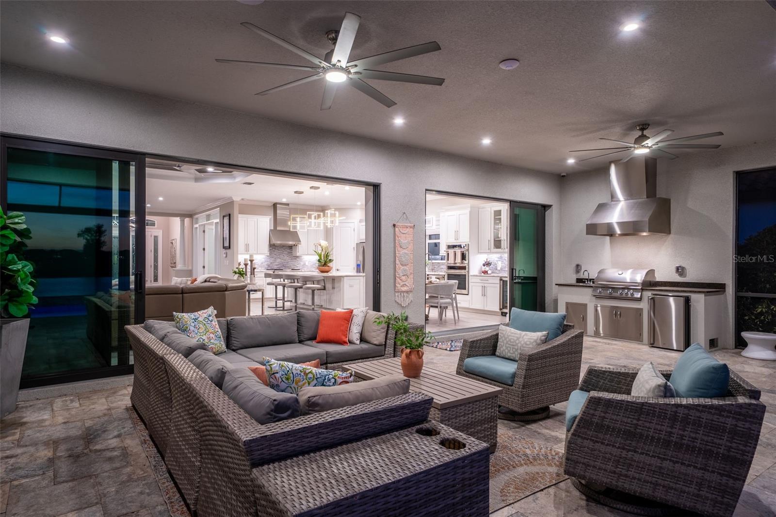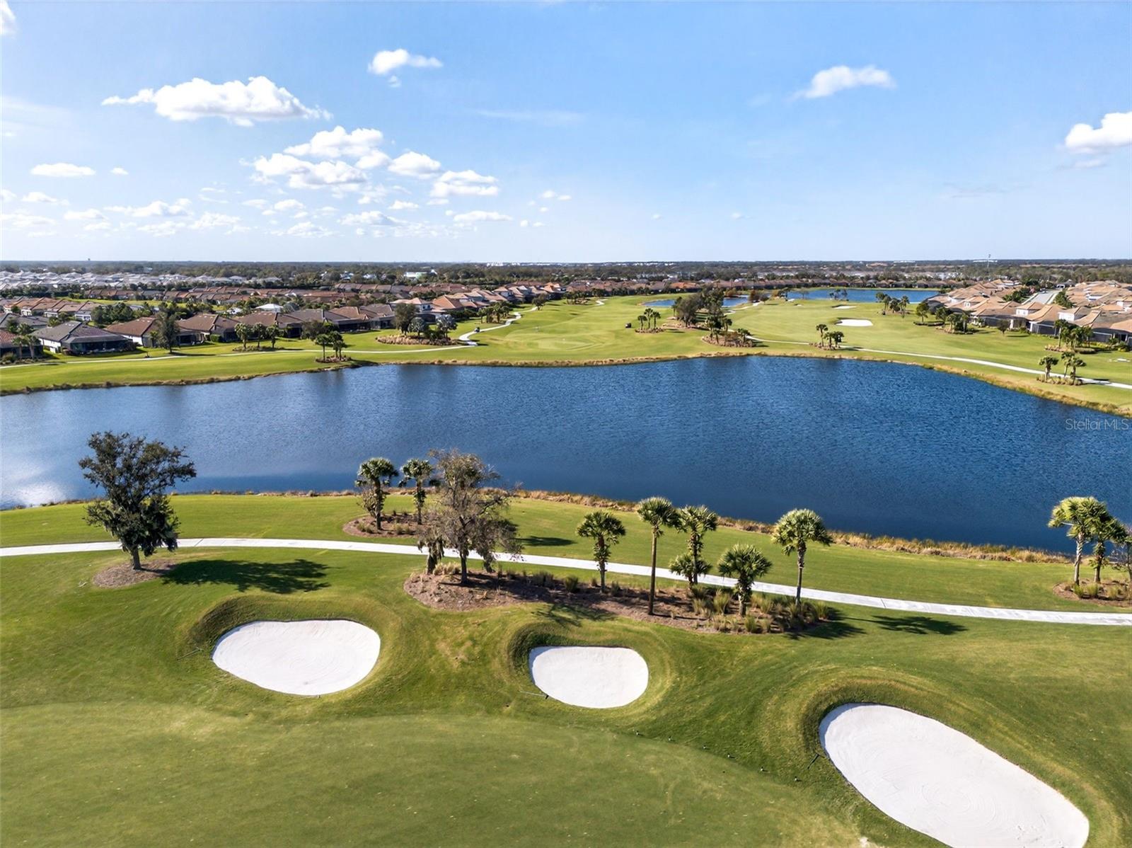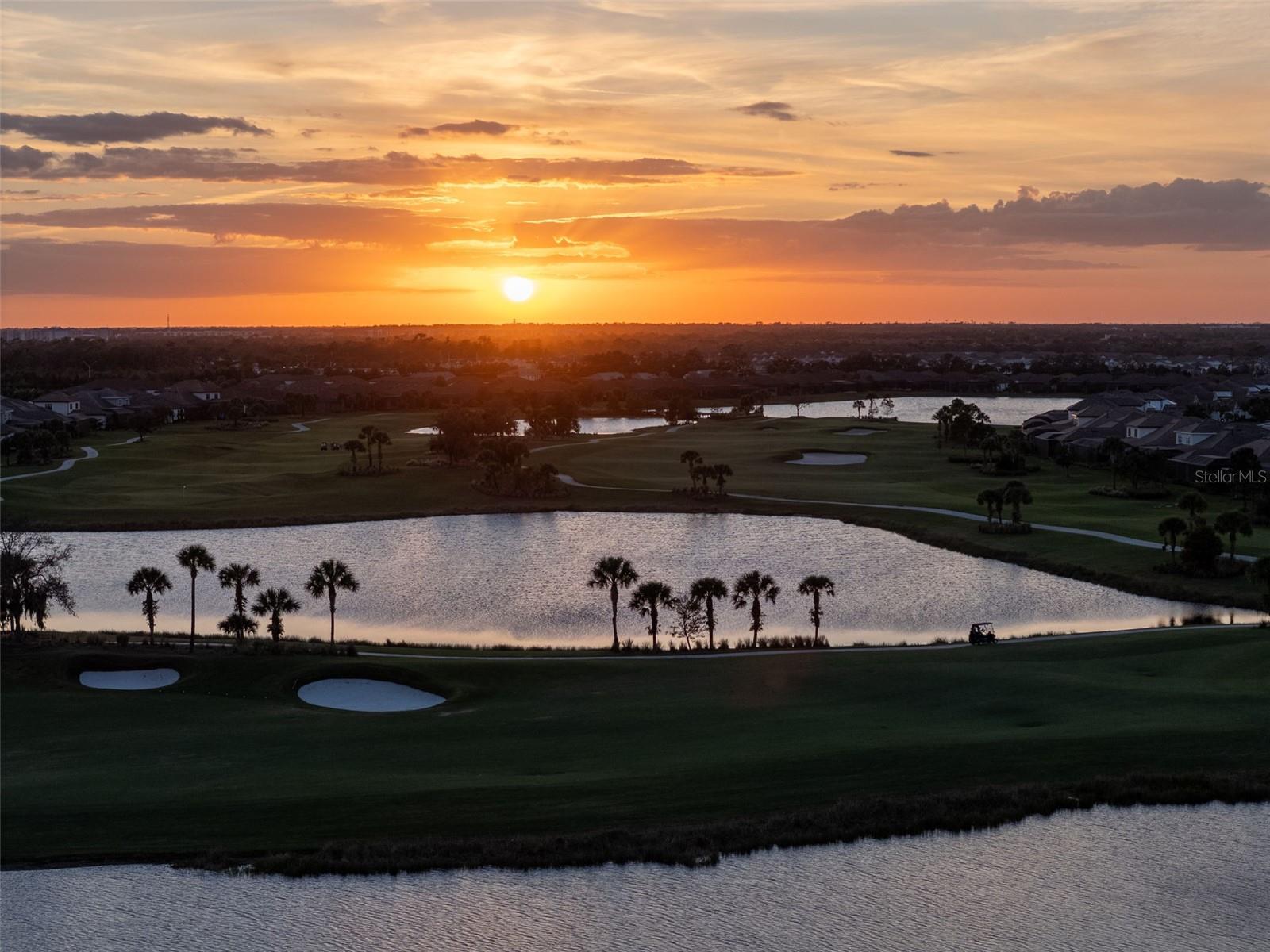 Welcome to you.r Fully Furnished Sunset Home!! Discover the perfect blend of luxury, comfort, and breathtaking views in this move-in-ready Pallazio floor plan, beautifully situated on a prime lake and golf homesite in Esplanade at Azario. From the moment you arrive, the upgraded landscaping and outdoor lighting set an inviting tone. Step through the elegant double glass doors and into a spacious three-bedroom, three-bath residence with a den, thoughtfully designed with high-end custom finishes throughout. All major furniture conveys; accessories, décor, artwork, small kitchen appliances, dishes etc. and personal items will be at the seller’s discretion. All bikes, wine and liquor does NOT convey. The enclosed office with glass doors provides a quiet workspace, while both guest suites offer ideal privacy. A custom wine wall and bar create a warm, stylish focal point in the dining area—perfect for entertaining. The gourmet kitchen features stainless steel Monogram appliances, abundant storage, and a layout designed for effortless hosting. Indoor living flows seamlessly to the stunning outdoor retreat, complete with an expansive pool and spa, travertine decking, outdoor kitchen, and fireplace. The panoramic screen showcases serene lake and golf views and unforgettable sunsets. This true smart home allows you to control lighting, security, Sonos audio, thermostat, pool, spa, and more directly from your phone. Upgrades include impact windows, lanai sunshades, a tankless Rinnai water heater, designer tile flooring, upgraded baths, custom closets and pantries, security cameras, and a spacious three-car tandem garage. Located in the resort-style community of Esplanade at Azario, residents enjoy a championship golf course, resort pool, poolside bar, spa, fitness center, tennis, and pickleball. ($1000 annual food & beverage minimum and $5,000 capital contribution due at closing. Golf membership included.)