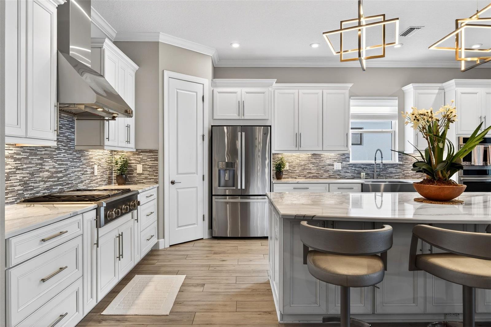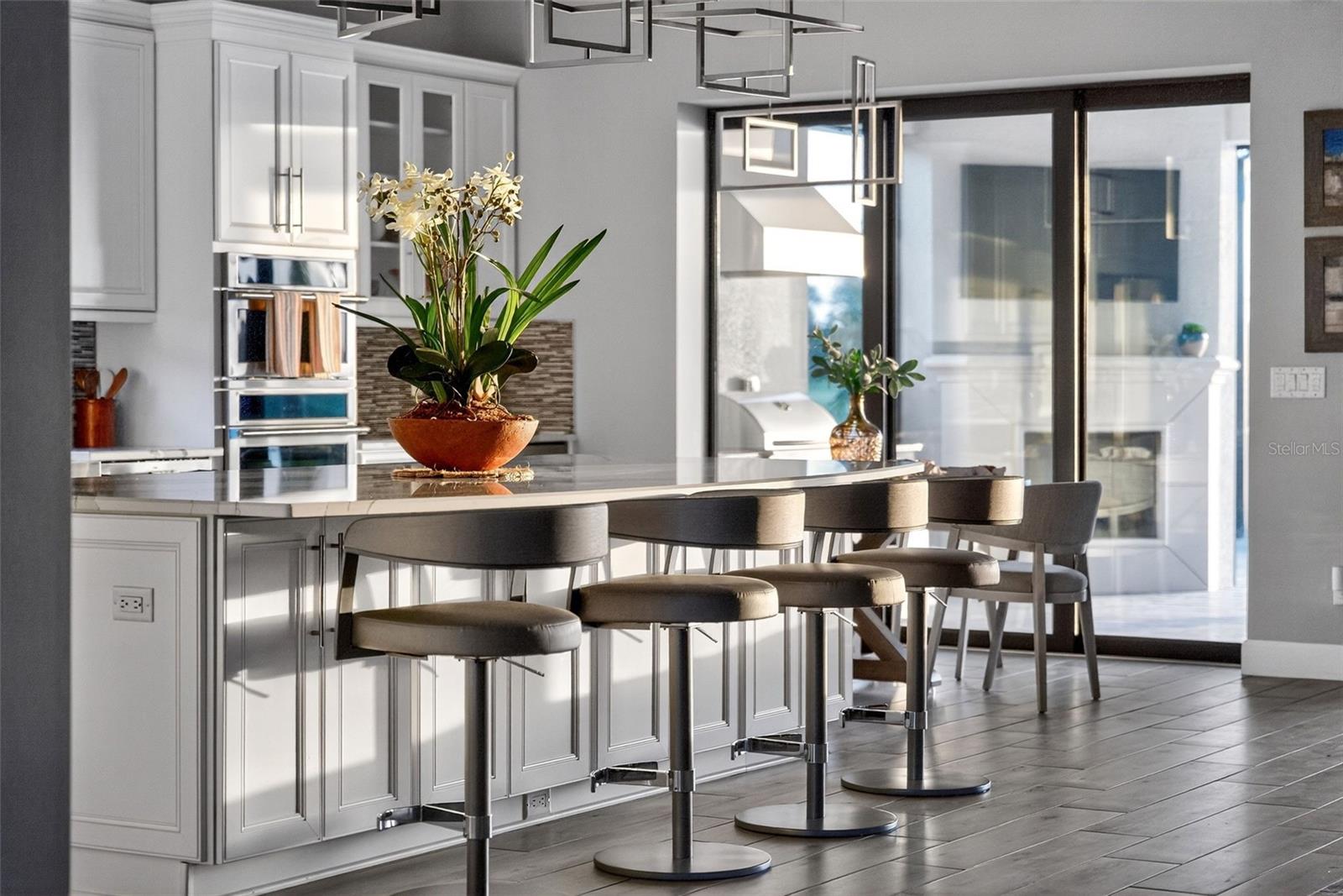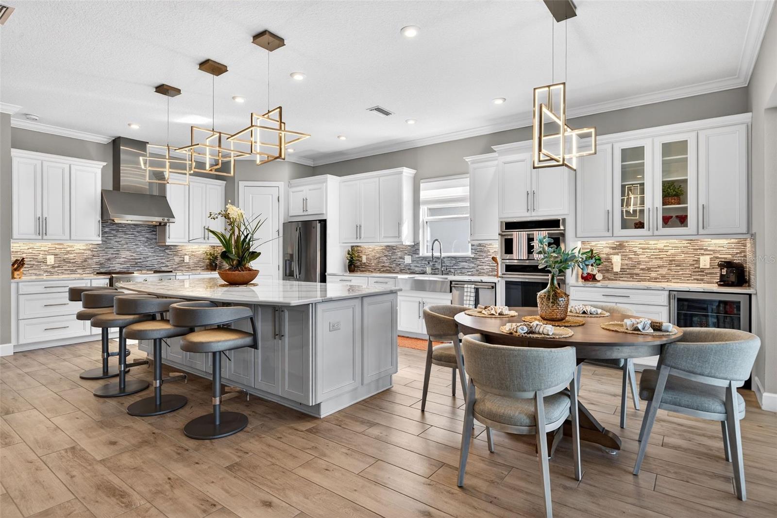 Welcome to you.r Fully Furnished Sunset Home!! Discover the perfect blend of luxury, comfort, and breathtaking views in this move-in-ready Pallazio floor plan, beautifully situated on a prime lake and golf homesite in Esplanade at Azario. From the moment you arrive, the upgraded landscaping and outdoor lighting set an inviting tone. Step through the elegant double glass doors and into a spacious three-bedroom, three-bath residence with a den, thoughtfully designed with high-end custom finishes throughout. All major furniture conveys; accessories, décor, artwork, small kitchen appliances, dishes etc. and personal items will be at the seller’s discretion. All bikes, wine and liquor does NOT convey. The enclosed office with glass doors provides a quiet workspace, while both guest suites offer ideal privacy. A custom wine wall and bar create a warm, stylish focal point in the dining area—perfect for entertaining. The gourmet kitchen features stainless steel Monogram appliances, abundant storage, and a layout designed for effortless hosting. Indoor living flows seamlessly to the stunning outdoor retreat, complete with an expansive pool and spa, travertine decking, outdoor kitchen, and fireplace. The panoramic screen showcases serene lake and golf views and unforgettable sunsets. This true smart home allows you to control lighting, security, Sonos audio, thermostat, pool, spa, and more directly from your phone. Upgrades include impact windows, lanai sunshades, a tankless Rinnai water heater, designer tile flooring, upgraded baths, custom closets and pantries, security cameras, and a spacious three-car tandem garage. Located in the resort-style community of Esplanade at Azario, residents enjoy a championship golf course, resort pool, poolside bar, spa, fitness center, tennis, and pickleball. ($1000 annual food & beverage minimum and $5,000 capital contribution due at closing. Golf membership included.)