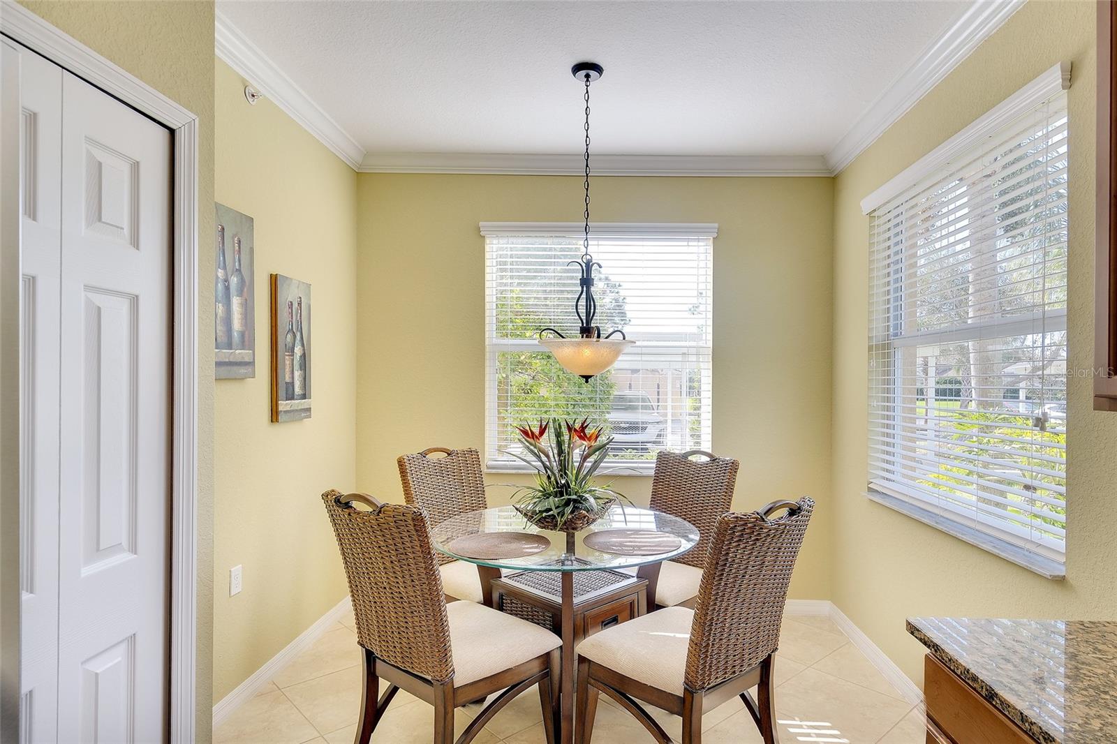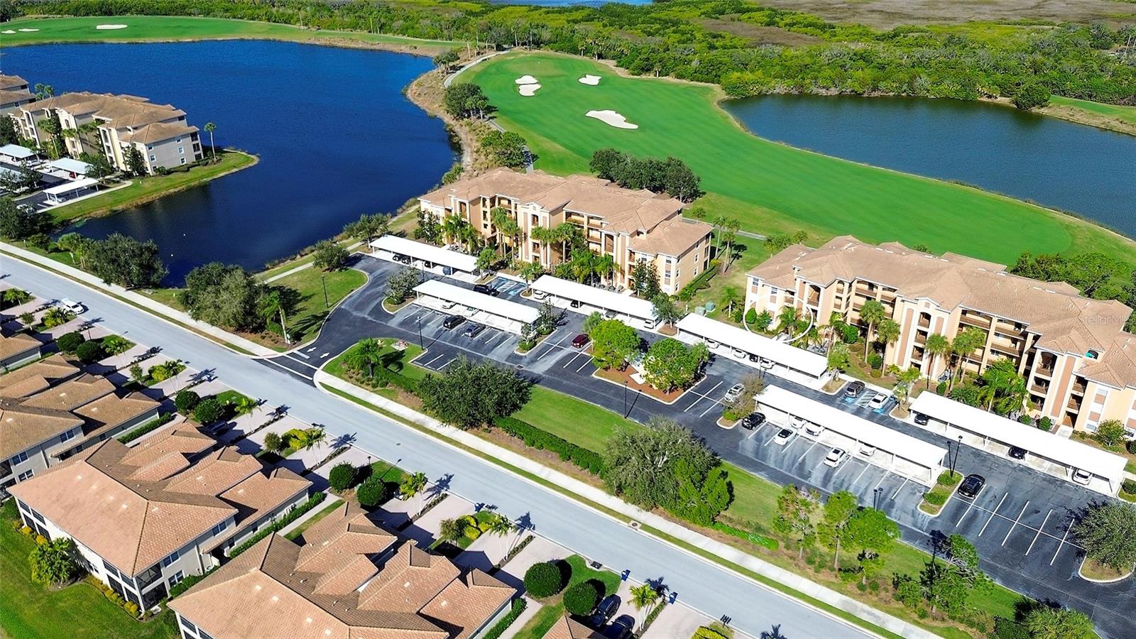 Live where you play!!!…This popular COLONADE END-UNIT, the largest of the Terrace floor plans, features 2-bedrooms, 2 full baths, DEN and laundry room. Situated within the gates of River Strand Golf and Country Club, ownership includes a DEEDED GOLF MEMBERSHIP in the recently updated 27-hole championship course. The Modified Master Plan assessment has been PAID IN FULL by the current owners and with construction scheduled to be completed in the spring 2026 you’ll benefit from the new facility updates without additional cost. Furnished and decorated in a relaxing casual décor the unit has been meticulously maintained with modern updates including quality furnishings, HURRICANE RATED WINDOWS & PATIO DOORS for safety and peace of mind, upgraded ceiling fans, porcelain tile installed on the diagonal in the main living areas & upgraded flooring in the bedrooms and den. The spacious, well-equipped kitchen is central to all activities and features granite countertops with breakfast bar, solid wood cabinetry, tile backsplash, stainless-steel appliances (new refrigerator), separate breakfast nook and the convenience of an adjoining laundry room. The tranquil owner's suite features ensuite bath with his & her walk-in closets and the versatile den with pocketing double doors is valuable bonus space equipped with a pull-out sofa providing extra sleeping space for guests if needed. You'll enjoy golf course and lake views from the screened lanai with direct access to the backyard for pets, a feature popular with “man’s best friend” as there's no need to deal with elevators. There’s also the added convenience of an outside storage area across from the home’s entrance for golf clubs, bicycles and beach chairs. Amenities include a 39,000 sq ft remodeled club house with new restaurant and grill room, 2 state-of-the-art fitness centers with 24/7 access, expanded Tiki Bar, 2 resort style pools with hot tub and resistance pool, 6 heated satellite pools, and a separate TENNIS CLUB with 8 Har-Tru lighted courts and 8 PICKLE BALL courts. The convenience of this LOCATION cannot be overstated as it’s ideally situated just minutes from all essential amenities and top attractions: Under 3 miles to the new Marketplace at Heritage Harbour home to Costco, Target, Miller’s Ale House, Academy Sports and Hobby Lobby, with several additional stores proposed. 3.6 miles to the Walmart Super Center, 3.9 miles to Home Depot, 8.8 miles to the Ellenton Premium Outlet Mall and 16 miles to the Bradenton/Sarasota Int’l Airport. With easy access to I-75 the University Town Center is nearby as well as the many attractions of downtown Sarasota and Bradenton, multiple performing arts venues, galleries, world class dining, award winning beaches, and sports venues just minutes away. LIVING IS EASY, CONVENIENT AND SECURE in this ACTIVE LIFESTYLE COMMUNITY…with the "lock and leave" convenience of MAINTENANCE FREE living!