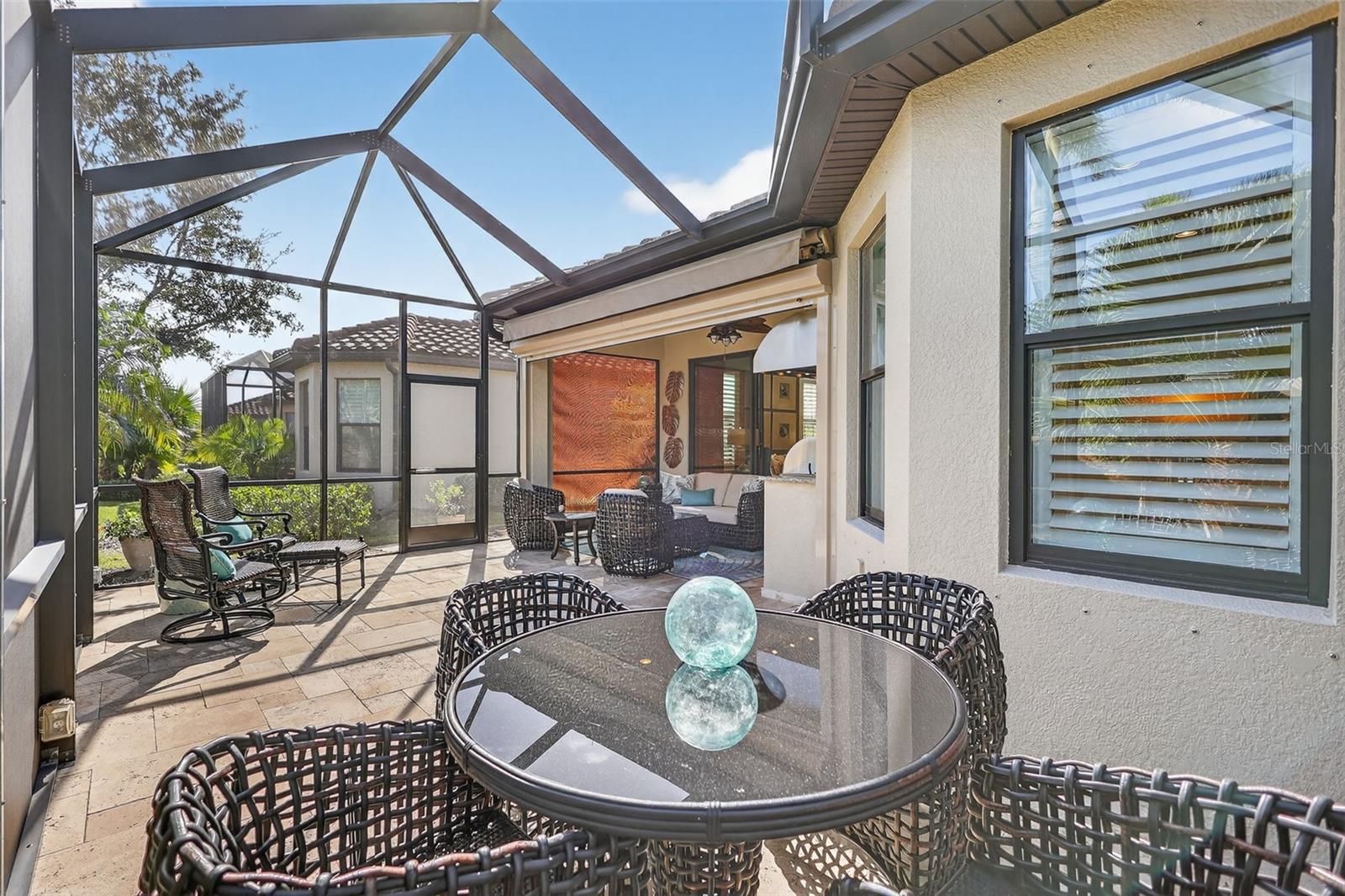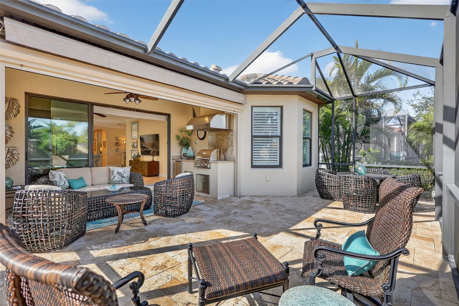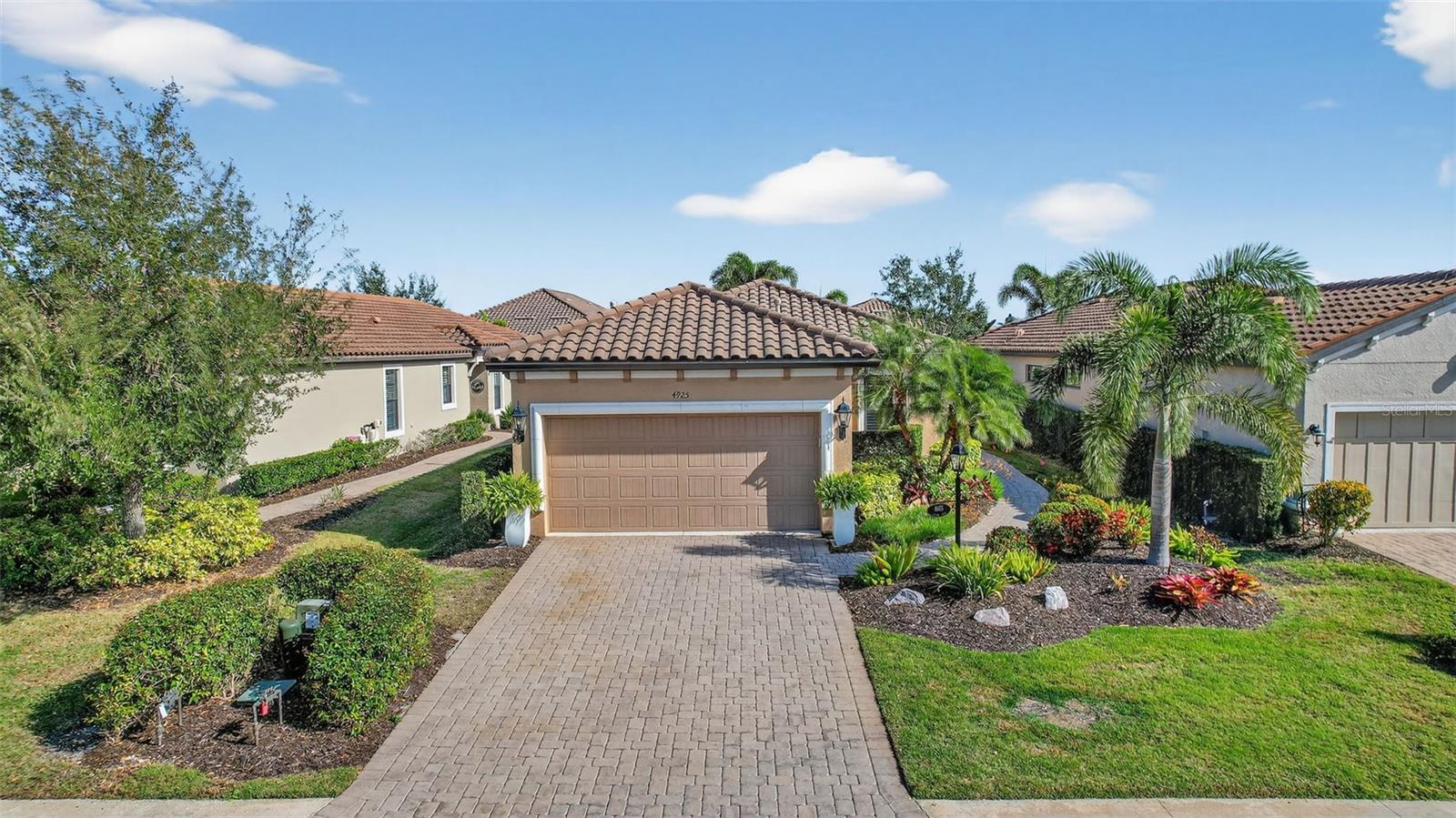 Welcome to 4925 Savona Run – a meticulously maintained, move-in ready home in a premier golf community! This beautifully appointed residence offers a seamless blend of luxury, functionality, and low-maintenance living. Inside, you'll find upgraded finishes throughout, including a tray ceiling package, crown molding, and recessed lighting that add elegance to the open layout. The home features tile and luxury vinyl flooring (installed 2021)—no carpet! Both bedrooms boast custom closets, while the den offers privacy with pocket sliders. The kitchen is a chef’s dream, featuring a quartz island, soft-close drawers, pullout shelves (in kitchen, baths, and pantry), under-cabinet lighting, a Bosch refrigerator and dishwasher (2022), and a custom pantry with built-in spice rack. Enjoy a dedicated utility room with cabinetry, a new HVAC system (Aug 2024), and newer washer/dryer (2022). Smart storage continues in the garage with built-ins and overhead storage, and a golf cart with new batteries (Dec 2025) is available for sale. Outdoors, relax or entertain on the extended lanai complete with storm shades, a summer kitchen, and a shade awning. The exterior was painted in 2022, and the HOA covers your maintenance-free yard for true lock-and-leave convenience. Additional upgrades include interior paint and designer wallpaper (2021) and pocket sliders in multiple areas. Located in a vibrant community offering “play and pay” golf, this one-owner home combines thoughtful design and top-tier features. Located in a vibrant community offering “play and pay” golf, this one-owner home combines thoughtful design and top-tier features. Live the Esplanade lifestyle—bundled golf, two resort pools, hot tubs, resistance pool, pickleball, tennis, bocce ball, two fitness centers, exercise classes, two dog parks, a playground, fire pit, spa/salon, and on-site lifestyle director offering year-round events, clubs, and social gatherings. Dine at the exclusive Culinary Center’s Barrel House or join in wine tastings and special events. All this in the heart of Lakewood Ranch, just minutes to I-75, UTC Mall, Main Street, golf, parks, hospitals, and the pristine beaches of Sarasota and the Gulf Coast.