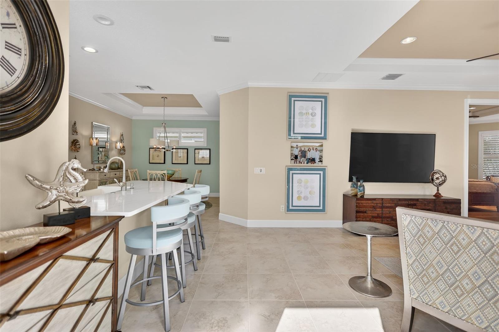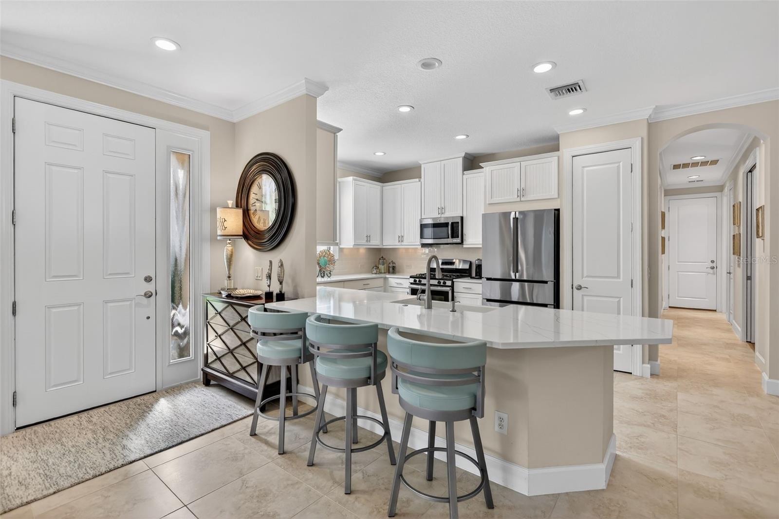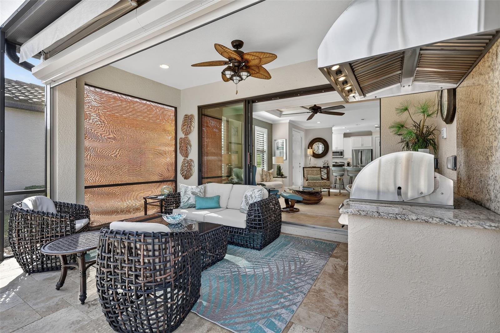Welcome to 4925 Savona Run – a meticulously maintained, move-in ready home in a premier golf community! This beautifully appointed residence offers a seamless blend of luxury, functionality, and low-maintenance living. Inside, you'll find upgraded finishes throughout, including a tray ceiling package, crown molding, and recessed lighting that add elegance to the open layout. The home features tile and luxury vinyl flooring (installed 2021)—no carpet! Both bedrooms boast custom closets, while the den offers privacy with pocket sliders. The kitchen is a chef’s dream, featuring a quartz island, soft-close drawers, pullout shelves (in kitchen, baths, and pantry), under-cabinet lighting, a Bosch refrigerator and dishwasher (2022), and a custom pantry with built-in spice rack. Enjoy a dedicated utility room with cabinetry, a new HVAC system (Aug 2024), and newer washer/dryer (2022). Smart storage continues in the garage with built-ins and overhead storage, and a golf cart with new batteries (Dec 2025) is available for sale. Outdoors, relax or entertain on the extended lanai complete with storm shades, a summer kitchen, and a shade awning. The exterior was painted in 2022, and the HOA covers your maintenance-free yard for true lock-and-leave convenience. Additional upgrades include interior paint and designer wallpaper (2021) and pocket sliders in multiple areas. Located in a vibrant community offering “play and pay” golf, this one-owner home combines thoughtful design and top-tier features. Located in a vibrant community offering “play and pay” golf, this one-owner home combines thoughtful design and top-tier features. Live the Esplanade lifestyle—bundled golf, two resort pools, hot tubs, resistance pool, pickleball, tennis, bocce ball, two fitness centers, exercise classes, two dog parks, a playground, fire pit, spa/salon, and on-site lifestyle director offering year-round events, clubs, and social gatherings. Dine at the exclusive Culinary Center’s Barrel House or join in wine tastings and special events. All this in the heart of Lakewood Ranch, just minutes to I-75, UTC Mall, Main Street, golf, parks, hospitals, and the pristine beaches of Sarasota and the Gulf Coast.