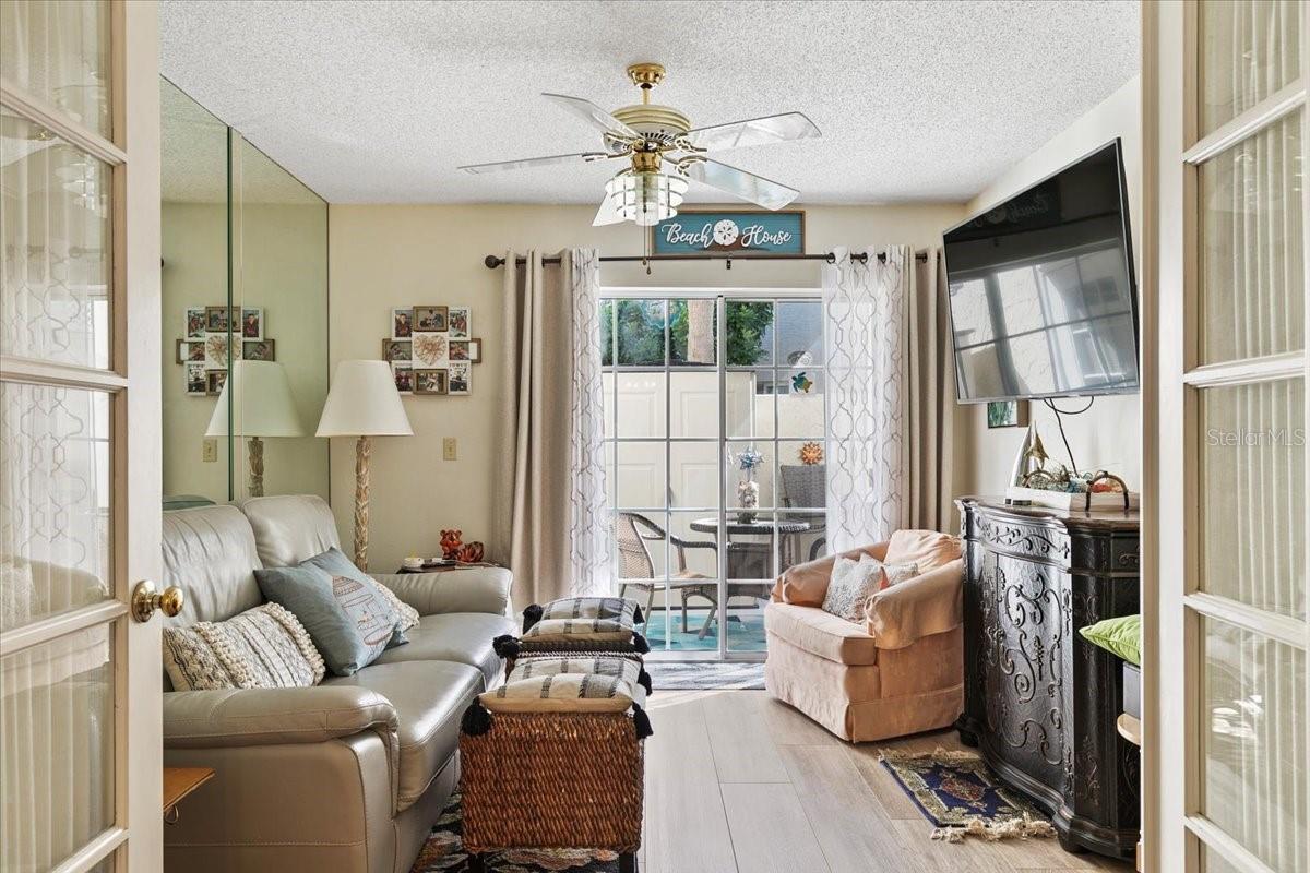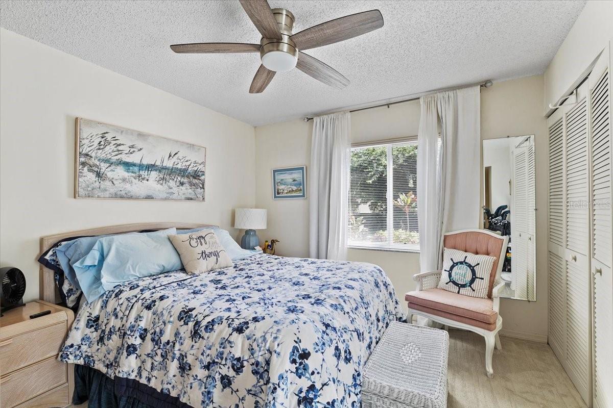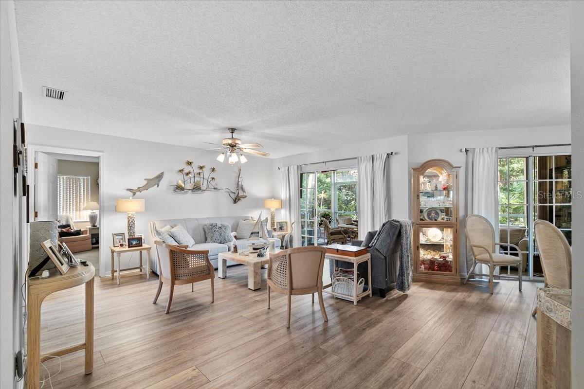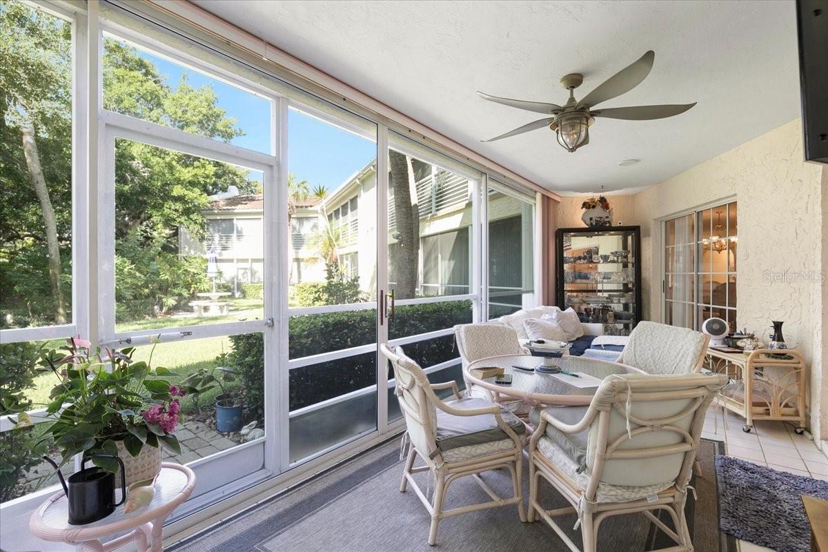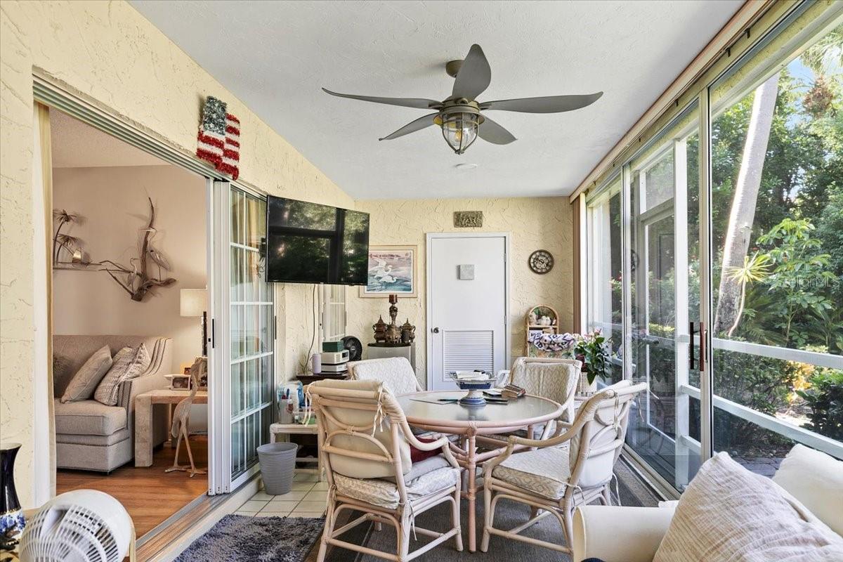 Welcome to Vizcaya, a gated, Spanish-style community offering resort-style amenities and a relaxed Florida lifestyle. This well-maintained ground-floor residence features a spacious open living area, a generously sized kitchen with ample cabinet and counter space, and a dining area ideal for both daily living and entertaining. New flooring in the living room adds a fresh, modern feel. The enclosed lanai provides a comfortable space to enjoy the landscaped common area year-round with added privacy. The split-bedroom layout offers privacy for owners and guests alike. The primary suite is generously sized and includes a bathroom with dual sinks, a soaking tub, and a walk-in shower. The second bedroom is located on the opposite side of the unit with a nearby full bath. This residence is not situated on a pond, providing additional privacy with no direct rear water views or pedestrian traffic behind the unit. A versatile bonus room can be used as a home office, den, or additional sleeping area. Both the second bedroom and bonus room offer access to a private patio, creating rare indoor-outdoor flexibility for a condominium home. The laundry area is conveniently located in the Florida room. Vizcaya residents enjoy a beautifully appointed clubhouse with a fitness center, heated pool, and spa. The community is conveniently located near IMG Academy, downtown Sarasota, St. Armands Circle, Sarasota-Bradenton International Airport, and the Gulf beaches, including Anna Maria Island and Siesta Key. This is an excellent opportunity to enjoy low-maintenance living in a sought-after community close to shopping, dining, and area attractions.