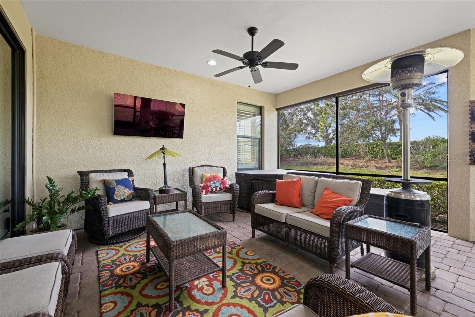 Located in the heart of Esplanade Golf and Country Club at Lakewood Ranch, this meticulously maintained Lazio model offers 3 bedrooms, 3 full bathrooms, plus a den, and 2,275 sq. ft. of thoughtfully designed living space on a desirable corner homesite. Seller incentive: The entire outdoor entertainment and patio furnishing package—including wall-mounted TV, accessories, and quality outdoor furniture—will convey to buyers as a gift. Interior features include Mohawk flooring, plantation shutters, tray ceilings with crown molding, custom lighting, and 13 ceiling fans (including garage). The open-concept kitchen features 42” cabinetry with pull-outs and trash storage, stainless steel appliances, built-in wall oven and microwave, natural gas cooktop, oversized granite island with seating for four and prep sink, decorative backsplash and lighting, and a spacious walk-in pantry. The owner’s suite features coffered ceiling, crown molding, plantation shutters, spa-style bath with expansive walk-in shower and dual vanities, and a custom walk-in closet with built-in shelving and drawers. Bedroom 2 includes an ensuite bath; Bedroom 3 features custom closet cabinetry. Den with pocket doors provides flexible office or bonus space. Additional highlights include a well-appointed laundry room with wet sink, solid surface counters, and storage. The expanded garage offers epoxy flooring, 4-foot extension, Safe Rack overhead storage, built-in cabinetry, finished attic, and heavy-duty pull-down ladder. Outdoor living includes an extended screened lanai with bay design, outdoor kitchen with gas grill, exhaust hood, sink, and under-counter refrigerator, surrounded by lush landscaping and bermed privacy. Community amenities include an 18-hole golf course (no mandatory membership for this home), resort-style pools and spa, fitness center, dining venues, tennis, pickleball, and Bahama Bar. One-time capital contribution: $7,400 Annual food & beverage minimum: $900 Interior furnishings negotiable!!! Conveniently located near beaches, dining, shopping, and entertainment. Schedule your private showing today.