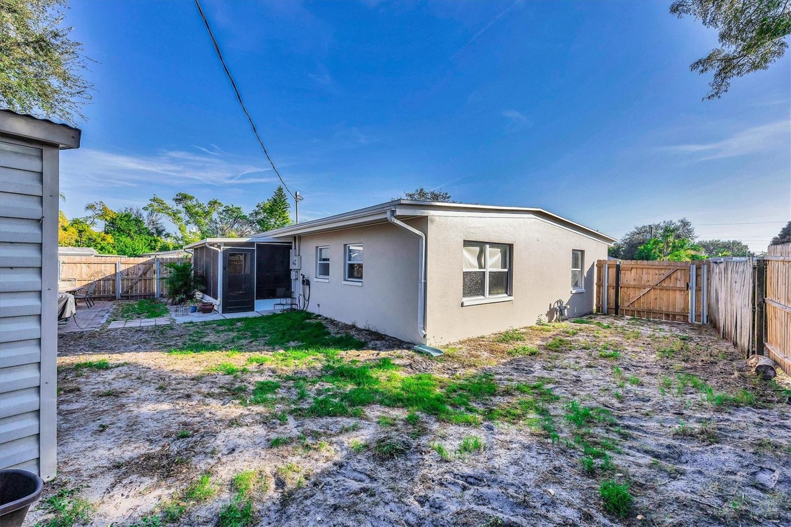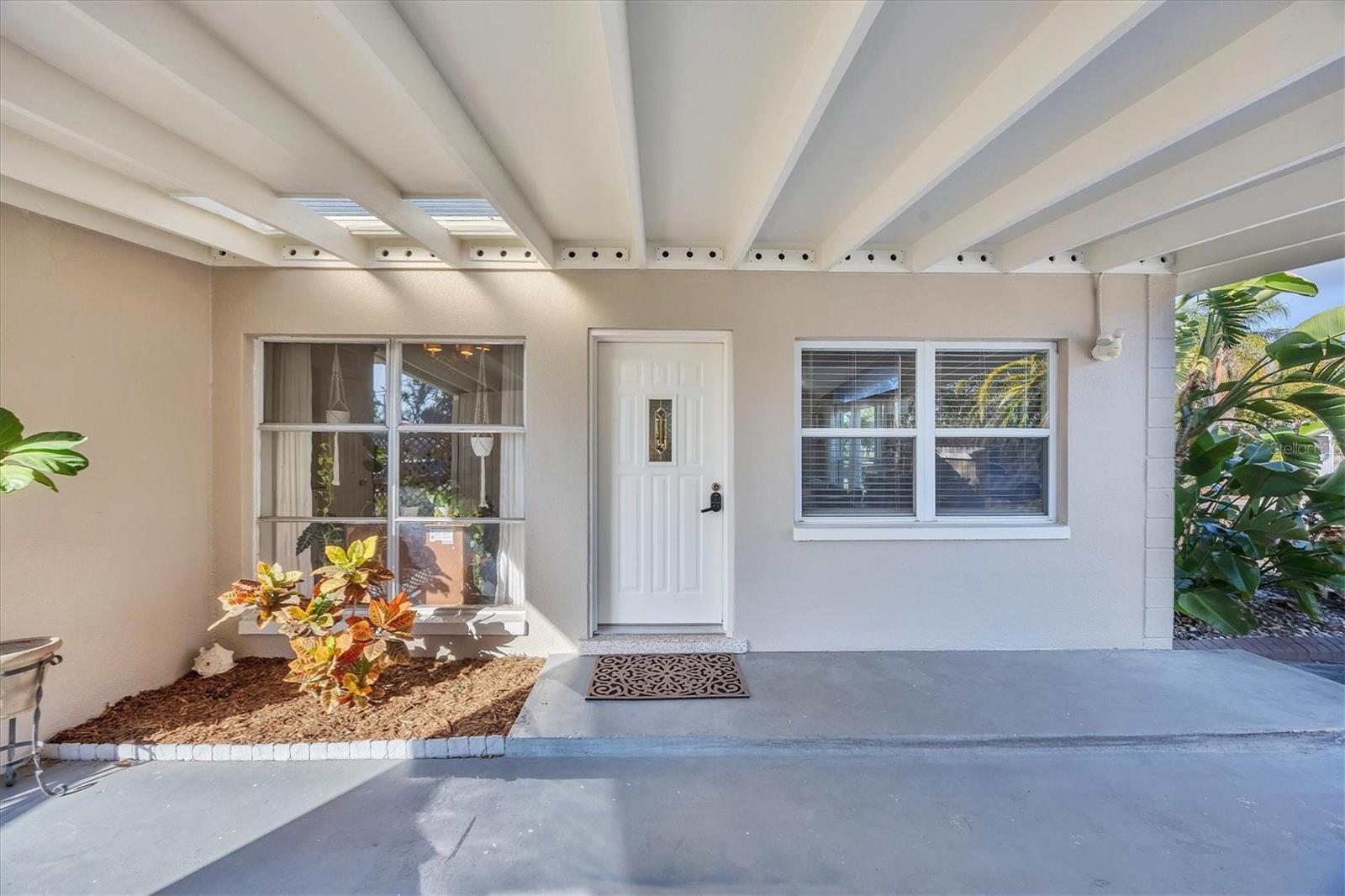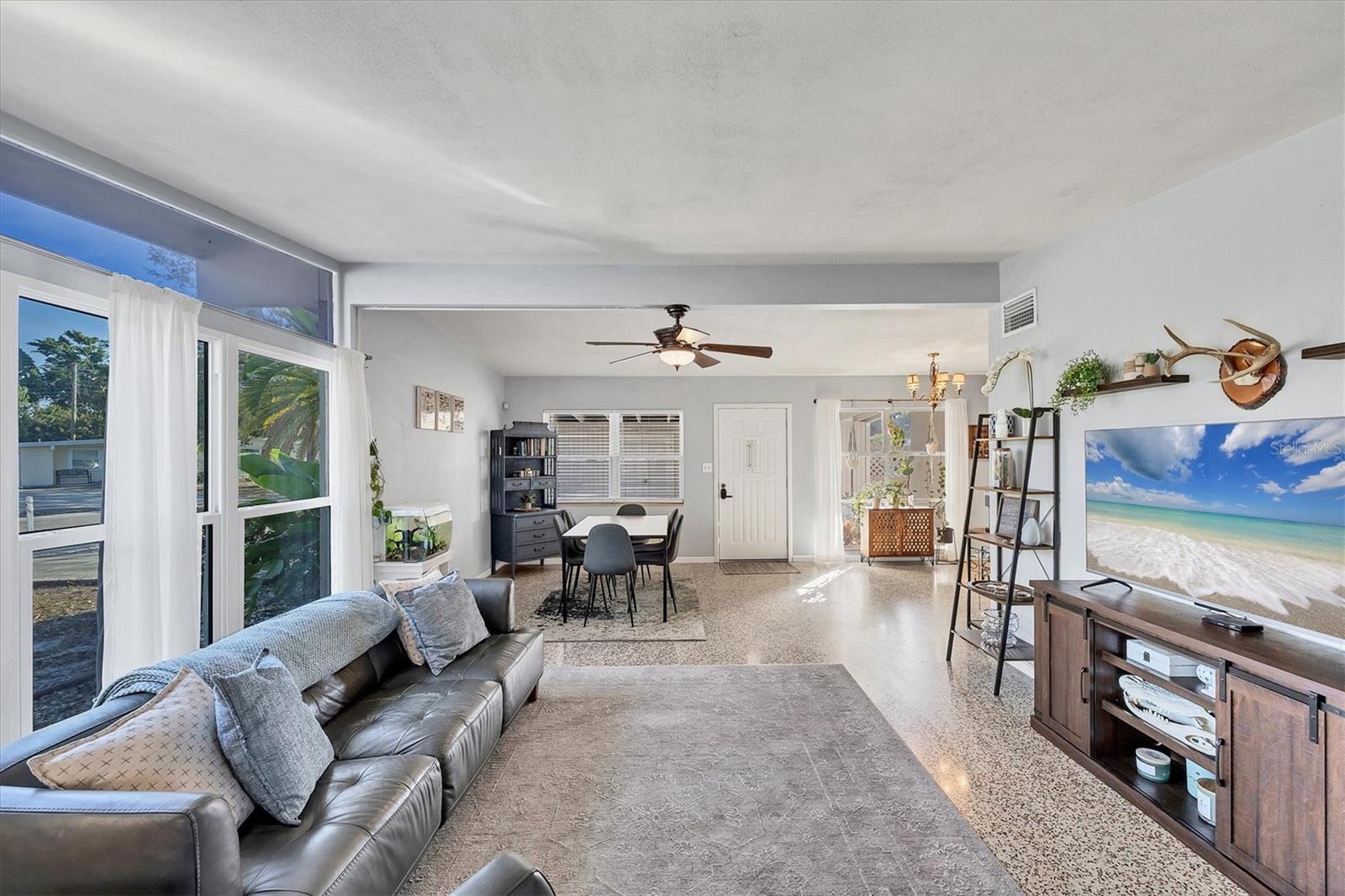Charming mid-century modern home located on an oversized corner lot with thoughtful updates and fantastic outdoor living. This 3-bedroom, 2-bath home features a bright great-room layout with polished terrazzo floors and warm mid-century character throughout. The updated kitchen includes French-cream cabinetry, solid-surface counters, ceramic backsplash, and stainless steel appliances, with an adjoining dining area and a flexible all-seasons Florida sunroom. Major improvements were completed in 2019, including a new roof, updated plumbing, and newer A/C. Most recently (2025) the home has new exterior paint, new front windows, new backyard fence (2024) and a new garbage disposal—making this home truly move-in ready. The fenced in backyard is ideal for relaxing or entertaining with a fire pit, paver patio, and plenty of room for pets. Storage is abundant, with a backyard shed that stays, plus covered storage under the carport. Additional features: optional $10 HOA, access to the Bayshore Gardens recreation center with pool, park, marina and boat ramp, home is NOT located in a flood zone, and conveniently located near shopping, dining, and the Gulf beaches. This lovingly maintained mid-century home is ready for its next owners. Set up your showing today!