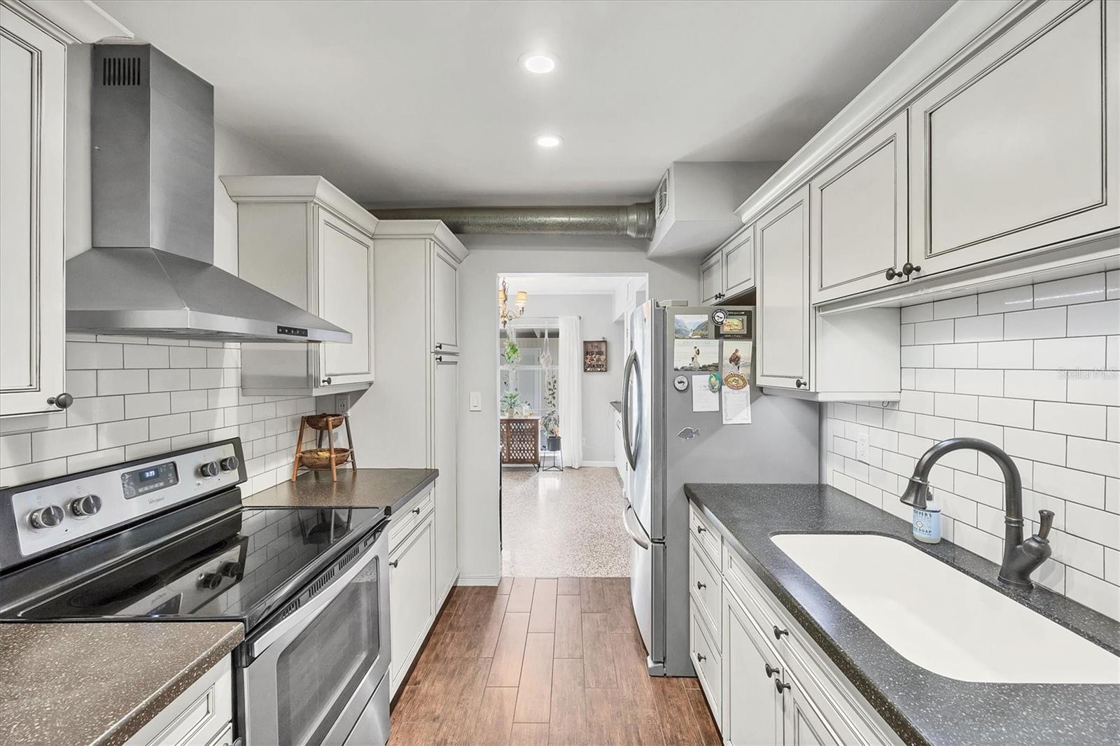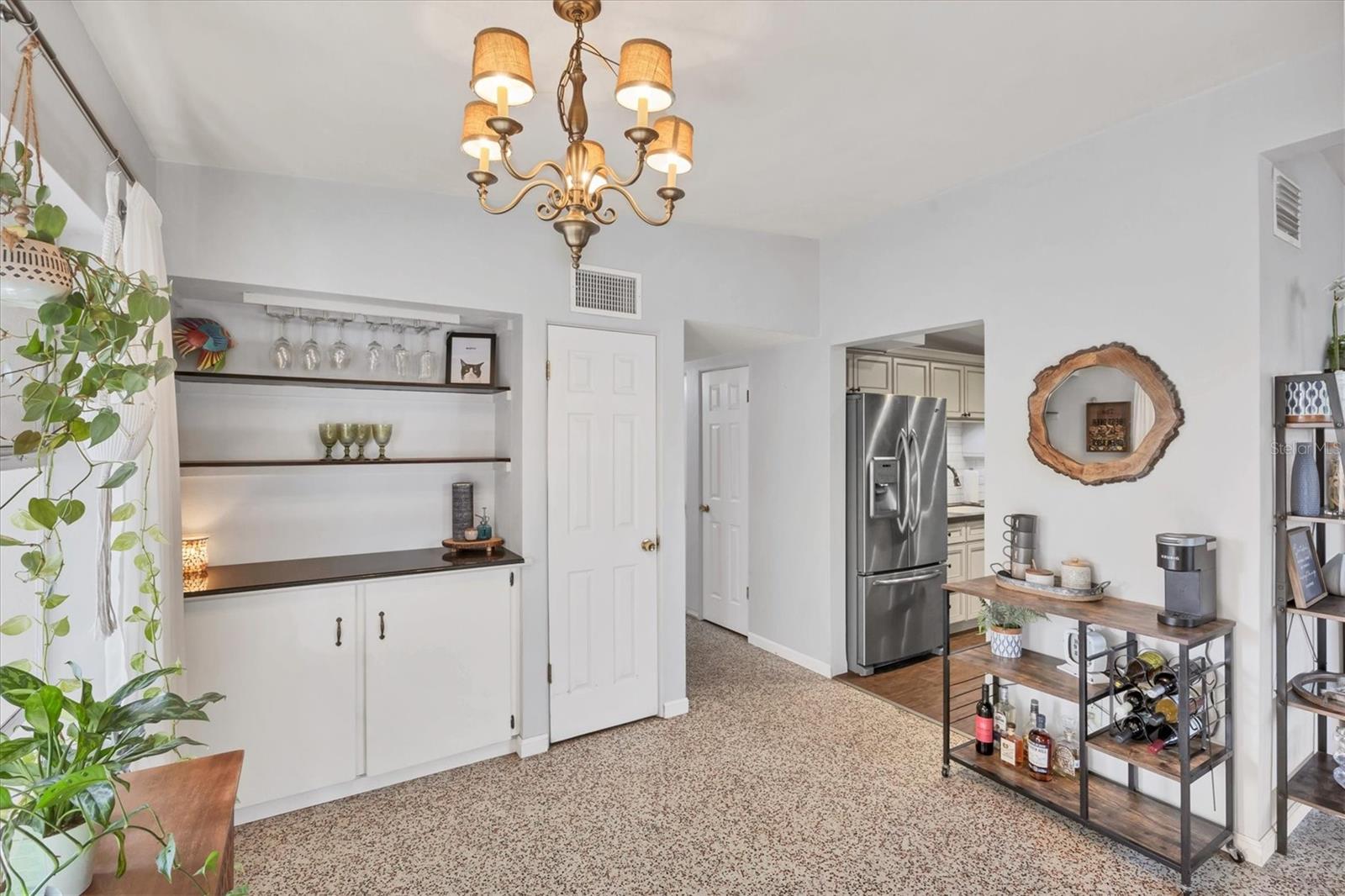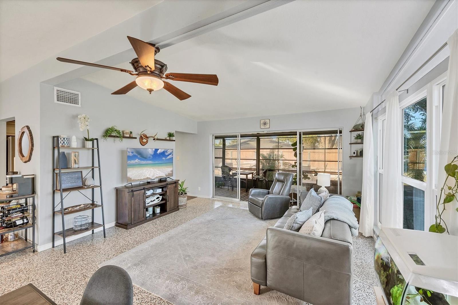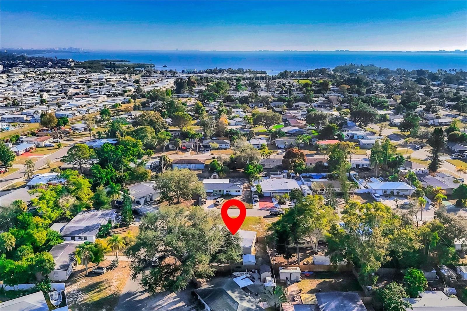 Charming mid-century modern home located on an oversized corner lot with thoughtful updates and fantastic outdoor living. This 3-bedroom, 2-bath home features a bright great-room layout with polished terrazzo floors and warm mid-century character throughout. The updated kitchen includes French-cream cabinetry, solid-surface counters, ceramic backsplash, and stainless steel appliances, with an adjoining dining area and a flexible all-seasons Florida sunroom. Major improvements were completed in 2019, including a new roof, updated plumbing, and newer A/C. Most recently (2025) the home has new exterior paint, new front windows, new backyard fence (2024) and a new garbage disposal—making this home truly move-in ready. The fenced in backyard is ideal for relaxing or entertaining with a fire pit, paver patio, and plenty of room for pets. Storage is abundant, with a backyard shed that stays, plus covered storage under the carport. Additional features: optional $10 HOA, access to the Bayshore Gardens recreation center with pool, park, marina and boat ramp, home is NOT located in a flood zone, and conveniently located near shopping, dining, and the Gulf beaches. This lovingly maintained mid-century home is ready for its next owners. Set up your showing today!