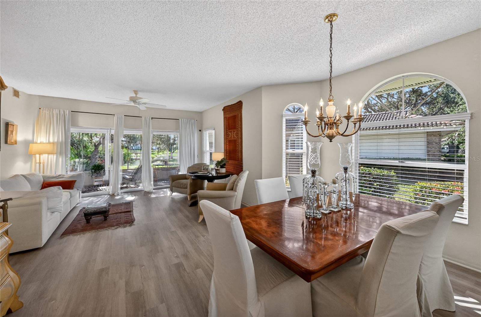 Experience the ease of Florida living in this beautiful 2-bedroom, 2-bath villa in Garden Lakes, perfectly positioned on a premium pond-front lot framed by majestic oak trees. From the moment you step inside, you’ll feel the light, openness, and serenity this home offers. Neutral tones and luxury vinyl plank flooring flow into the primary living space, complemented by countless windows that bathe the home in natural light and showcase peaceful water and nature views. The open-concept living, dining, and kitchen areas create an airy & inviting space, while the triple sliding doors extend your living space into the Florida room—perfect for morning coffee or sunset unwinding as you take in the pond and oak-lined backdrop. The updated kitchen features solid surface countertops, stainless steel appliances and a charming picture window that brings the outdoors in. The spacious primary suite offers private access to the sunroom through sliding doors and an en-suite bath with a walk-in tile shower, creating a true retreat. A comfortable guest bedroom and second full bath provide space and privacy for visitors. Located in Garden Lakes, a desirable 55+ community, residents enjoy an active lifestyle with abundant amenities and a prime location close to shopping, dining, and everyday conveniences. This light-filled villa combines comfort, style, and tranquil views—an exceptional opportunity to enjoy the very best of Florida living.