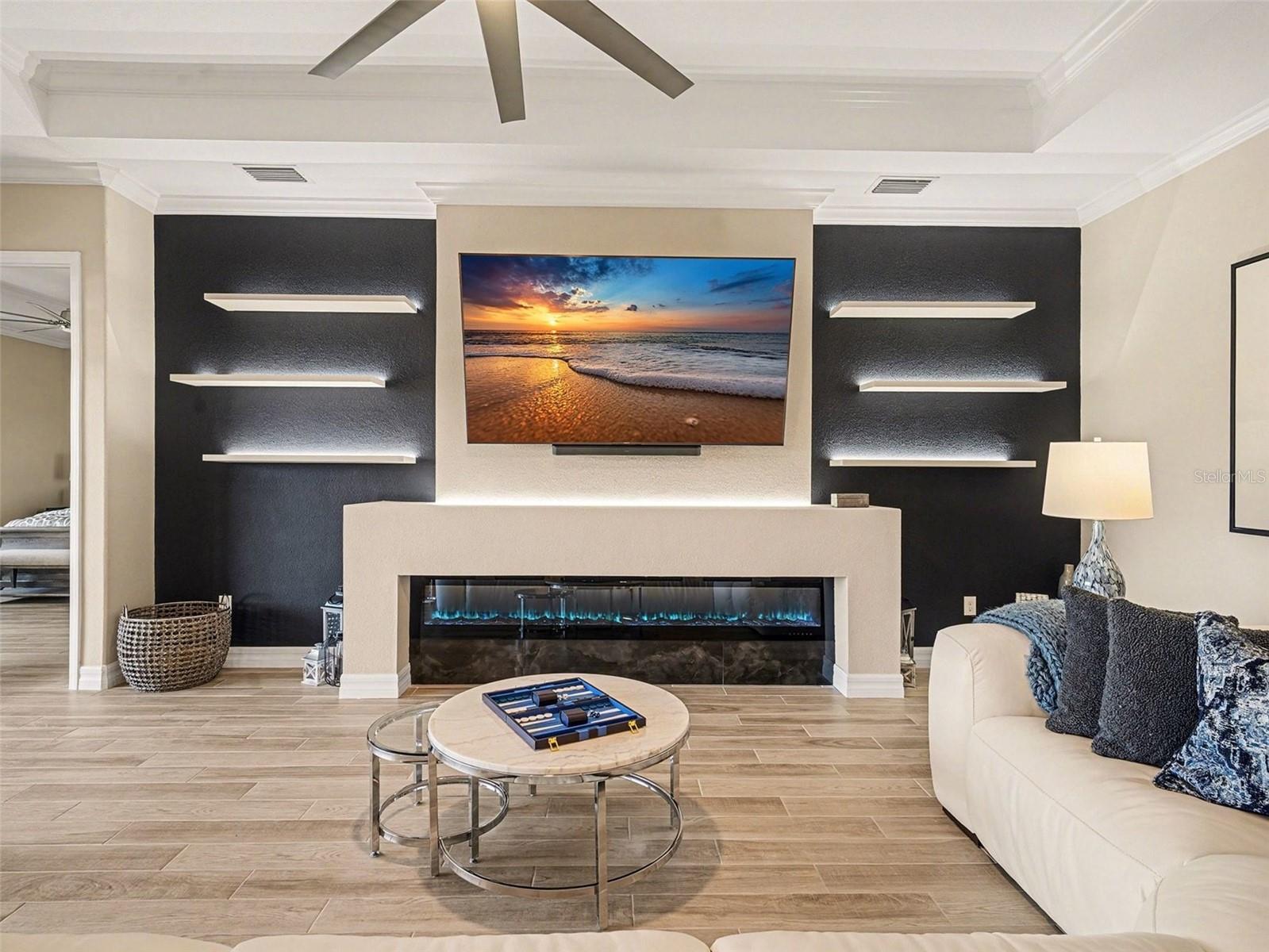 Rare opportunity to own a breathtaking home in Country Club East, a premier gated community of Lakewood Ranch and one of the area’s most sought-after neighborhoods. Designed with the sophistication of a professionally modeled residence, this impeccably appointed home on a south-facing homesite blends refined craftsmanship with effortless indoor–outdoor living, all set against tranquil lake views and stunning sunset backdrops. An open-concept floor plan is enhanced by ceramic tile flooring throughout, tray ceilings, crown molding, and architectural detailing, creating a cohesive and timeless interior. The expansive great room centers around a custom-designed media wall featuring a dramatic 120-inch fireplace with mantel and remote control. This striking centerpiece accommodates an 85-inch wall-mounted television and is accented by illuminated floating shelves on either side. The open layout continues into the dining area with decorative chair rail detailing and remote-controlled designer window treatments. The adjacent chef’s kitchen is both elegant and functional, featuring GE Profile stainless steel appliances, a built-in oven and microwave, gas cooktop, upgraded sink and faucet, walk-in pantry with custom wood shelving, and an oversized island ideal for entertaining and everyday dining. Disappearing sliding glass doors extend the living area onto the lanai, where stone pavers, a fully equipped outdoor kitchen with refrigerator, Coyote barbecue grill, stone backsplash, and vent hood create an inviting setting for outdoor living. A heated pool and spa complete this exceptional space, offering peaceful lake views and unforgettable sunsets. Designer touches continue throughout the home, with the primary suite serving as a private retreat featuring direct lanai access, tray ceilings, lighted wall switches, remote-controlled window treatments, and a custom ceiling fan. The en-suite bath includes dual vanities, an expansive walk-in shower with dual showerheads, and two walk-in closets with wood shelving. Two additional bedrooms provide comfort and privacy, each with access to separate baths, including one en-suite bath with a glass shower enclosure. Both bedrooms feature ceiling fans and lighted wall switches. The study/den offers flexible living space and guest accommodations, showcasing designer built-ins with a dual desk and a hidden Murphy bed seamlessly integrated into custom bookcases. A well-appointed laundry room features a built-in ironing board and wall-mounted drying rack. This home is a rare offering where thoughtful design, luxury finishes, and indoor–outdoor living come together in perfect harmony. Residents of Country Club East enjoy exclusive access to The Retreat, a private amenity center with a fitness center, resort-style and lap pools, and a social clubhouse, along with scenic walking and biking paths. Optional membership to the Country Club at Lakewood Ranch includes championship golf, tennis, fitness centers, and access to the Lodge bar and restaurant. Conveniently located near shopping, dining, medical facilities, and world-class Gulf Coast beaches, Country Club East offers an exceptional lifestyle of luxury and recreation