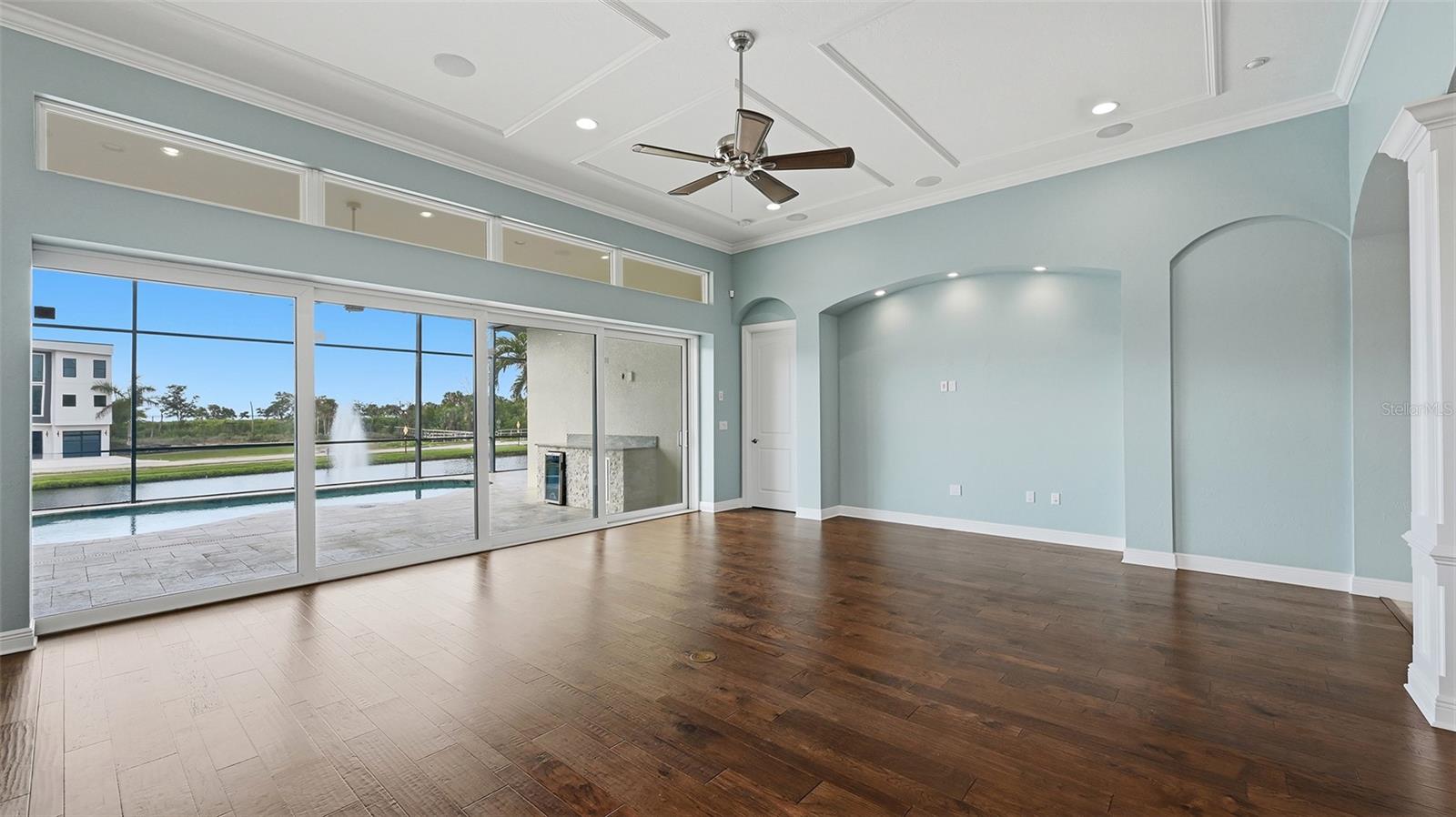 Step into this stunning custom residence in the highly sought after Legends Bay community, where quality construction and thoughtful design come together beautifully. Built by Gibraltar, this home enjoys showcases refined craftsmanship at every turn. Expansive 12-foot ceilings, elegant tray accents, impact pocketing sliders, and transom windows fill the main living spaces with soft, natural light. Overlooking a peaceful lake, the home offers 3 bedrooms plus a den and a seamless blend of indoor comfort and outdoor enjoyment. Wide plank hardwood flooring, detailed millwork, crown molding, and designer LED fixtures elevate the home’s timeless style. The chef’s kitchen is both functional and impressive, featuring premium appliances, natural stone countertops, and an oversized island ideal for gatherings. A floor to ceiling walk in pantry adds exceptional storage. The owner’s suite is a private retreat with serene water views, a spa inspired bath with a soaking tub and walk in shower, and an expansive custom closet. The den provides flexible space for an office, media room, OR quiet lounge. Outdoors, enjoy a heated pool and spa with smart controls, a covered lanai, and a convenient pool bath—perfect for year round Florida living. The home also includes impact-rated windows and doors and is elevated well above sea level for added peace of mind. Additional upgrades include oversized garage storage cabinets, automated ceiling mounted storage racks, and an expanded paver driveway accommodating a third vehicle. Residents of Legends Bay enjoy a lakeside community pool, clubhouse, walking trail, and fishing pier. The HOA includes lawn care and cable/internet. With IMG Golf & Country Club (golf cart friendly), IMG Academy, and the beaches of Anna Maria Island and Longboat Key just minutes away, this home offers an exceptional lifestyle in an unbeatable location.