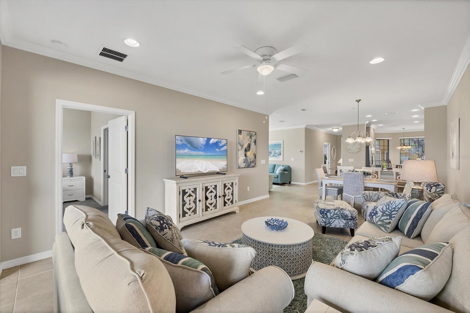 Tastefully decorated, Clean and Crisp Two Bedroom, Den, Two Bathroom condominium with TURNKEY FURNISHINGS offered for sale! Perfect in and out access on the first floor without any stairs. End-unit with more windows and more light! Check out the GORGEOUS direct views of the Golf Course located in the Esplanade Golf and CC at Lakewood Ranch. Beautifully appointed Kitchen with Stainless Steel Appliances, Granite Countertops, Tall Wooden Cabinetry, Breakfast Bar and an eating area up front. Open floor plan featuring a Spacious Great Room and Dining Room and a Den overlooking the Golf course View. Access your outdoor lanai through a triple slider and get ready to relax! Primary King size Bedroom with ensuite bath also overlooking the Golf Course. Primary bath includes Dual Sinks, Granite Countertops, a large stand alone shower, and a commode. Second Guest Bedroom split from Primary is in front of the unit. Guest Bath also with Wooden cabinetry, Granite Countertops and a Tub/Shower combo. Covered Parking and one extra space for an extra car or golf cart and an outdoor storage closet. Gorgeous resort style amenities and DEEDED GOLF MEMBERSHIP! Combining the beauty of Southwestern Florida with Tuscan inspired architecture, breathtaking golf vistas, nestled in lush landscaping, along with first class resort style amenities are sure to please! A championship Golf course and driving ranges are considered as one of the best in the area, a multitude of uniquely designed social spaces abound for you to enjoy. Resort lagoon style heated pool and spa set with cabanas, several tropical satellite pools(one is 30 second walk) , a 24 hour Gym, as well as lit tennis courts, and ever so popular pickleball and bocce ball courts. Relax at the Bahama Poolside Tiki Bar, and also featuring the Barrel House Bistro for you and your family to enjoy! You won't want to leave!! Lakewood Ranch is an award winning Master Planned community having glorious weather, and a perfect location to all. Inland, and safe during storms. World renowned Siesta, Lido, & Longboat Key, and Anna Maria Island Beaches, Boating, Fishing, Biking, walking trails, etc ...hobbies you can enjoy year round! Short drive to UTC Mall and numerous restaurants. Downtown Sarasota, a jewel of a city with Hip chic vibe, wonderful restaurants...Historic Bradenton, more wonderful restaurants and rooftop bars, and cultural venues to explore. Several international airports within an hour drive. Welcome to the Gulf Coast of Florida, a lifestyle second to none!