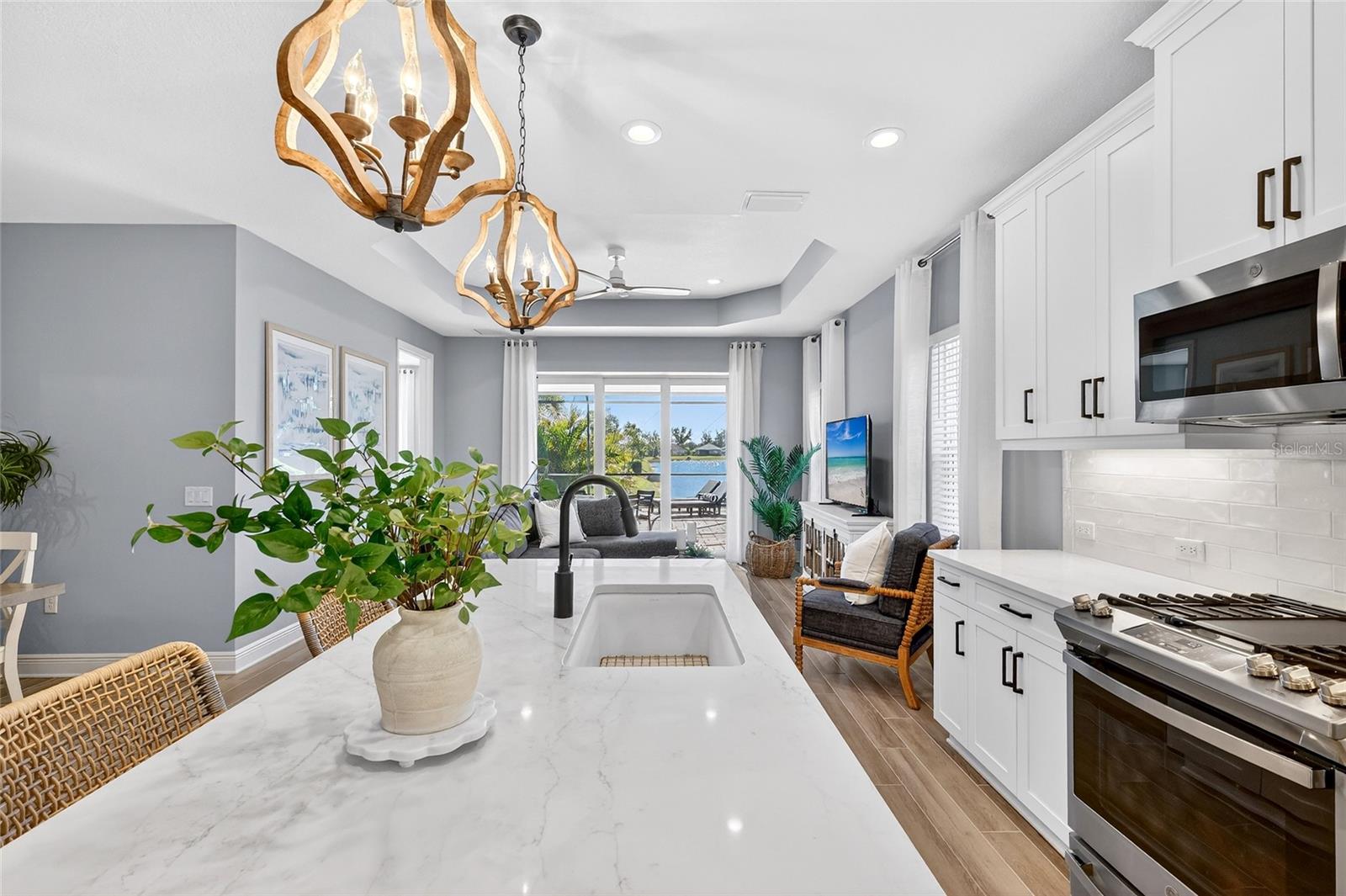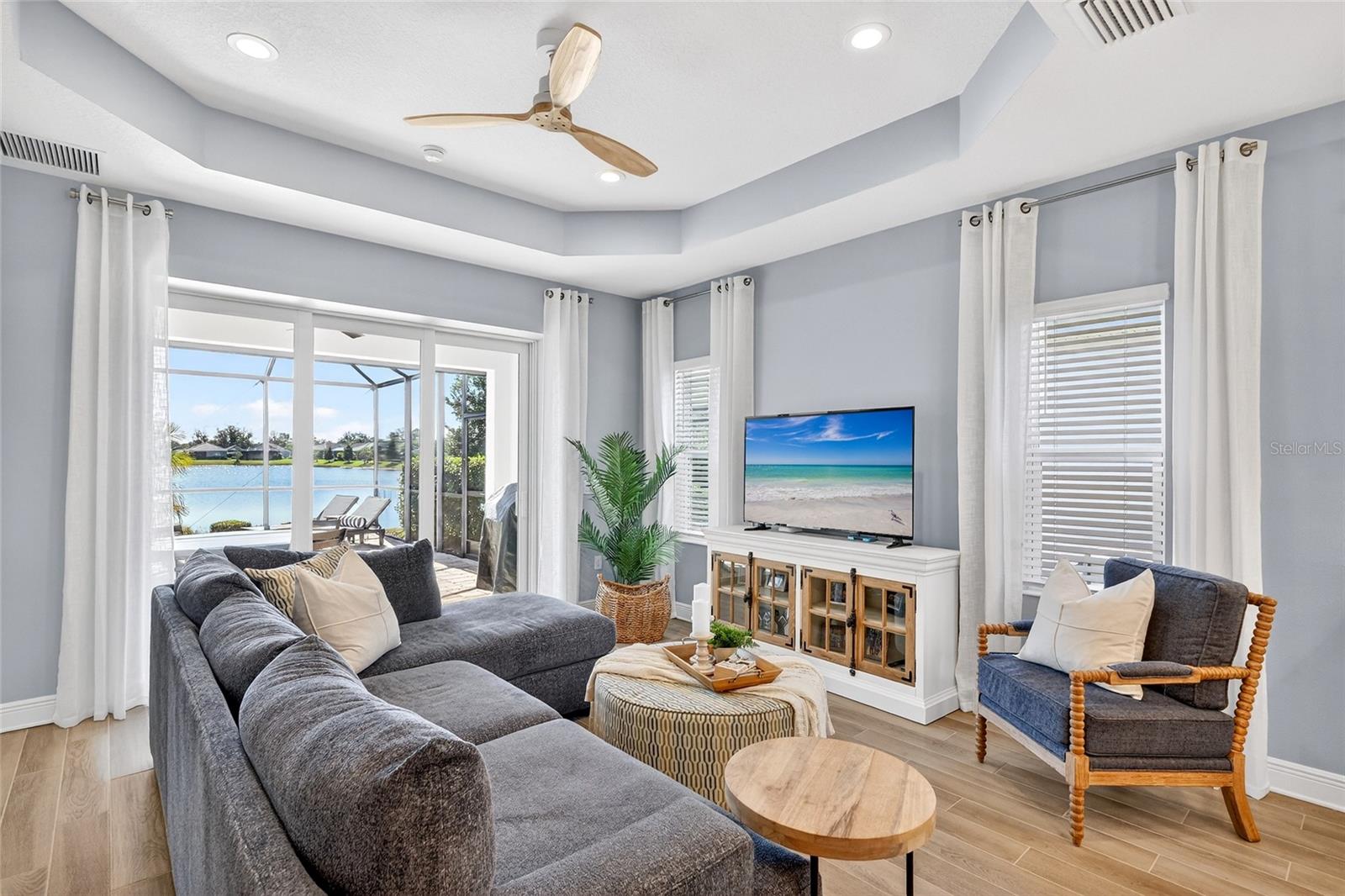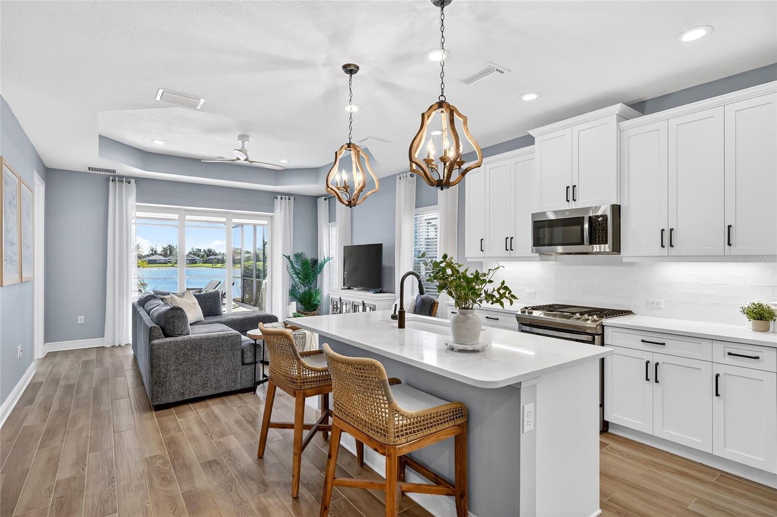 This 3-bedroom, 2-bath home with a den offers a pool, a water view, and standout storm protection with impact windows and doors plus automated hurricane screens on the covered lanai. Enjoy an easy indoor-outdoor layout with a pocket sliding door that opens wide to the lanai and view. The kitchen is finished with quartz countertops, stainless appliances, an island, a single-basin undermount sink, upgraded pendants and chandelier, and a custom pantry. Inside, wood-look tile flooring pairs with tray ceiling detail, quartz countertops throughout, and upgraded carpet in the bedrooms. The primary suite includes a barn door and a custom walk-in closet. Comfort and efficiency upgrades include a smart thermostat, UV light in the furnace, and spray foam insulation. Outdoors, the pavered lanai is set up for an outdoor kitchen with pre-plumb, complemented by the pool and water view, plus a Google Nest doorbell. The laundry room includes added cabinetry, and the garage features epoxy floors. HOA COVERS: Lawn care, Swimming Pool and Spa, Fitness Center, Clubhouse with Catering Kitchen, PickleBall, Bocce Ball, Manager, Onsite Activities Director, Security Gates. LOCATION: Centrally located. Just outside the gates are A+ schools, Gullett Elementary, Lakewood Ranch High School, and Mona Jain Middle School, LECOM, & Manatee Tech East Campus. Minutes to shopping, restaurants, gyms, salons, bars, etc. Minutes to downtown, Sarasota International Airport, the top rated beaches in the country, UTC Shopping.