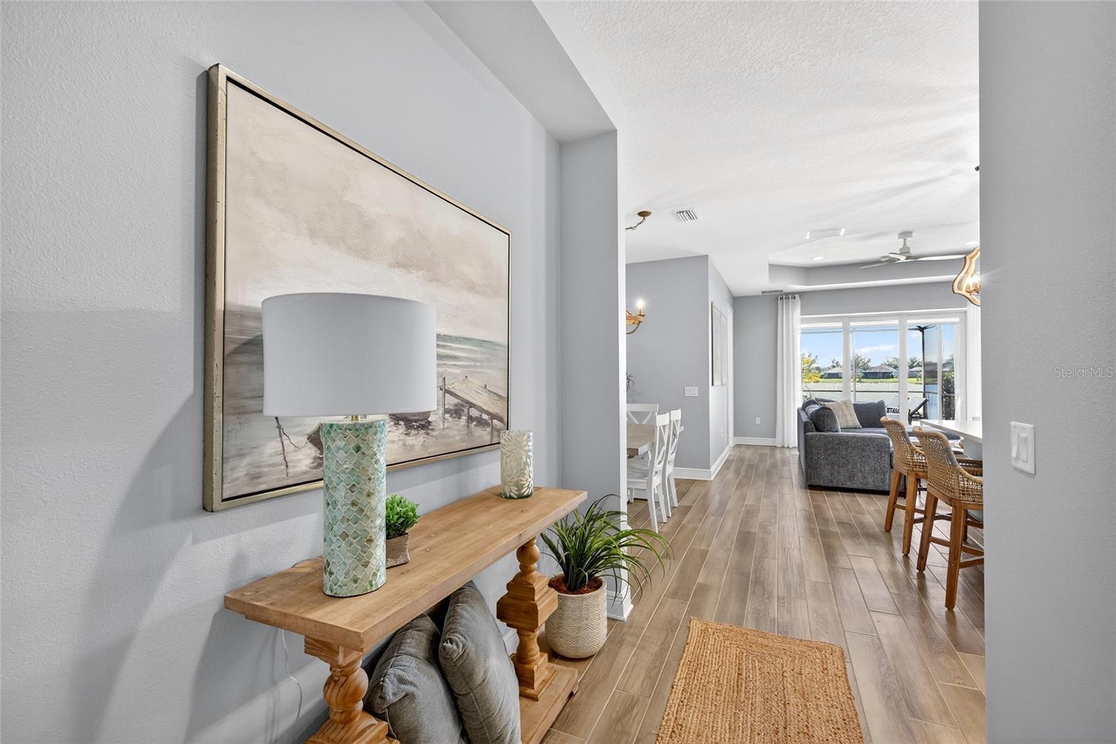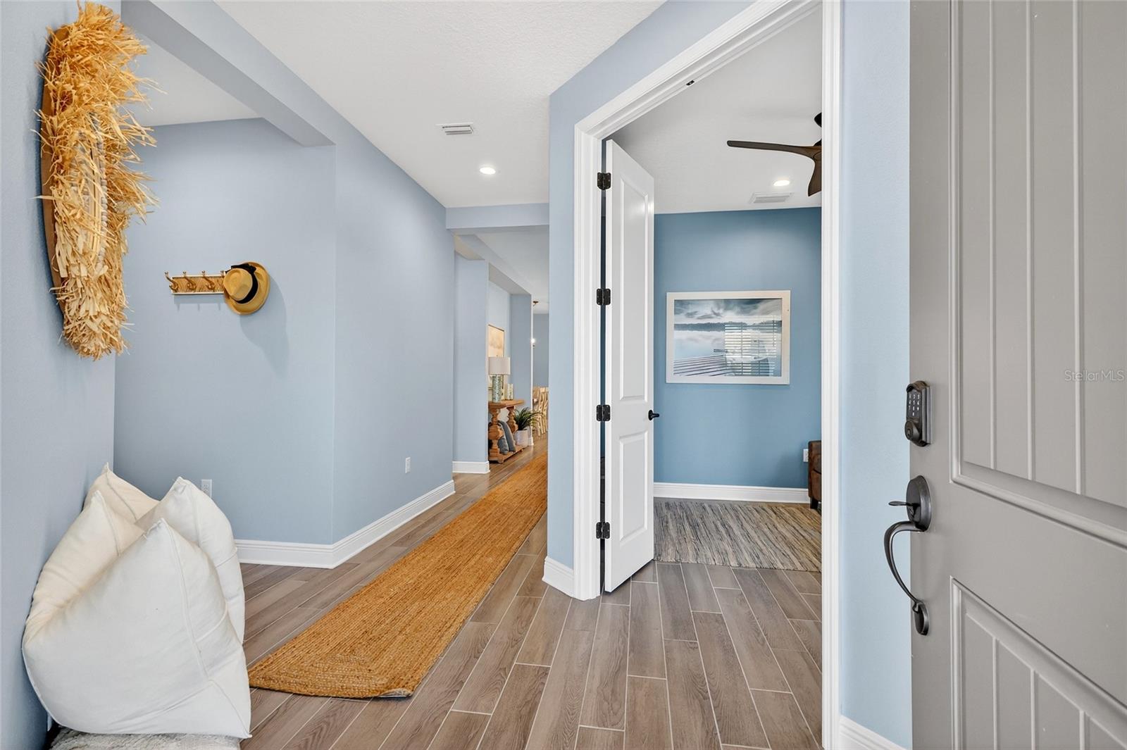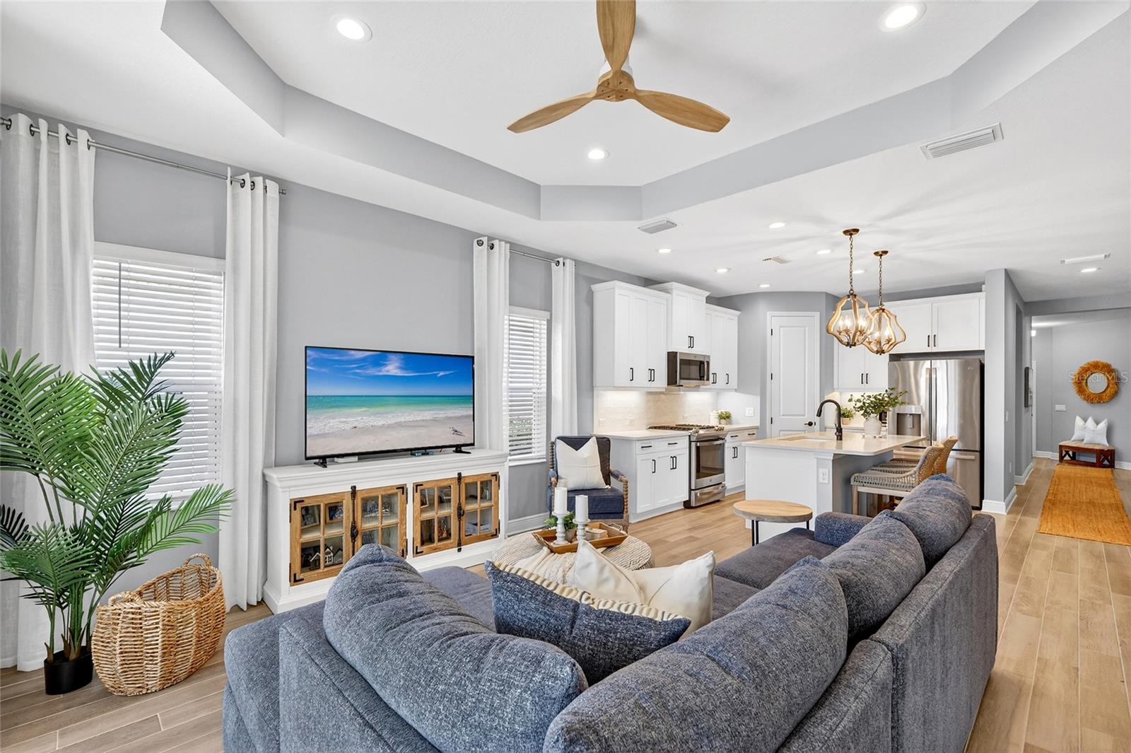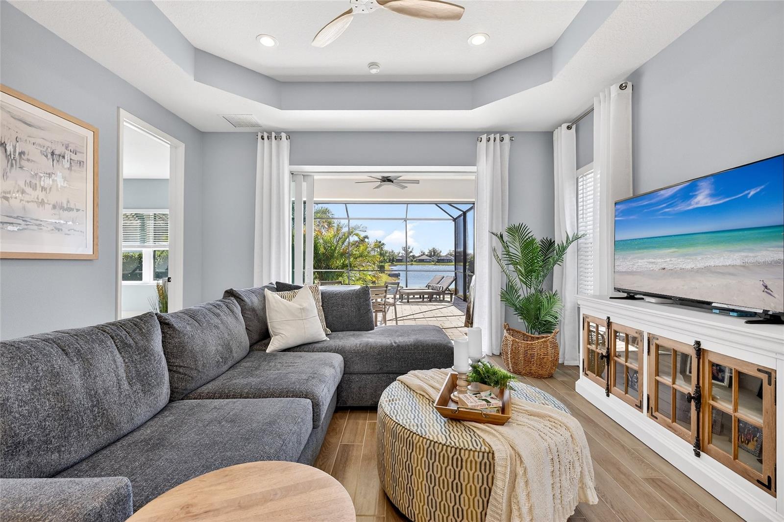 This 3-bedroom, 2-bath home with a den offers a pool, a water view, and standout storm protection with impact windows and doors plus automated hurricane screens on the covered lanai. Enjoy an easy indoor-outdoor layout with a pocket sliding door that opens wide to the lanai and view. The kitchen is finished with quartz countertops, stainless appliances, an island, a single-basin undermount sink, upgraded pendants and chandelier, and a custom pantry. Inside, wood-look tile flooring pairs with tray ceiling detail, quartz countertops throughout, and upgraded carpet in the bedrooms. The primary suite includes a barn door and a custom walk-in closet. Comfort and efficiency upgrades include a smart thermostat, UV light in the furnace, and spray foam insulation. Outdoors, the pavered lanai is set up for an outdoor kitchen with pre-plumb, complemented by the pool and water view, plus a Google Nest doorbell. The laundry room includes added cabinetry, and the garage features epoxy floors. HOA COVERS: Lawn care, Swimming Pool and Spa, Fitness Center, Clubhouse with Catering Kitchen, PickleBall, Bocce Ball, Manager, Onsite Activities Director, Security Gates. LOCATION: Centrally located. Just outside the gates are A+ schools, Gullett Elementary, Lakewood Ranch High School, and Mona Jain Middle School, LECOM, & Manatee Tech East Campus. Minutes to shopping, restaurants, gyms, salons, bars, etc. Minutes to downtown, Sarasota International Airport, the top rated beaches in the country, UTC Shopping.