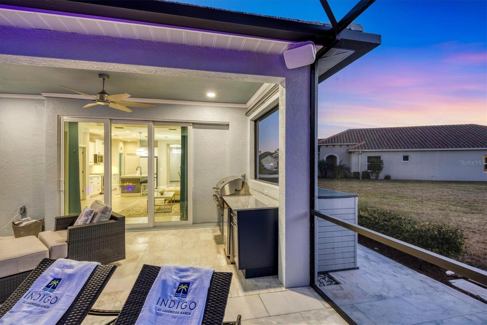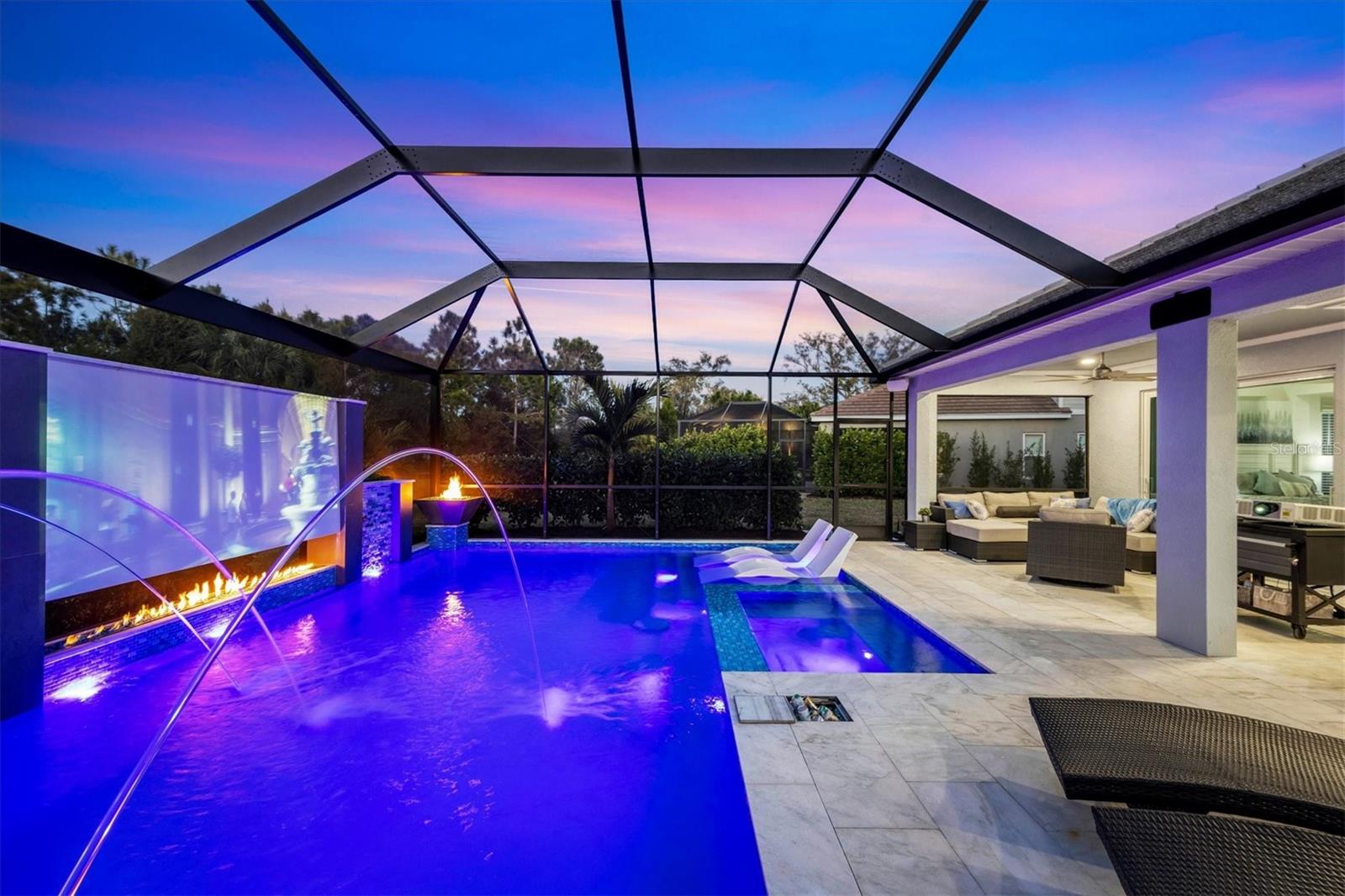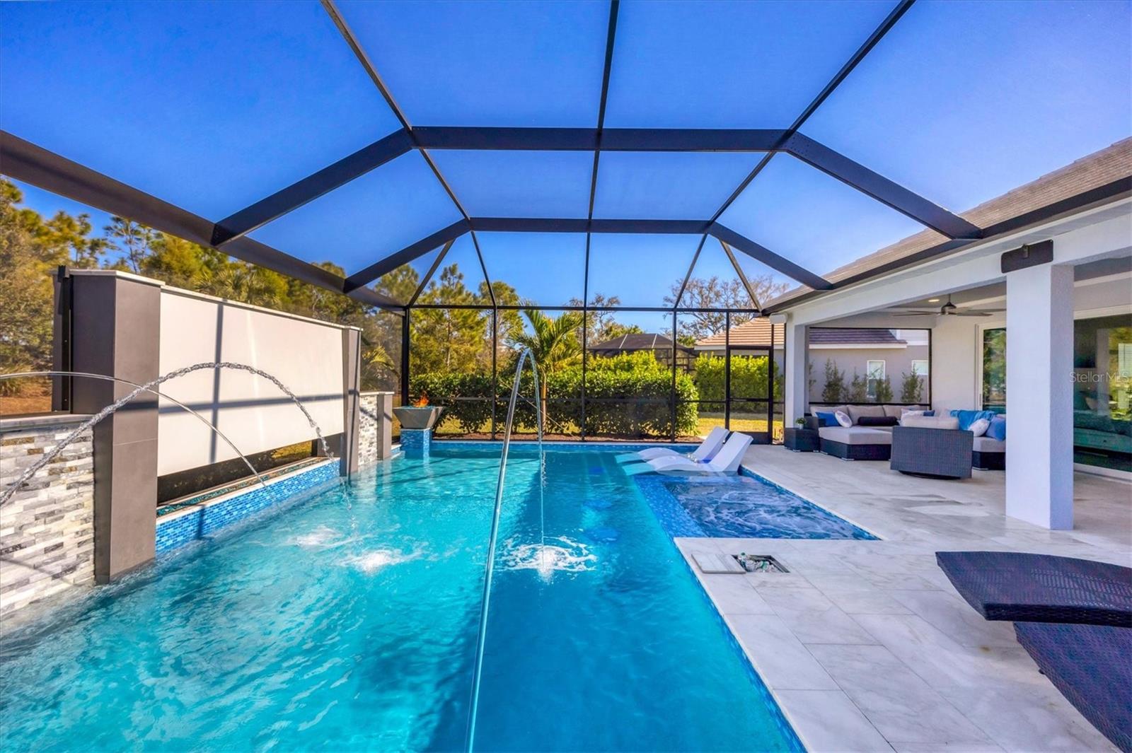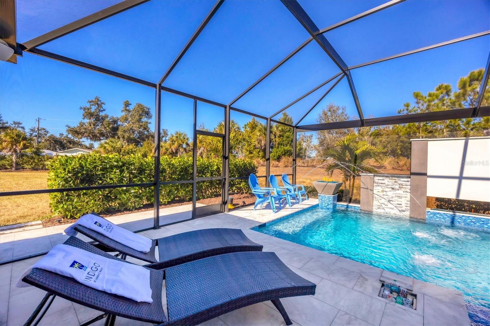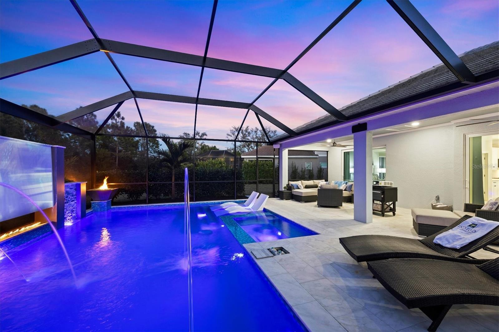 Wait till you see this "Heritage" floorplan with its modern features, impeccable condition AND private pie shaped lot on a cul-de-sac road! This expansive home boasts 4 bedrooms, a LARGE loft area, 3 bathrooms, 2-car garage and a breathtaking covered lanai space with a one off ultra premium saltwater pool spa! Rest assured your new home is built strong and safe with its HURRICANE IMPACT rated glass throughout, cinder block construction, concrete tile roof, ''Guardian'' home alarm system and is located in the highly desirable X floodzone. Throughout the interior you will find 5 1/4" deco baseboards, multiple trey ceilings, LED recessed lighting, high level quartz countertops throughout, custom cabinetry in closets and much more! This home will continue to surprise you with it's private pet room located under the staircase, with its easy access and private location, your beloved pet (s) will be overjoyed to have their own space to relax. The great room with its expansive tray ceiling showcases a spacious environment with more than enough room to entertain guests. For all you kitchen enthusiasts, you will surely gravitate to this custom kitchen featuring a large Island with breakfast bar, upgraded porcelain backsplash, shaker cabinetry with LED undermount lighting that complements the high-level quartz countertops, and an oversized walk-in pantry. The exterior of this home sits very well with its larger than normal lot size, super private rear setting, and brand-new professionally installed landscaping throughout which further sets this home apart from the others! Open up the three paneled HURRICANE IMPACT rated POCKET sliders and prepare to be absolutely amazed! As you walk on the premium marble flooring upon entering the lanai, you'll be in absolute awe of the custom built-in kitchenette with "Bull" stainless steel gas grill with a matching fridge AND one of the most desirable pools seen in a residential home. This expansive fully optioned pool has: numerous water features, movie wall with "Sonos" outdoor sound system with underground subwoofer, TWO fire bowls with a fire trey under movie wall, multi-color LED lighting for pool/spa/barstoools with vertically mounted wall lights, "PebbleTec' with luminous glass blend and shimmering seas abalone, gas and electric heating, salt chlorinator w/Ph monitoring AND integrated dosing system, sunshelf w/umbrella sleeve, built-in deck drink cooler right next to your LARGE SIX person spa with DUAL QUAD therapeutic jet system all ran off its own dedicated jet pump. ALL of this can be operated from your smart device! WOW is right..Indigo is an active community that features a full time on-site manager as well as a full time activities director that manages an extensive calendar of activities for all ages. A-Rated Gullett Elementary AND Mona Jain Middle school are right outside our gates too! You can also expect sidewalks on both sides of the street, ''Oasis'' pool/spa, resort style heated community pool/spa at the main clubhouse where you will find 5 cabanas with an abundance of seating, 4 pickleball courts, 2 bocce ball courts, 24-hour exercise gym, meeting room/banquet room and playground. Indigo is not only a community that takes care of all ground maintenance to include mowing, fertilizing, irrigation, shrubs and mulch but is right around the corner to a plethora of dining, banking, entertainment, public transportation and MORE!