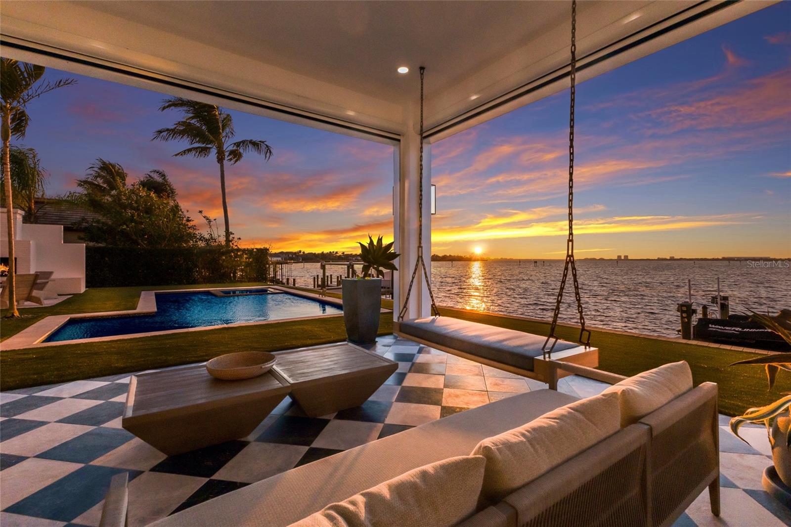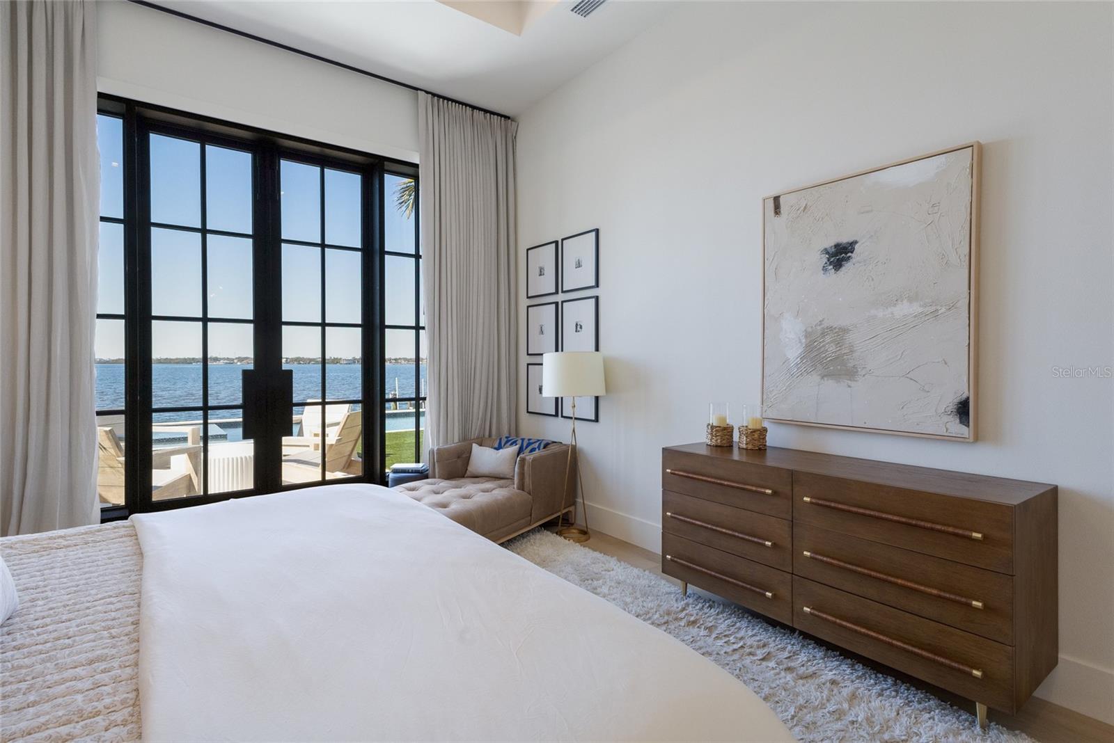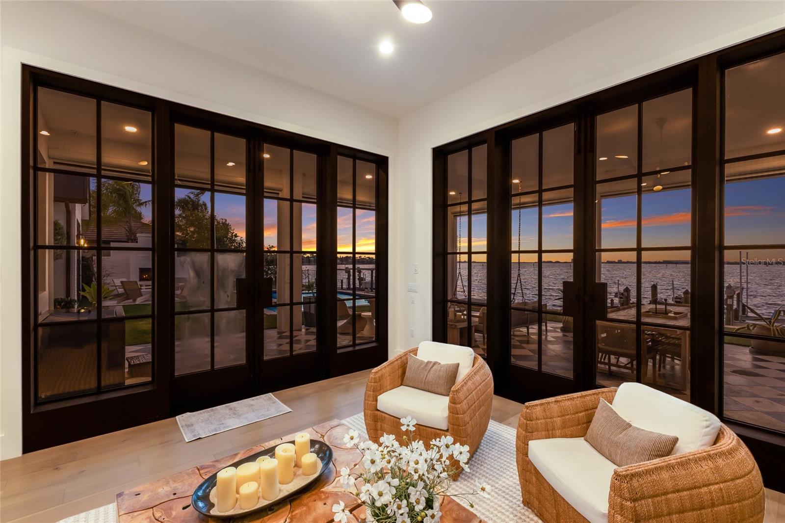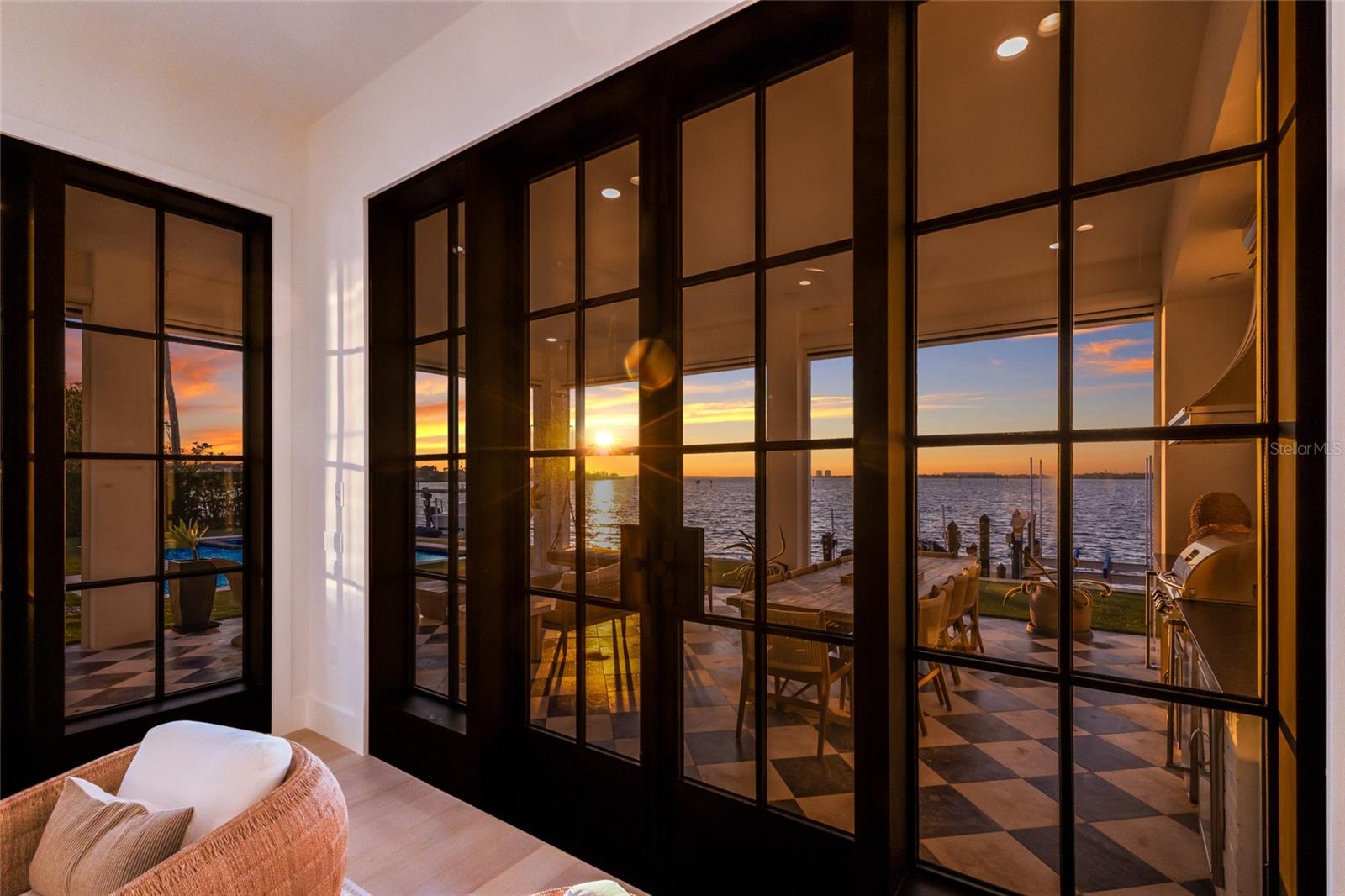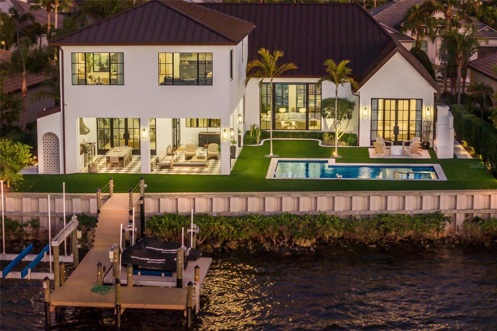 WELCOME to a breathtaking WATERFRONT masterpiece in the EXCLUSIVE double-gated BOATING community of The Reserve at Harbour Walk, where a PRIVATE deep-water DOCK on the Manatee River with direct access to the Gulf of Mexico sets the stage for a life of unmatched luxury, tranquility, and adventure. Built by CAMLIN Custom Homes, this 5,147 sq ft CUSTOM ESTATE offers 4 bedrooms plus a den or office, 3.5 baths, and a 4 car garage, all designed with a peaceful, Zen inspired aesthetic where every detail has been thoughtfully curated and flawlessly executed. A dramatic GLASS and STEEL front door opens to soaring, light-filled interiors with uninterrupted blue-water views that draw your eye straight through the home to the pool and river beyond. The living room is a showpiece with a custom CONCRETE GAS FIREPLACE, illuminated built-in shelving, wood beams in the vaulted ceiling, and an entire wall of oversized windows capturing the serene backdrop. The chef’s kitchen showcases custom cabinetry, MARBLE countertops and backsplash, a massive entertainer’s island with a thick granite slab, Belfast sink, seating, gold accents, and world-class appliances including a SUB-ZERO designer series refrigerator and freezer and a rare LACANCHE UL SULLY CLASSIQUE range IMPORTED from France, plus a custom pantry behind an iron and steel sliding door. The open dining area flows seamlessly for entertaining, while an additional family room with double FRENCH DOORS offers a relaxed escape to the lanai. The owner’s suite is PRIVATELY tucked away and features CUSTOM his-and-hers closets, a spa-inspired ENSUITE bath with a glass enclosed STEAM shower with twin showerheads, built-in bench, side jets, a garden tub, dual vanities, a dedicated makeup area and private lanai access beneath a tray ceiling with custom WOOD BEAMS. Two additional bedrooms share a beautifully appointed Jack-and-Jill bath with marble countertops, dual sinks, and a tub/shower combo. A STUNNING temperature-controlled wine room enclosed in iron and glass with custom cabinetry adds a dramatic focal point for entertaining. Upstairs, you will find a fourth bedroom with custom BUILT-INS, a MEDIA and GAME room with wood beams, river views, and a bespoke WET BAR with sink and refrigerator drawers, along with a flexible FITNESS AREA, a sunlit OFFICE with water views, and a full bath with an oversized glass walk-in shower and custom marble-topped vanity. The entire home is equipped with HURRICANE IMPACT GLASS for peace of mind. Step outside to your private RESORT with a pool and spa overlooking the water, a custom WOOD-BURNING fireplace with seating, a charming DOUBLE SWING, checkered-pattern lanai tile, a fully equipped OUTDOOR KITCHEN and outdoor SHOWER, creating the ultimate space for relaxation, entertaining, and unforgettable SUNSET evenings. Your PRIVATE DOCK is fully equipped with a 16,000 lb BOAT LIFT, TWIN JET SKI LIFT, and fiberglass HEAT-RESISTANT composite decking, creating the perfect launch point for boating, fishing, paddleboarding, and sunset cruises. Residents of this private enclave enjoy pickleball and tennis courts, a playground, kayak and canoe launches, and peaceful walking paths, all within a custom home community known for its LUXURY, privacy, and natural beauty. This extraordinary residence is truly move-in ready and offers a rare opportunity to own a one-of-a-kind waterfront sanctuary where elegance, craftsmanship, and lifestyle come together in perfect harmony.