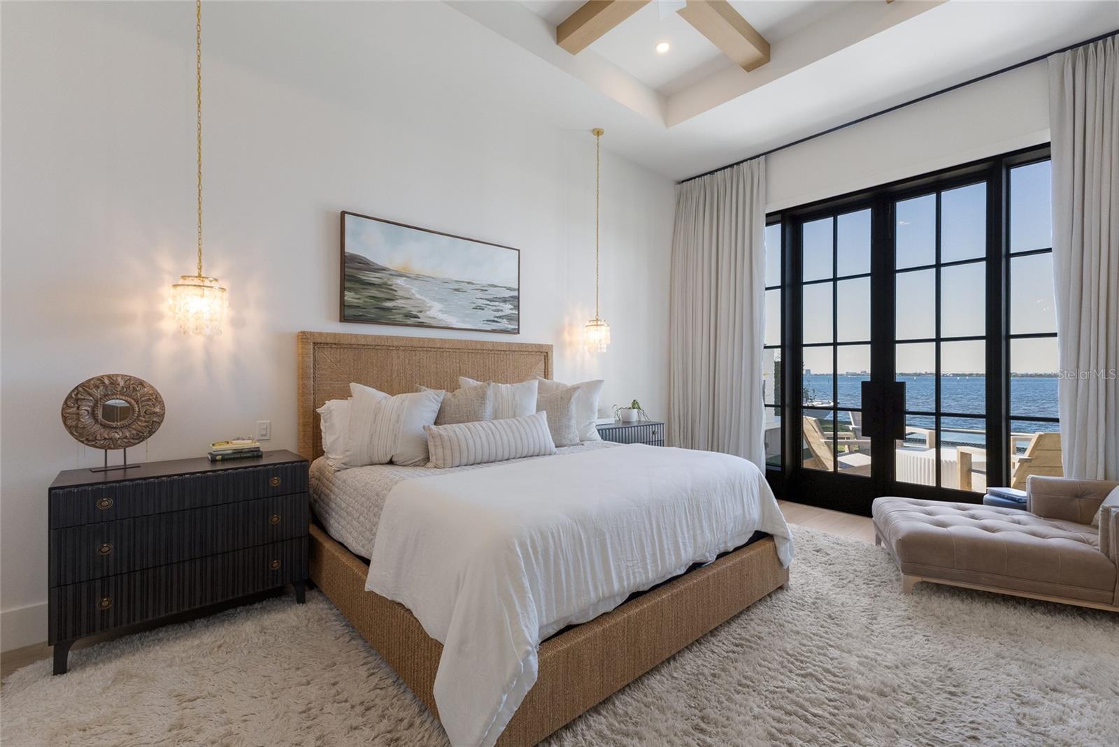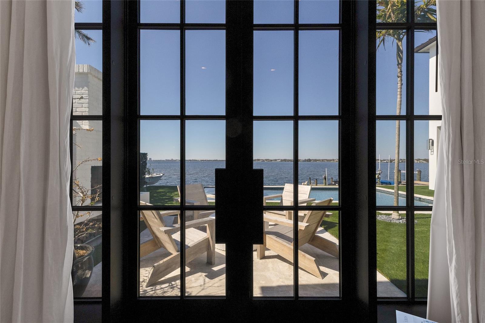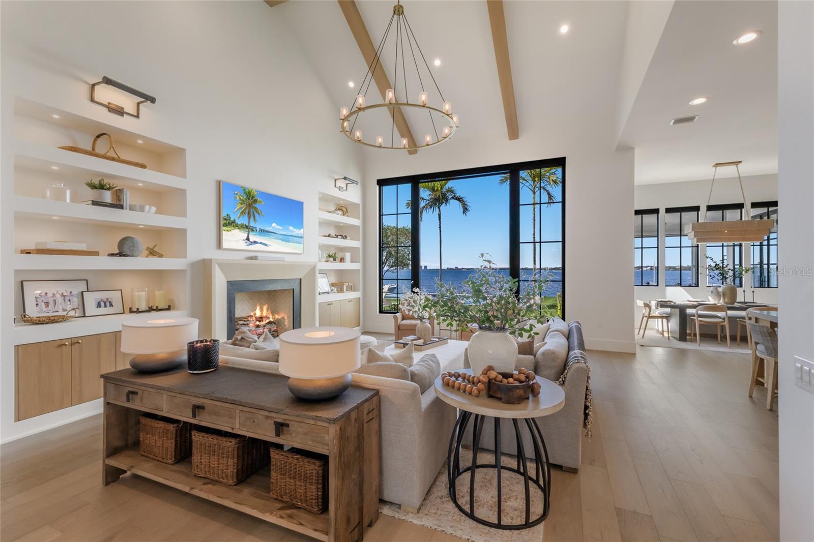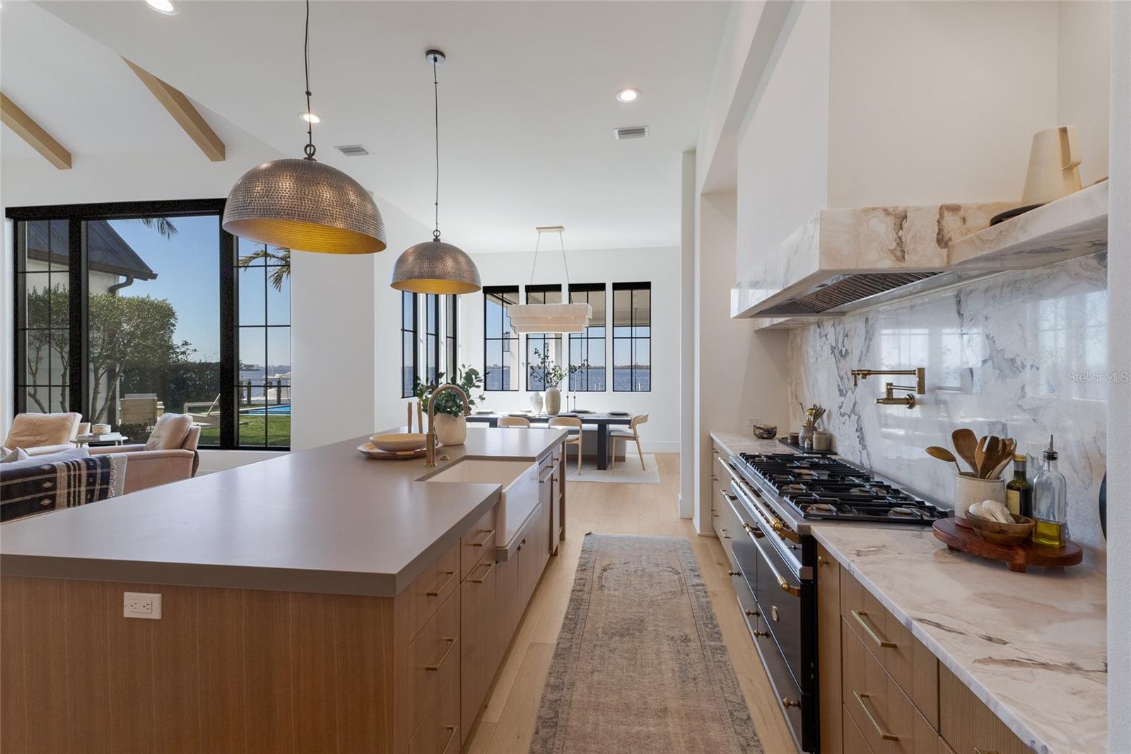 WELCOME to a breathtaking WATERFRONT masterpiece in the EXCLUSIVE double-gated BOATING community of The Reserve at Harbour Walk, where a PRIVATE deep-water DOCK on the Manatee River with direct access to the Gulf of Mexico sets the stage for a life of unmatched luxury, tranquility, and adventure. Built by CAMLIN Custom Homes, this 5,147 sq ft CUSTOM ESTATE offers 4 bedrooms plus a den or office, 3.5 baths, and a 4 car garage, all designed with a peaceful, Zen inspired aesthetic where every detail has been thoughtfully curated and flawlessly executed. A dramatic GLASS and STEEL front door opens to soaring, light-filled interiors with uninterrupted blue-water views that draw your eye straight through the home to the pool and river beyond. The living room is a showpiece with a custom CONCRETE GAS FIREPLACE, illuminated built-in shelving, wood beams in the vaulted ceiling, and an entire wall of oversized windows capturing the serene backdrop. The chef’s kitchen showcases custom cabinetry, MARBLE countertops and backsplash, a massive entertainer’s island with a thick granite slab, Belfast sink, seating, gold accents, and world-class appliances including a SUB-ZERO designer series refrigerator and freezer and a rare LACANCHE UL SULLY CLASSIQUE range IMPORTED from France, plus a custom pantry behind an iron and steel sliding door. The open dining area flows seamlessly for entertaining, while an additional family room with double FRENCH DOORS offers a relaxed escape to the lanai. The owner’s suite is PRIVATELY tucked away and features CUSTOM his-and-hers closets, a spa-inspired ENSUITE bath with a glass enclosed STEAM shower with twin showerheads, built-in bench, side jets, a garden tub, dual vanities, a dedicated makeup area and private lanai access beneath a tray ceiling with custom WOOD BEAMS. Two additional bedrooms share a beautifully appointed Jack-and-Jill bath with marble countertops, dual sinks, and a tub/shower combo. A STUNNING temperature-controlled wine room enclosed in iron and glass with custom cabinetry adds a dramatic focal point for entertaining. Upstairs, you will find a fourth bedroom with custom BUILT-INS, a MEDIA and GAME room with wood beams, river views, and a bespoke WET BAR with sink and refrigerator drawers, along with a flexible FITNESS AREA, a sunlit OFFICE with water views, and a full bath with an oversized glass walk-in shower and custom marble-topped vanity. The entire home is equipped with HURRICANE IMPACT GLASS for peace of mind. Step outside to your private RESORT with a pool and spa overlooking the water, a custom WOOD-BURNING fireplace with seating, a charming DOUBLE SWING, checkered-pattern lanai tile, a fully equipped OUTDOOR KITCHEN and outdoor SHOWER, creating the ultimate space for relaxation, entertaining, and unforgettable SUNSET evenings. Your PRIVATE DOCK is fully equipped with a 16,000 lb BOAT LIFT, TWIN JET SKI LIFT, and fiberglass HEAT-RESISTANT composite decking, creating the perfect launch point for boating, fishing, paddleboarding, and sunset cruises. Residents of this private enclave enjoy pickleball and tennis courts, a playground, kayak and canoe launches, and peaceful walking paths, all within a custom home community known for its LUXURY, privacy, and natural beauty. This extraordinary residence is truly move-in ready and offers a rare opportunity to own a one-of-a-kind waterfront sanctuary where elegance, craftsmanship, and lifestyle come together in perfect harmony.