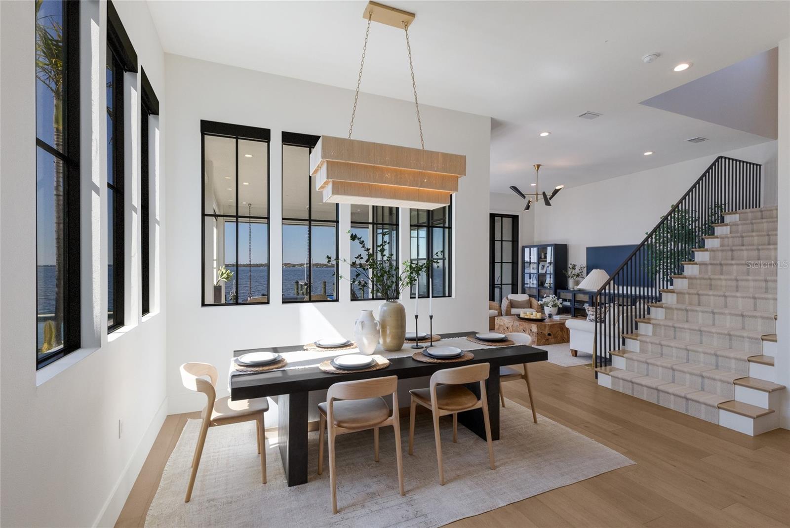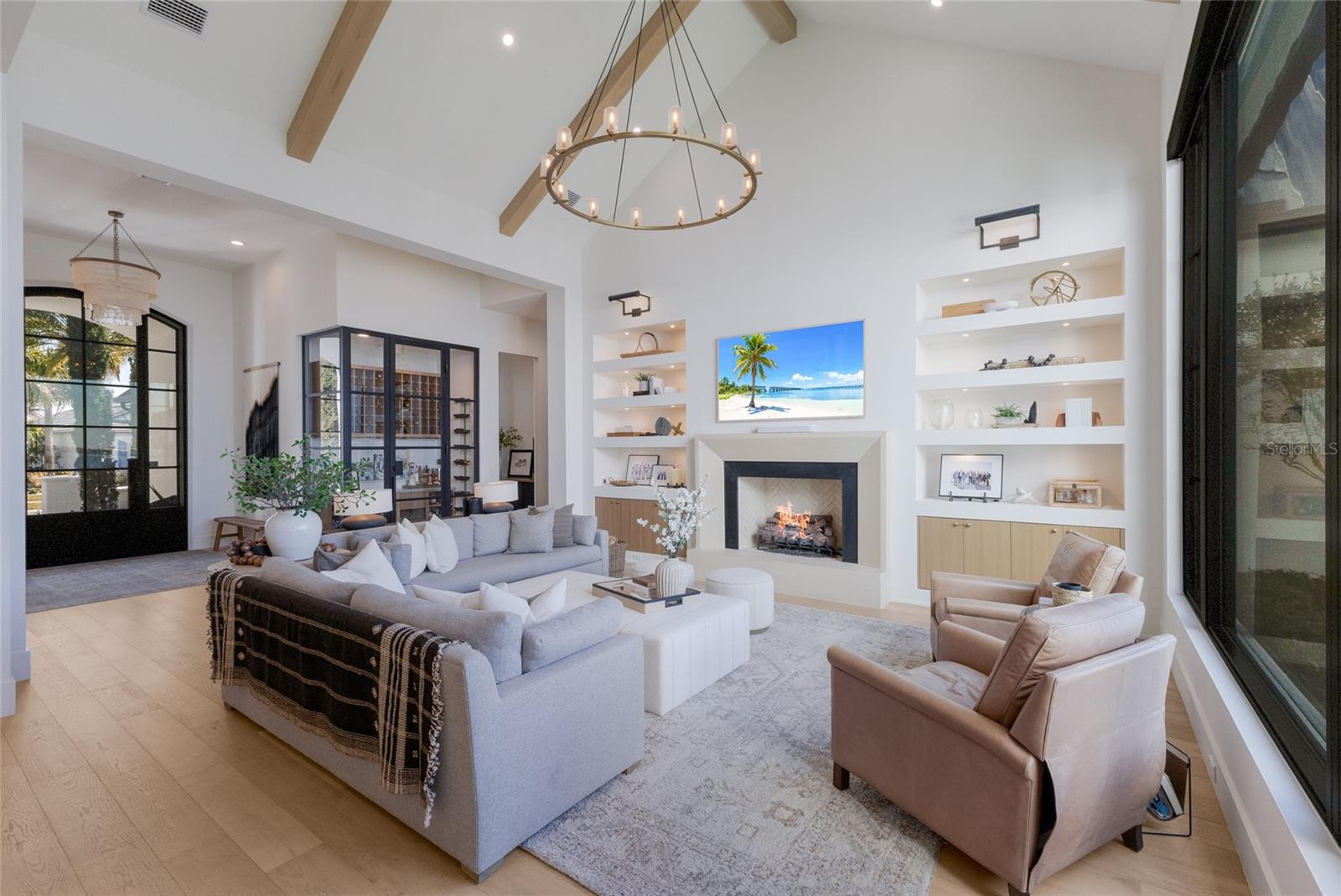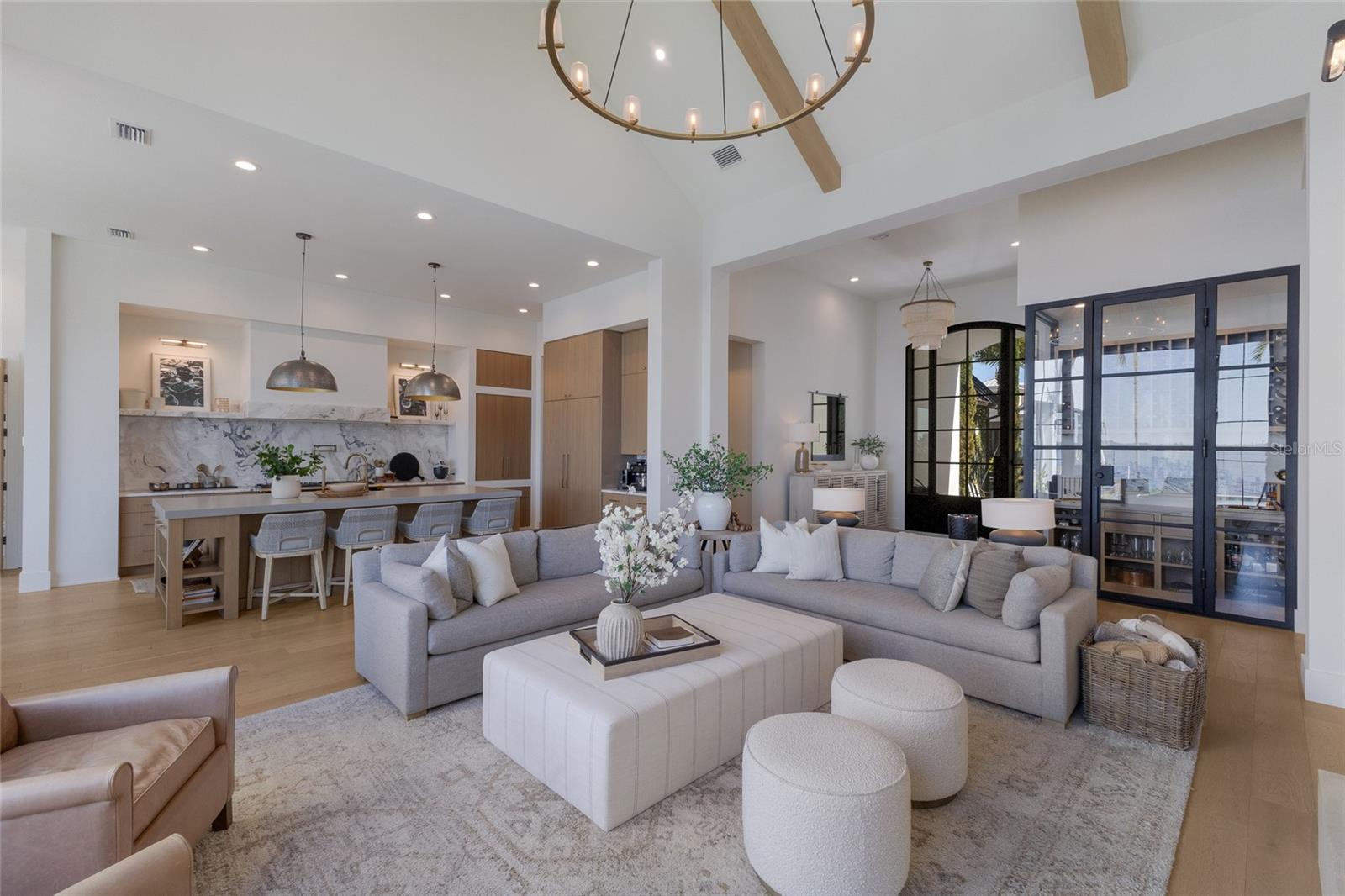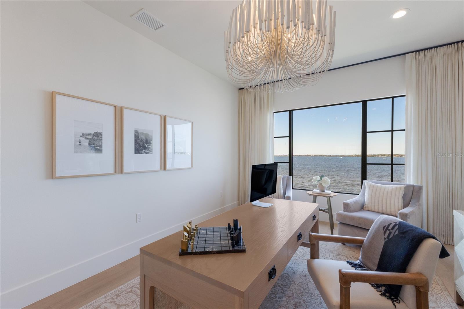 WELCOME to a breathtaking WATERFRONT masterpiece in the EXCLUSIVE double-gated BOATING community of The Reserve at Harbour Walk, where a PRIVATE deep-water DOCK on the Manatee River with direct access to the Gulf of Mexico sets the stage for a life of unmatched luxury, tranquility, and adventure. Built by CAMLIN Custom Homes, this 5,147 sq ft CUSTOM ESTATE offers 4 bedrooms plus a den or office, 3.5 baths, and a 4 car garage, all designed with a peaceful, Zen inspired aesthetic where every detail has been thoughtfully curated and flawlessly executed. A dramatic GLASS and STEEL front door opens to soaring, light-filled interiors with uninterrupted blue-water views that draw your eye straight through the home to the pool and river beyond. The living room is a showpiece with a custom CONCRETE GAS FIREPLACE, illuminated built-in shelving, wood beams in the vaulted ceiling, and an entire wall of oversized windows capturing the serene backdrop. The chef’s kitchen showcases custom cabinetry, MARBLE countertops and backsplash, a massive entertainer’s island with a thick granite slab, Belfast sink, seating, gold accents, and world-class appliances including a SUB-ZERO designer series refrigerator and freezer and a rare LACANCHE UL SULLY CLASSIQUE range IMPORTED from France, plus a custom pantry behind an iron and steel sliding door. The open dining area flows seamlessly for entertaining, while an additional family room with double FRENCH DOORS offers a relaxed escape to the lanai. The owner’s suite is PRIVATELY tucked away and features CUSTOM his-and-hers closets, a spa-inspired ENSUITE bath with a glass enclosed STEAM shower with twin showerheads, built-in bench, side jets, a garden tub, dual vanities, a dedicated makeup area and private lanai access beneath a tray ceiling with custom WOOD BEAMS. Two additional bedrooms share a beautifully appointed Jack-and-Jill bath with marble countertops, dual sinks, and a tub/shower combo. A STUNNING temperature-controlled wine room enclosed in iron and glass with custom cabinetry adds a dramatic focal point for entertaining. Upstairs, you will find a fourth bedroom with custom BUILT-INS, a MEDIA and GAME room with wood beams, river views, and a bespoke WET BAR with sink and refrigerator drawers, along with a flexible FITNESS AREA, a sunlit OFFICE with water views, and a full bath with an oversized glass walk-in shower and custom marble-topped vanity. The entire home is equipped with HURRICANE IMPACT GLASS for peace of mind. Step outside to your private RESORT with a pool and spa overlooking the water, a custom WOOD-BURNING fireplace with seating, a charming DOUBLE SWING, checkered-pattern lanai tile, a fully equipped OUTDOOR KITCHEN and outdoor SHOWER, creating the ultimate space for relaxation, entertaining, and unforgettable SUNSET evenings. Your PRIVATE DOCK is fully equipped with a 16,000 lb BOAT LIFT, TWIN JET SKI LIFT, and fiberglass HEAT-RESISTANT composite decking, creating the perfect launch point for boating, fishing, paddleboarding, and sunset cruises. Residents of this private enclave enjoy pickleball and tennis courts, a playground, kayak and canoe launches, and peaceful walking paths, all within a custom home community known for its LUXURY, privacy, and natural beauty. This extraordinary residence is truly move-in ready and offers a rare opportunity to own a one-of-a-kind waterfront sanctuary where elegance, craftsmanship, and lifestyle come together in perfect harmony.