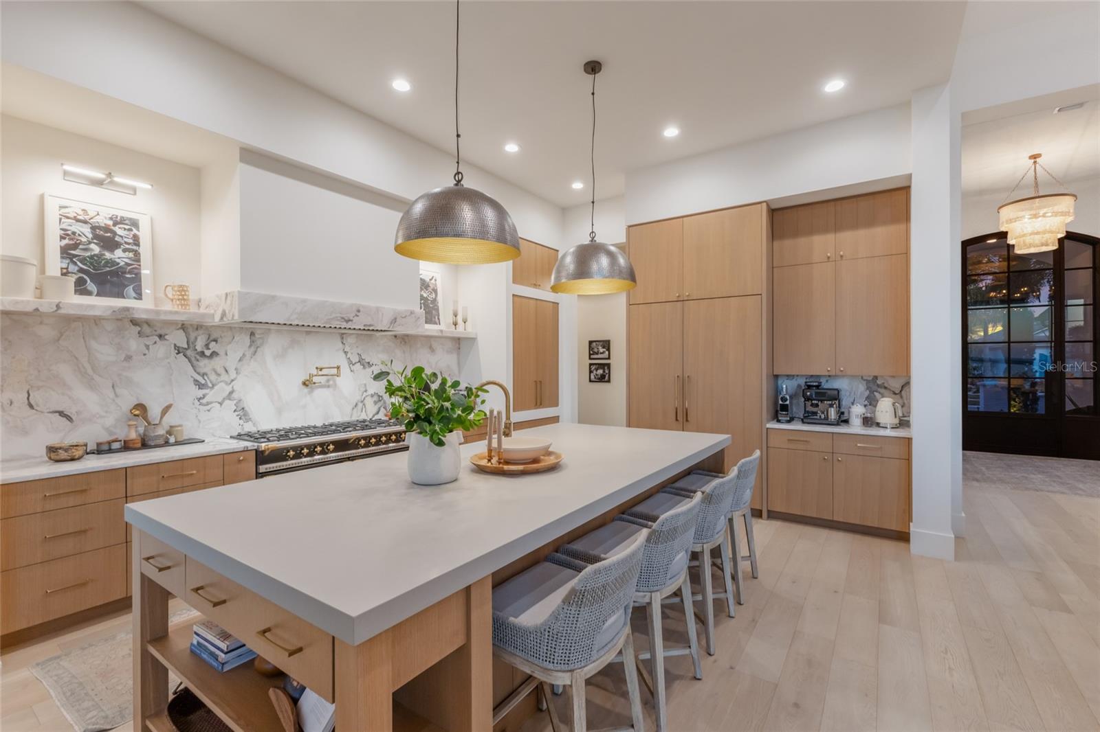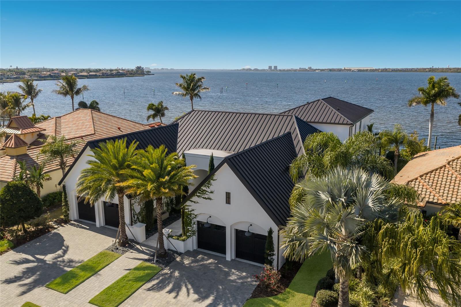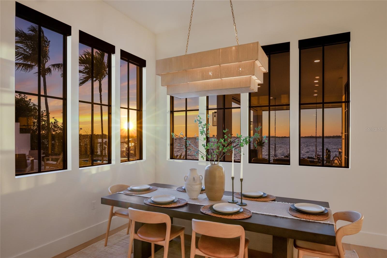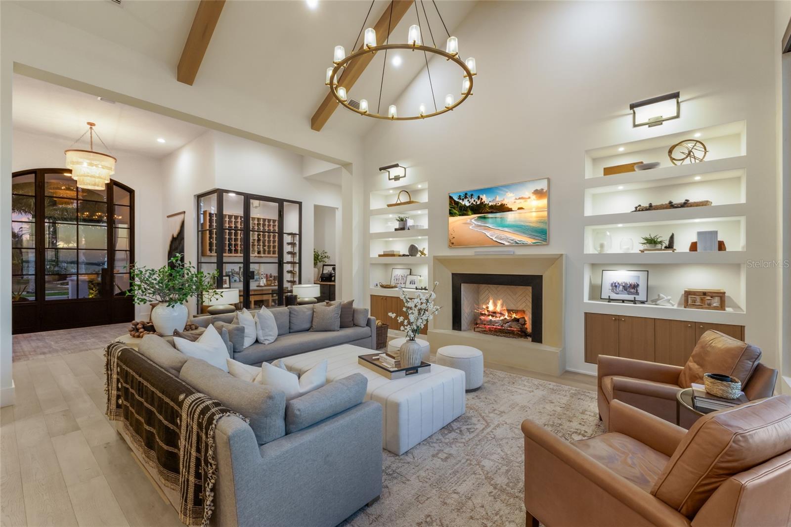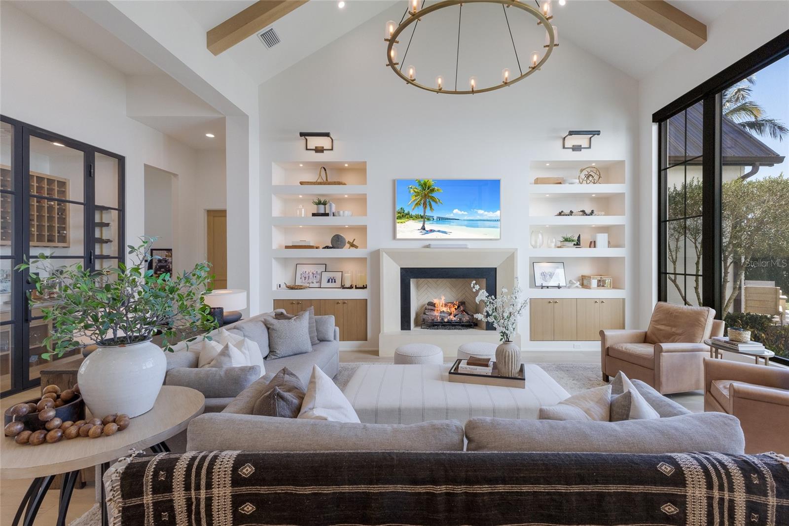 WELCOME to a breathtaking WATERFRONT masterpiece in the EXCLUSIVE double-gated BOATING community of The Reserve at Harbour Walk, where a PRIVATE deep-water DOCK on the Manatee River with direct access to the Gulf of Mexico sets the stage for a life of unmatched luxury, tranquility, and adventure. Built by CAMLIN Custom Homes, this 5,147 sq ft CUSTOM ESTATE offers 4 bedrooms plus a den or office, 3.5 baths, and a 4 car garage, all designed with a peaceful, Zen inspired aesthetic where every detail has been thoughtfully curated and flawlessly executed. A dramatic GLASS and STEEL front door opens to soaring, light-filled interiors with uninterrupted blue-water views that draw your eye straight through the home to the pool and river beyond. The living room is a showpiece with a custom CONCRETE GAS FIREPLACE, illuminated built-in shelving, wood beams in the vaulted ceiling, and an entire wall of oversized windows capturing the serene backdrop. The chef’s kitchen showcases custom cabinetry, MARBLE countertops and backsplash, a massive entertainer’s island with a thick granite slab, Belfast sink, seating, gold accents, and world-class appliances including a SUB-ZERO designer series refrigerator and freezer and a rare LACANCHE UL SULLY CLASSIQUE range IMPORTED from France, plus a custom pantry behind an iron and steel sliding door. The open dining area flows seamlessly for entertaining, while an additional family room with double FRENCH DOORS offers a relaxed escape to the lanai. The owner’s suite is PRIVATELY tucked away and features CUSTOM his-and-hers closets, a spa-inspired ENSUITE bath with a glass enclosed STEAM shower with twin showerheads, built-in bench, side jets, a garden tub, dual vanities, a dedicated makeup area and private lanai access beneath a tray ceiling with custom WOOD BEAMS. Two additional bedrooms share a beautifully appointed Jack-and-Jill bath with marble countertops, dual sinks, and a tub/shower combo. A STUNNING temperature-controlled wine room enclosed in iron and glass with custom cabinetry adds a dramatic focal point for entertaining. Upstairs, you will find a fourth bedroom with custom BUILT-INS, a MEDIA and GAME room with wood beams, river views, and a bespoke WET BAR with sink and refrigerator drawers, along with a flexible FITNESS AREA, a sunlit OFFICE with water views, and a full bath with an oversized glass walk-in shower and custom marble-topped vanity. The entire home is equipped with HURRICANE IMPACT GLASS for peace of mind. Step outside to your private RESORT with a pool and spa overlooking the water, a custom WOOD-BURNING fireplace with seating, a charming DOUBLE SWING, checkered-pattern lanai tile, a fully equipped OUTDOOR KITCHEN and outdoor SHOWER, creating the ultimate space for relaxation, entertaining, and unforgettable SUNSET evenings. Your PRIVATE DOCK is fully equipped with a 16,000 lb BOAT LIFT, TWIN JET SKI LIFT, and fiberglass HEAT-RESISTANT composite decking, creating the perfect launch point for boating, fishing, paddleboarding, and sunset cruises. Residents of this private enclave enjoy pickleball and tennis courts, a playground, kayak and canoe launches, and peaceful walking paths, all within a custom home community known for its LUXURY, privacy, and natural beauty. This extraordinary residence is truly move-in ready and offers a rare opportunity to own a one-of-a-kind waterfront sanctuary where elegance, craftsmanship, and lifestyle come together in perfect harmony.