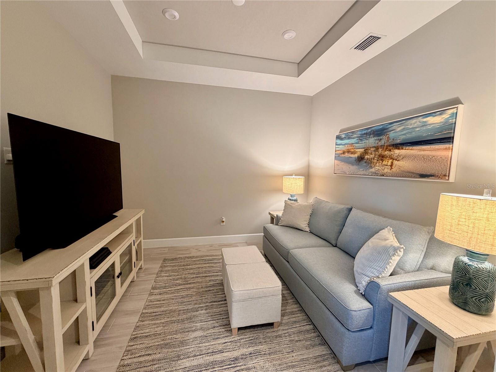 This beautifully appointed Ibis villa offers an exceptional opportunity to enjoy maintenance-free living in the highly sought-after Esplanade at Azario in Lakewood Ranch. Designed for comfort, convenience, and effortless entertaining, this home is ideal for those looking to downsize, relocate, or enjoy a seasonal Florida retreat. A landscaped private walkway leads to the front entry and into a light-filled, open-concept layout featuring tray ceilings, crown molding, and thoughtfully selected upgrades throughout. The kitchen, dining, and living areas flow seamlessly, creating an inviting space for everyday living and entertaining with gorgeous wood-look porcelain tile. The well-appointed kitchen features shaker-style cabinetry, stainless steel appliances, and generous counter space. The dining area is ideal for casual meals or intimate gatherings, while the living room opens through sliding glass doors to an extended screened-in lanai, providing a private setting to enjoy Florida’s indoor-outdoor lifestyle with no rear neighbors! Sunshades have been added to the lanai area for maximum privacy and sun-filtering. The primary suite offers a peaceful retreat with a tray ceiling and a large picture window. The ensuite bath includes dual vanities, a spacious walk-in shower, and an oversized walk-in closet. A private guest suite is located on the opposite side of the home and features its own walk-in closet and full bath. A versatile den with pocket doors provides flexible space for a home office, media room, or additional guest area. Additional features include a two-car garage with ceiling-mounted storage. Residents of Esplanade at Azario enjoy world-class, resort-style amenities, including a full-service spa, Bahama bar, multiple resort pools, fitness center, Culinary Center, Barrel House restaurant, on-site pizzeria, coffee shop, and a vibrant calendar of social events. The community also offers an 18-hole championship golf course with pay-to-play access through 2026, tennis, pickleball, and scenic walking trails. Conveniently located in the heart of Lakewood Ranch, this home provides easy access to top-rated schools, shopping, dining, and Gulf Coast beaches. This villa offers the perfect blend of luxury, convenience, and an exceptional lifestyle. Come live the good life in Azario!