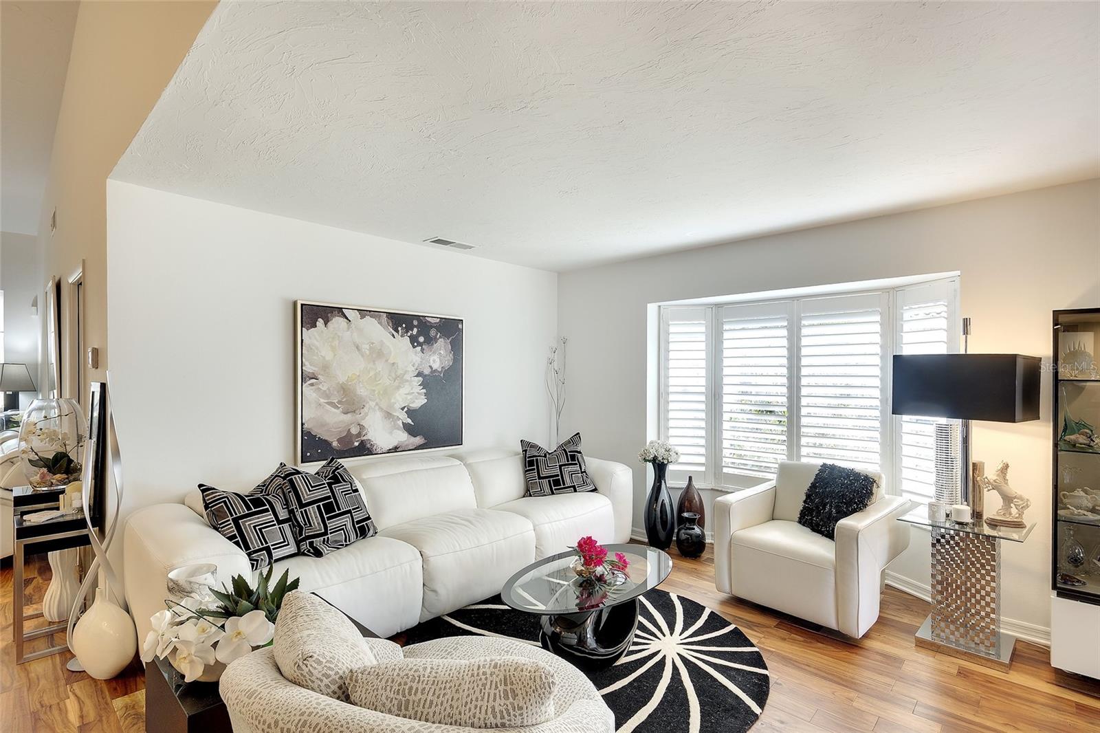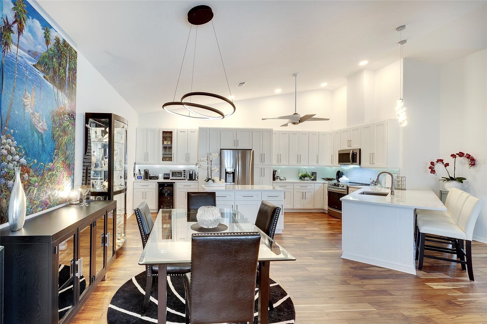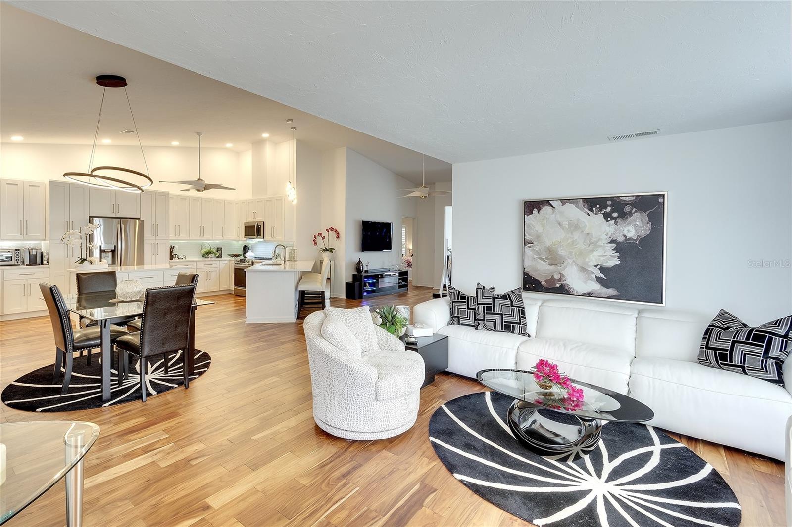Here's one that delivers! This beautifully renovated villa offers a rare opportunity to enjoy stylish, low maintenance living in a popular gated 55+ community in a great location, situated close to shopping, I-75, UTC & downtown Sarasota/Bradenton. This spacious villa offers soaring ceilings, a flowing open floor plan, warm wood floors, and striking designer lighting, the interior feels both modern and welcoming. The expansive kitchen is a true showstopper, featuring white painted wood cabinetry with pullouts, a large work island, counter seating, quartz countertops, glass tile backsplash, and a beverage center with glass uppers and wine fridge. Newer stainless appliances include a refrigerator and microwave (2025), with additional appliances updated in 2021. NEUTRAL paint throughout, refreshed baths with updated vanities, lighting, commodes, and tile, and the absence of wallpaper or popcorn ceilings make this home completely MOVE IN READY. A unique INTERIOR LAUNDRY room—accessible from the main living area—includes a washer and dryer (2021), a feature not commonly found in the community. Major systems have been updated for peace of mind, including a new A/C and water heater (2025). Additional highlights include a Florida room with air conditioning, a private paver patio, an expansive, private rear grassy area, and lovely landscaping with paver front walkway. The garage features a utility sink, shelving, and an epoxy floor. Residents of Garden Lakes enjoy winding streets, mature trees, walking paths, and an active clubhouse with pool, kitchen, library, multi-pupose room, fitness, tennis, pickleball, and HOA fees at a fraction of similar communities. Many planned activities. Designed for easy living and entertaining, this is a must see, all in a desireable, friendly community.