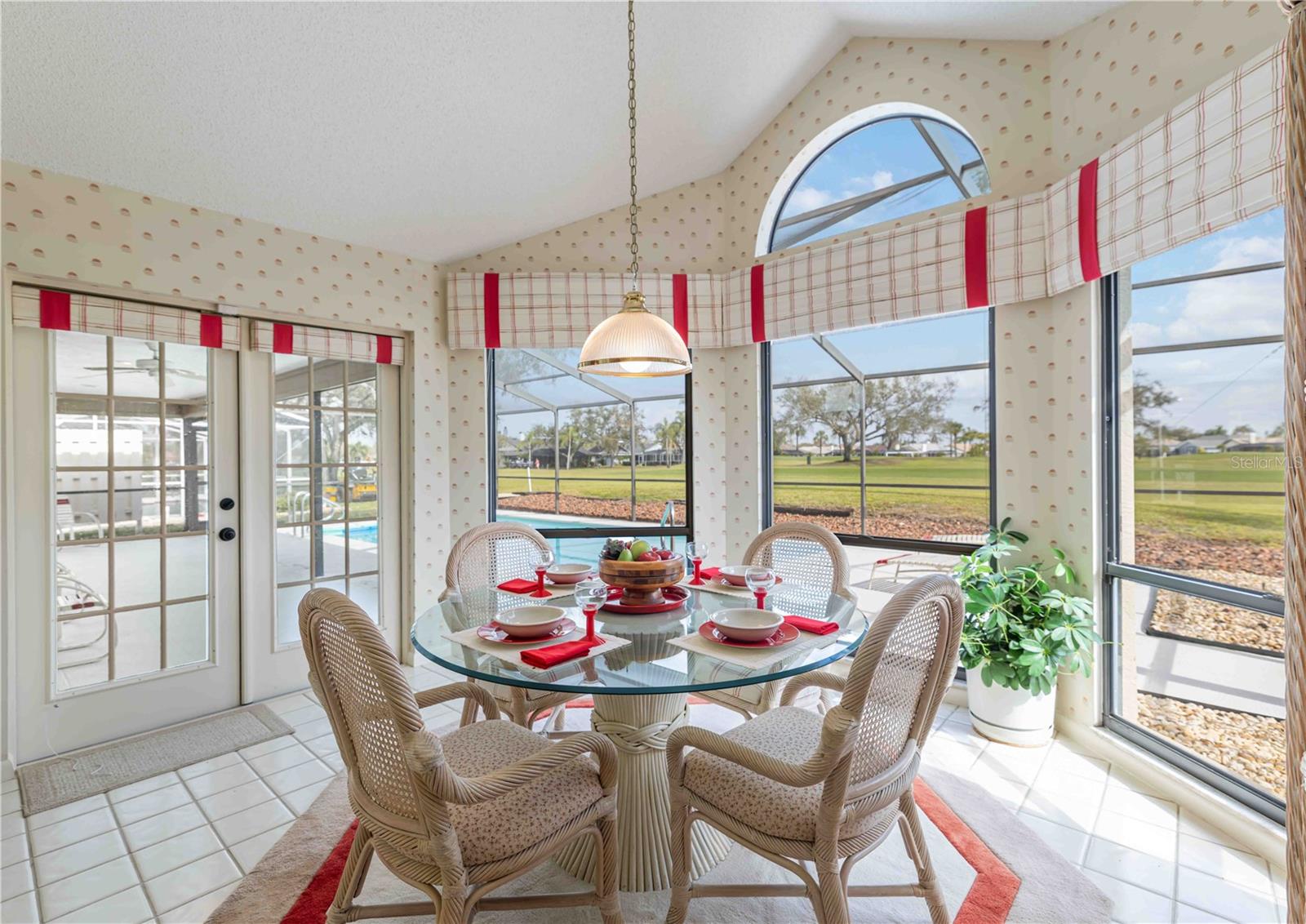 YOUR PERFECT FLORIDA RETREAT AWAITS! Discover this hidden gem located on the 10th fairway of Peridia Golf and Country Club. This former Arthur Rutenberg Somerset III Model has been meticulously maintained and ready for you to call home. Gently used as a second home this split floorplan has 2 bedrooms, 2 baths, den, dining room, pool, and golf course views from almost every room. Enter into the great room with vaulted ceiling, a large dining area that opens to the screened patio and private heated pool. There is a delightful dining cafe off the kitchen with panoramic windows/views of the fairway. The den/office has built in desk and bookshelves. The spacious master bedroom is ensuite with walk in-shower, dual sinks, beautiful stained glass wall window and walk-in closet. The split floorplan affords privacy for the guest bedroom and bath. A two-car garage allows extra space for storage. Most furnishings are included in the sale. HOA includes cable TV and internet. And there are no CDD fees! Peridia Golf and Country Club offers exceptional, resort-style living which includes cllub dining and lounge that features live music on Friday nights, Sunday brunch, heated community pool and tiki bar with Sunday afternoon live vibes, tennis and pickleball courts, bridge, mahjong, and book clubs to name a few. And every homeowner has a golf club memebership. With a full calendar of social events, there is something to do for everyone in Perida. Community is located close to I-75 for easy access to Tampa, St. Petersburg and Sarasota.