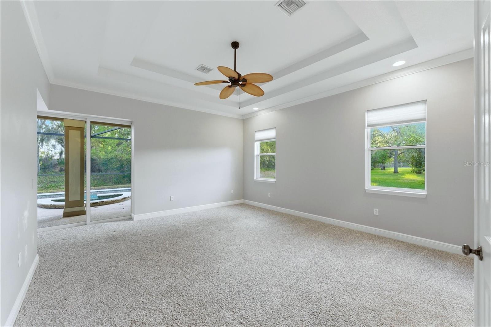 Elegant executive-style home in Mill Creek offering 3,257 sq ft of living space with 4 bedrooms, 3 full baths, and a den in a desirable split floor plan. Situated on a private ½-acre lot, this home features tray ceilings, formal living and dining rooms, and a spacious family room with pocket sliders opening to the screened lanai and pool, creating seamless indoor-outdoor living. The gourmet kitchen showcases custom cabinetry, stainless steel appliances, a large island, breakfast bar, and sunny breakfast nook. A striking disappearing corner slider enhances both the family room and the primary suite, which offers a step-up garden tub and oversized walk-in shower. Additional highlights include custom built-ins in the dining room and den, a large laundry room, and a 3-car garage. The private backyard provides a peaceful setting for relaxing or entertaining.