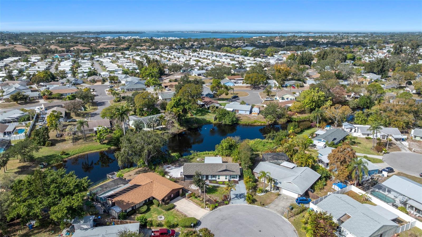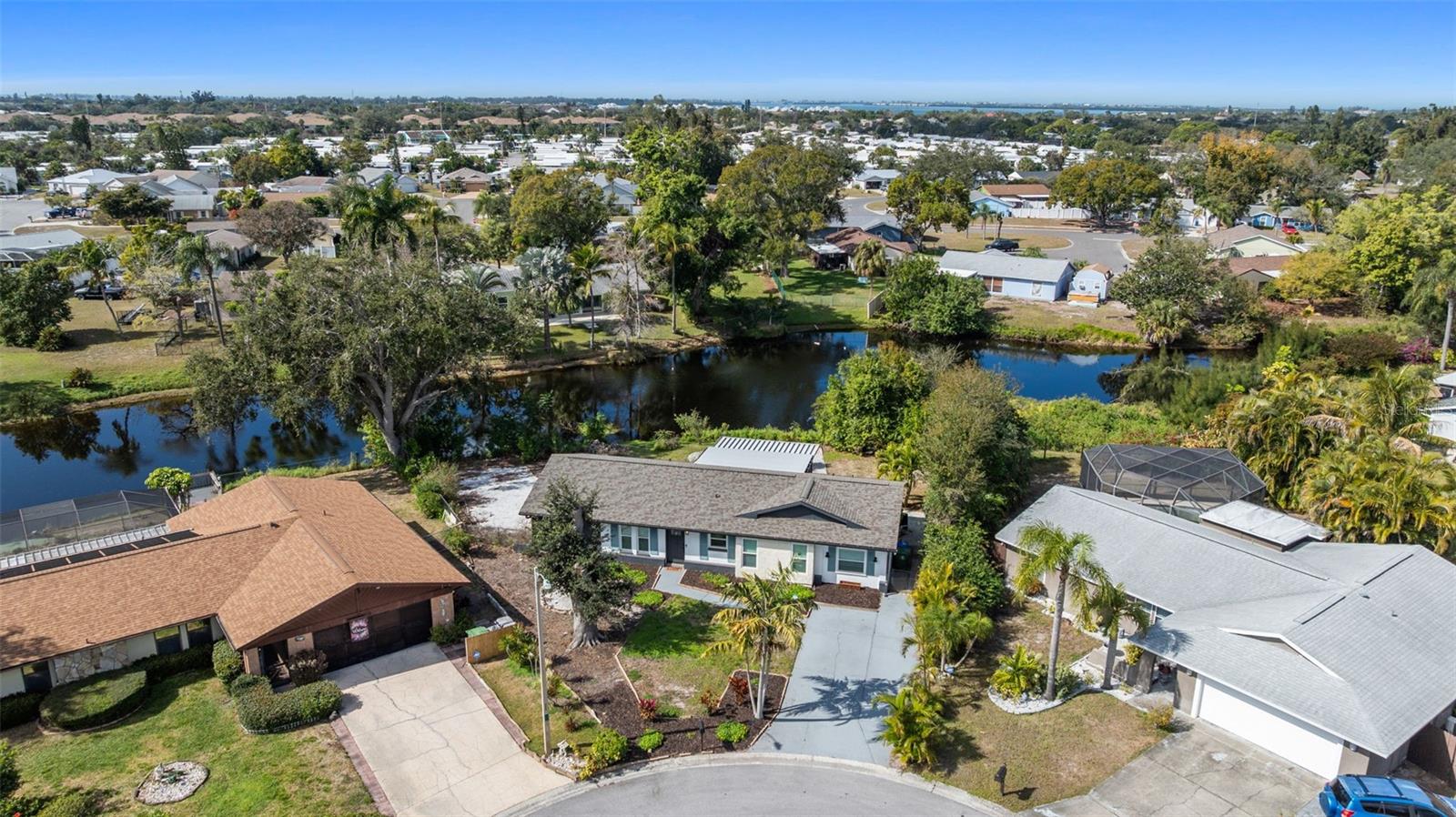 Short Sale. Nestled on a quiet cul-de-sac, this fully renovated 3-bedroom, 2-bath home sits on an oversized 0.42-acre lot with about 90 feet of unobstructed lake frontage, offering a serene and private setting. A brand-new roof and freshly painted exterior give the home a clean, modern look with standout curb appeal. Inside, the open floor plan is bright and inviting, enhanced by large windows that flood the space with natural light. Stylish brushed gold and matte black accents add a sleek, contemporary feel throughout. The updated kitchen serves as the heart of the home, featuring white quartz countertops, custom soft-close cabinetry, and stainless steel appliances—perfectly blending beauty and functionality. Dimmable recessed lighting and expansive windows create a warm ambiance suited for both entertaining and daily living. The split-bedroom design offers added privacy, with a tranquil primary suite that includes a generous walk-in closet and a spa-like bathroom with elegant marble flooring. Two additional bedrooms provide comfortable space for guests or family. A spacious utility/mudroom with a new Samsung washer and dryer adds everyday convenience. Outdoor living is just as appealing, with a screened lanai ideal for morning coffee or evening relaxation. The large backyard extends to the lake and is intentionally minimally landscaped, giving you the freedom to design your own outdoor oasis, garden, or custom retreat, supported by a well irrigation system. Built with comfort and security in mind, the home includes impact windows, a whole-house water filtration system, custom Levolor window treatments, and a full security system with cameras. Located just 4.5 miles from Anna Maria Island’s beaches and close to the shops and restaurants along Cortez Road, this lakeside property offers a perfect balance of privacy, style, and coastal convenience.