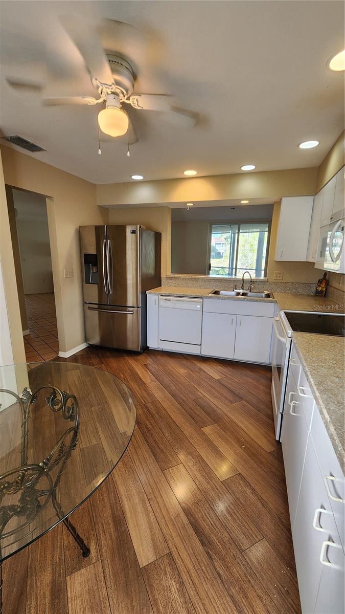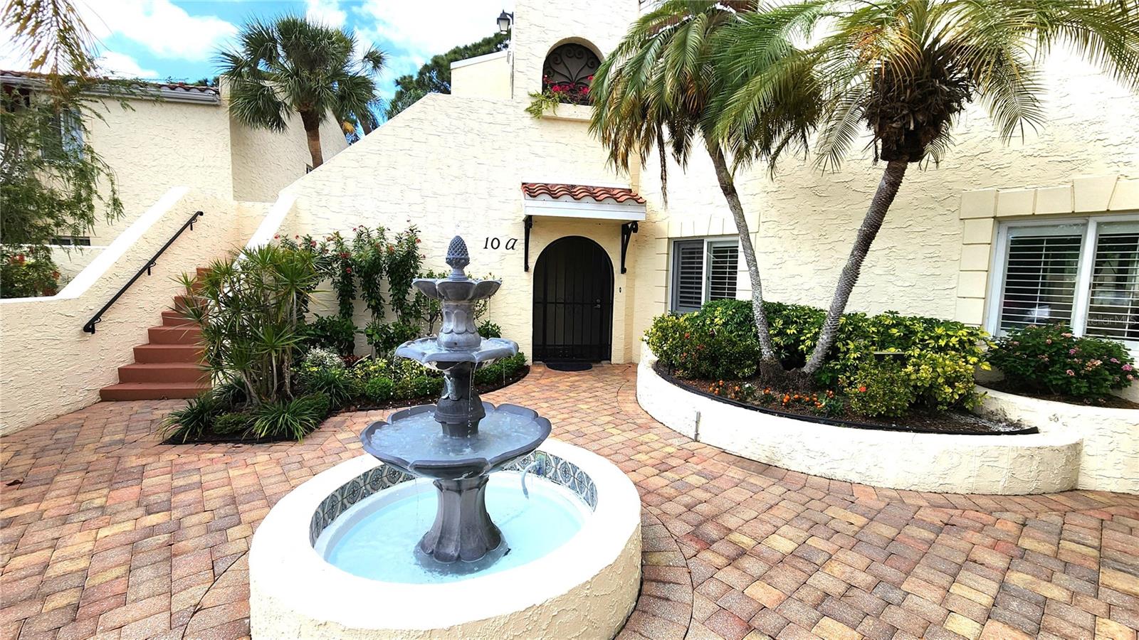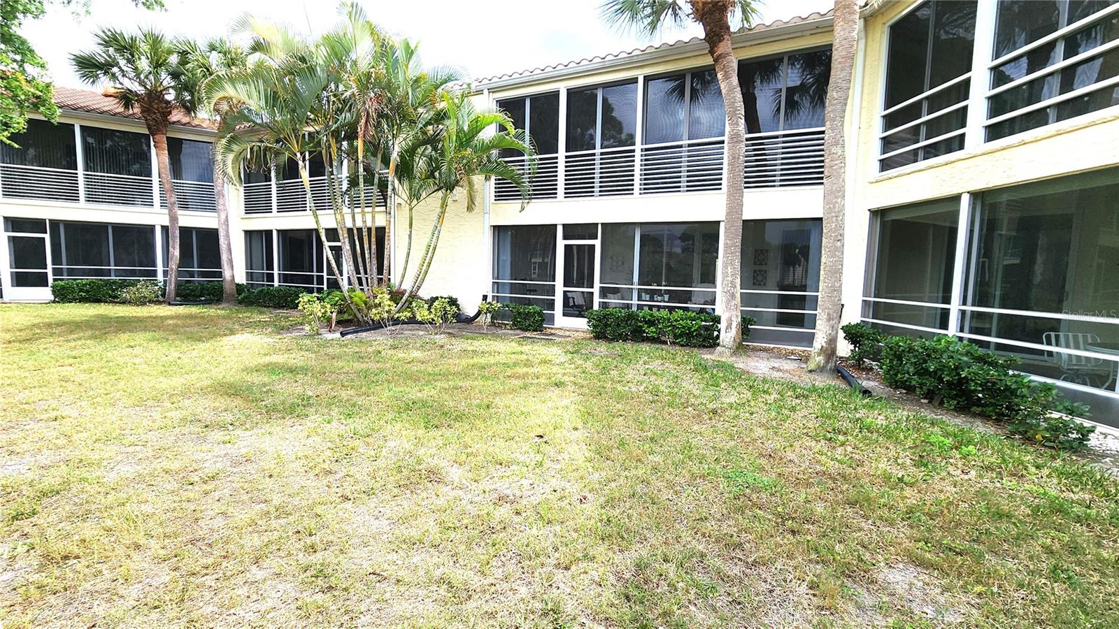 One or more photo(s) has been virtually staged. Welcome to this spacious 2-bedroom, 2-bath FIRST-FLOOR END-UNIT condo in the sought-after Vizcaya community, offering 1,341 square feet of living space and a great opportunity to add your personal touch. Perfectly positioned with a peaceful rear pond view, this residence provides both privacy and a serene setting to enjoy Florida living. Step inside to find tile and laminate flooring throughout, creating a clean, cohesive look with easy maintenance. The spacious layout flows effortlessly, with a bright living and dining area that opens through sliders to a fully screened lanai—ideal for enjoying your morning coffee while overlooking the tranquil water view. The primary en-suite is a true retreat, featuring TWO WALK-IN CLOSETS, a relaxing garden tub, and a separate stall shower. Both the primary bathroom and guest bedroom provide unique private access to a garden area ready for the next owner's personal touches, bringing added character and an inviting outdoor feel. Offered PARTIALLY FURNISHED, including kitchen items, this home is move-in ready and perfect for a seasonal getaway or full-time residence. Vizcaya's resort-style amenities include a heated pool and spa, clubhouse, fitness center, sauna, and library - all set among lushly landscaped grounds within this highly sough-after gated community. Conveniently located 12 minutes from SRQ Airport, 8-10 miles to St. Armands Circle, Lido Beach, and Anna Maria Island, shopping, dining, downtown attractions, golf, and so much more!