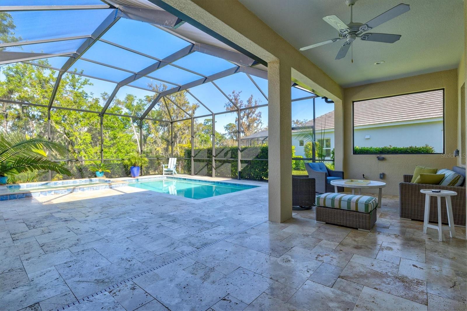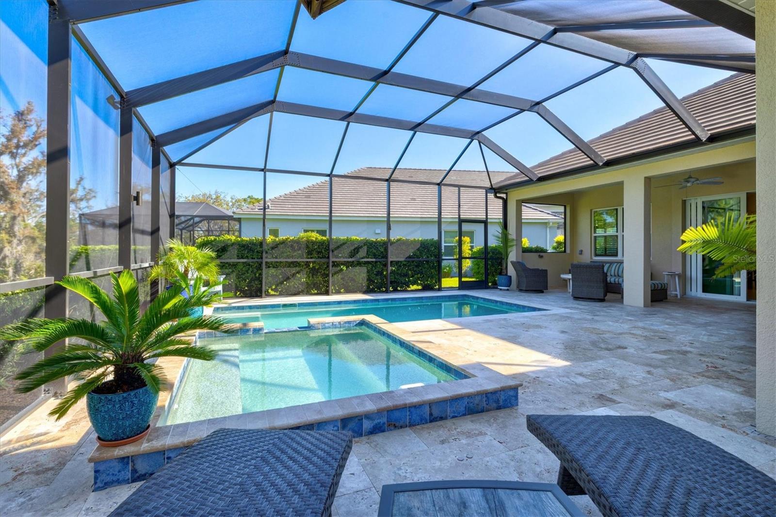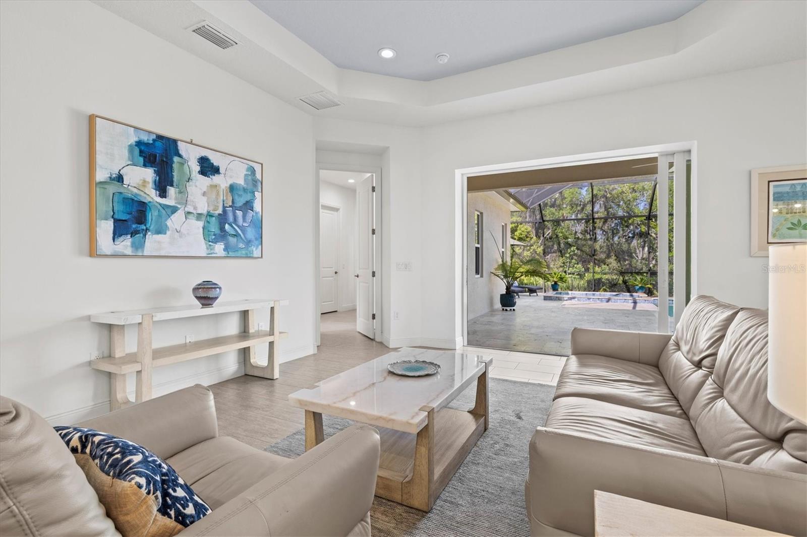 Experience a rare sense of privacy surrounded by tranquil nature as you unwind in your resort-style pool and spa on an expansive lanai designed for elevated outdoor living. This is your opportunity to live on the highly sought-after Ocean Blue Cove within Indigo. Nestled on an oversized cul-de-sac lot, this nearly new home offers modern Florida living in a serene setting. Built just three years ago, the open-concept design features a spacious great room with coffered ceilings, tile flooring throughout the main areas, and a seamless flow into a gourmet kitchen complete with a gas range, stacked microwave/oven, custom backsplash, quartz countertops, and upgraded finishes. The primary suite is a true retreat, showcasing coffered ceilings, an oversized bedroom, and a spa-inspired bath with dual sinks, a floor-to-ceiling tiled walk-in shower, and private water closet. Two additional bedrooms, a beautifully appointed guest bath, and a versatile den/office provide flexible living options. Additional highlights include hurricane impact windows, an extended epoxy-coated garage with built-in storage, and meticulously maintained upgrades throughout. Don’t miss your opportunity to own this exceptional property in one of the area’s most desirable communities.