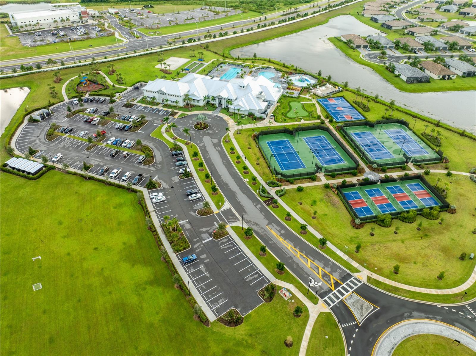 Welcome to this resort like community rich with amenities. This beautiful home has numerous upgrades. The great room has wood look tile floors and a coffered ceiling. The ship lap wainscoting features in the great room and carries through to the breakfast nook. This is a spacious open floor plan opening to the heated pool/spa. The kitchen has a beautiful expansive, light quartz island perfect for entertaining or gathering around to share a meal. Kitchen is equipped with a gas stove and stainless steel hooded exhaust to the ceiling. There is a cozy breakfast area off the kitchen. There is also a separate spacious dining room area. The community has many scenic lakes to enjoy walking and biking around and the central main large lake is stocked with fish for fishing. The community features a town center with full service restaurant, fitness center, gym, saunas, pickleball courts, tennis courts, sand volleyball, bocce ball courts, indoor basketball gym, resort pool, lap pool and splash pad. The HOA include lawn maintenance, irrigation, cable, internet, multiple gated entrances and security. Listing agent is owner